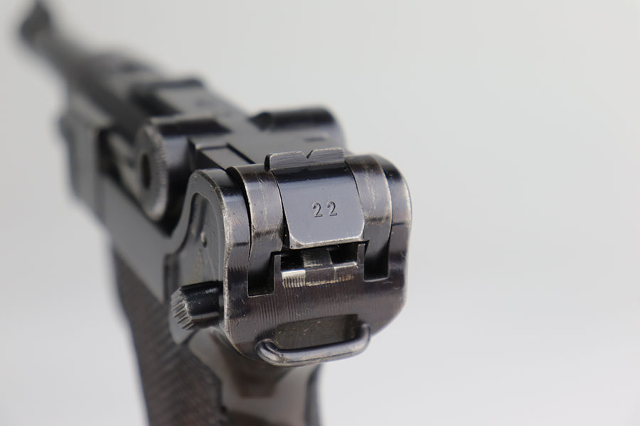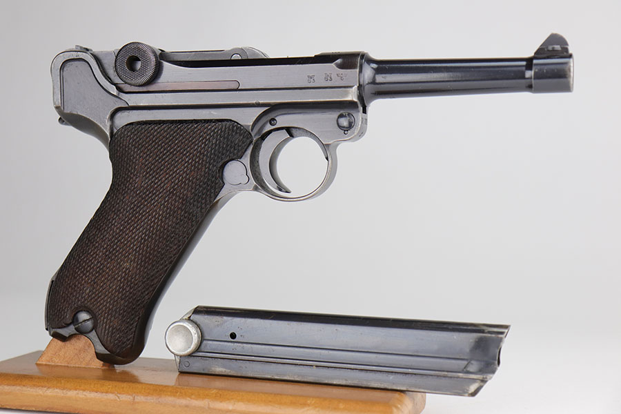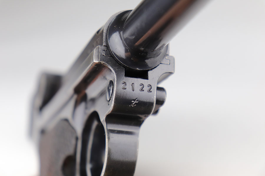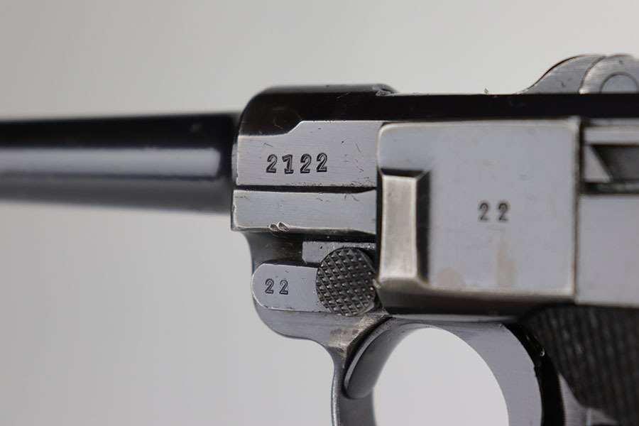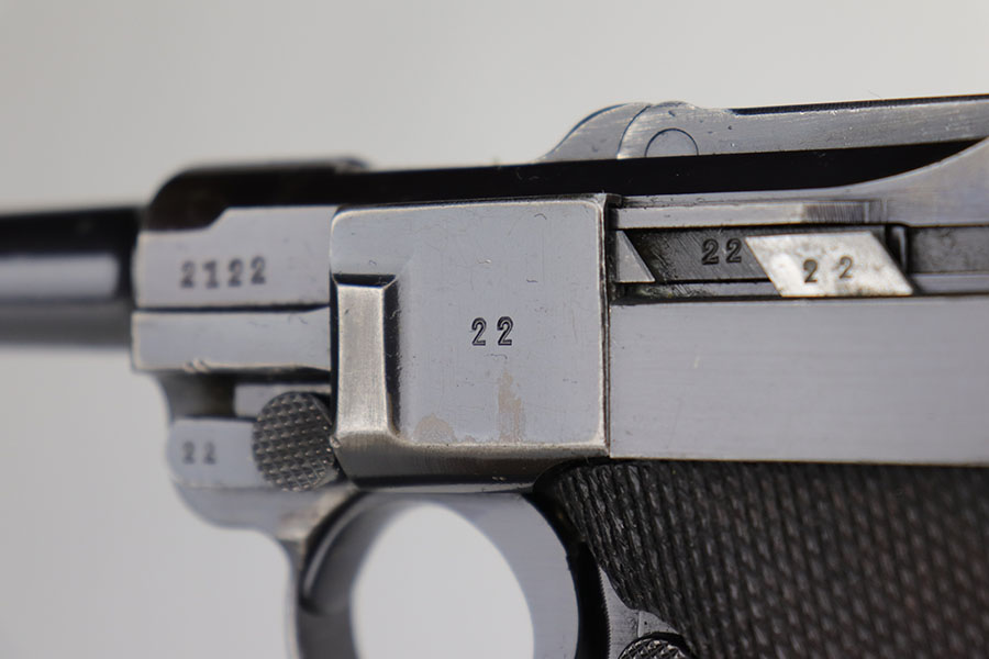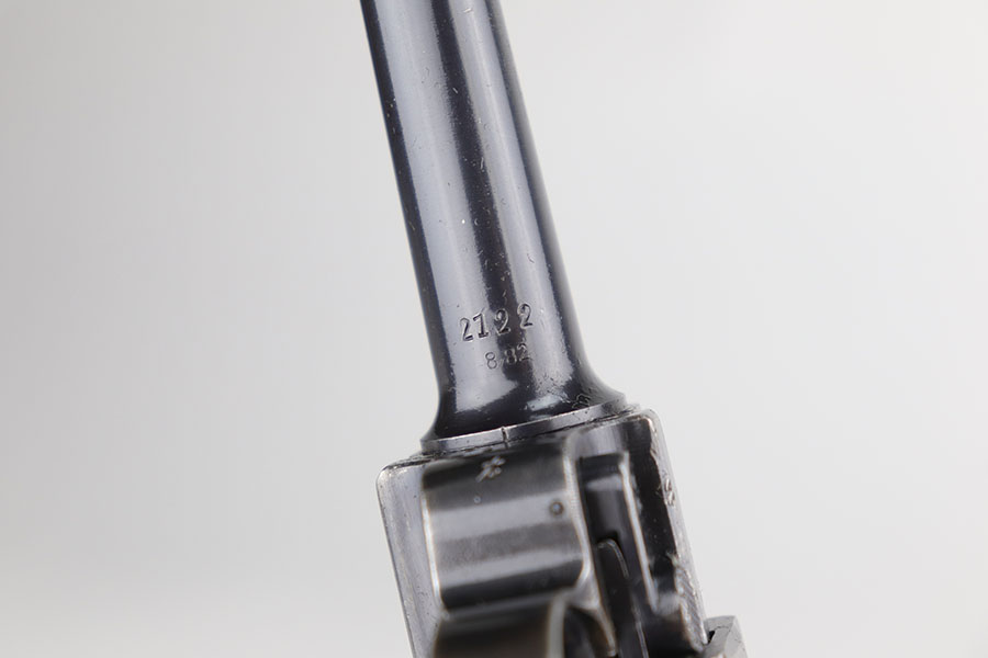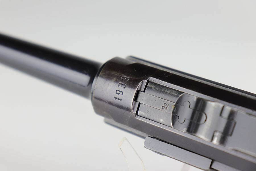 10/28/20 – This is a matching and original Nazi Mauser Luger from 1939. The pistol is all original, including the matching grips, but magazine is mismatched. The original blue rates at about 85-90% with minor finish loss on the muzzle and sideplate, and some patina throughout on the straps. Excellent bore. The grips are in great shape with no cracks or chips. Magazine has same inspectors stamp as receiver but mismatched number.
