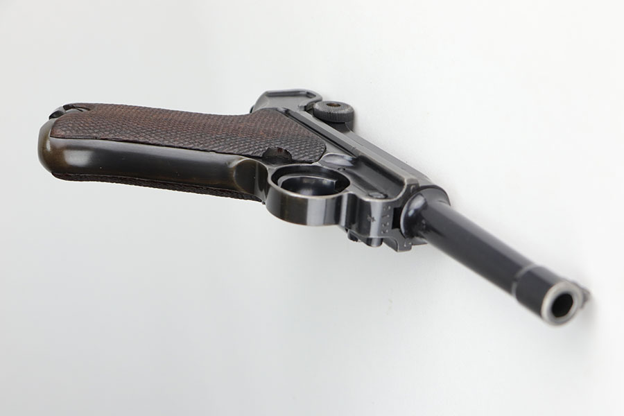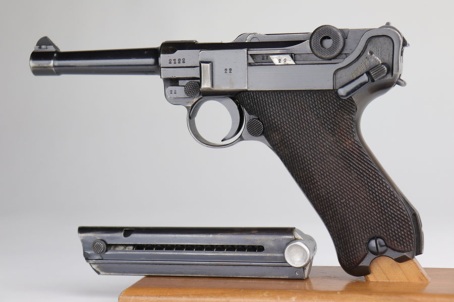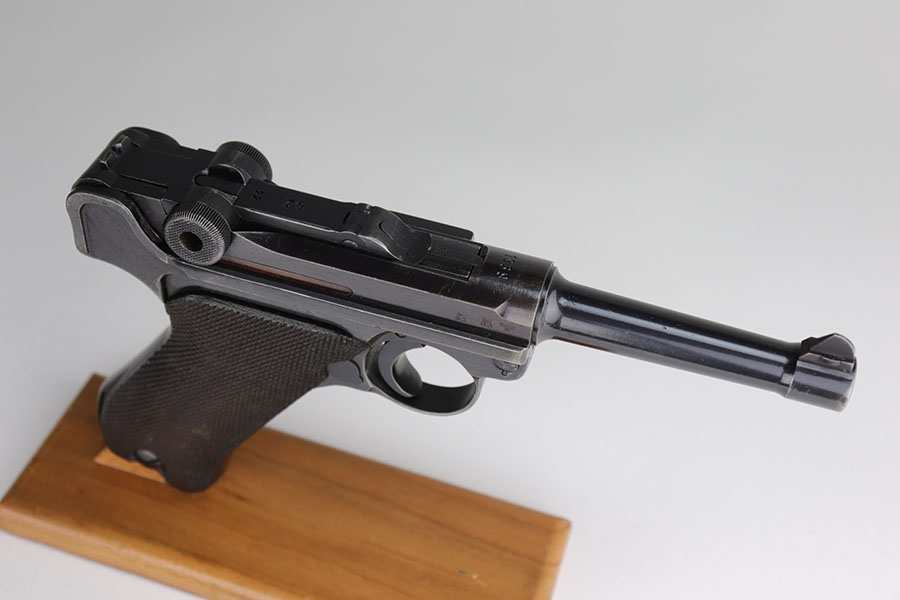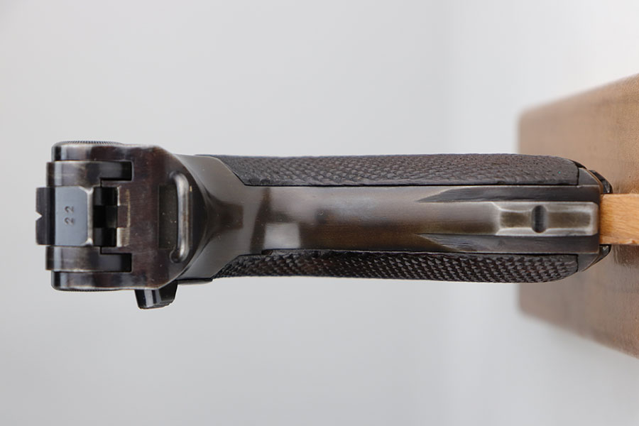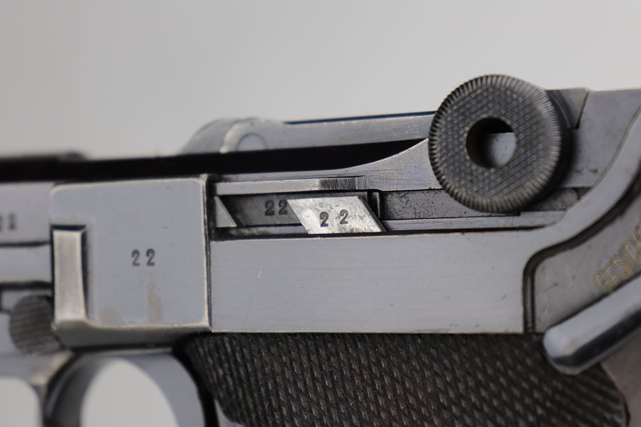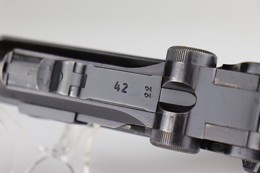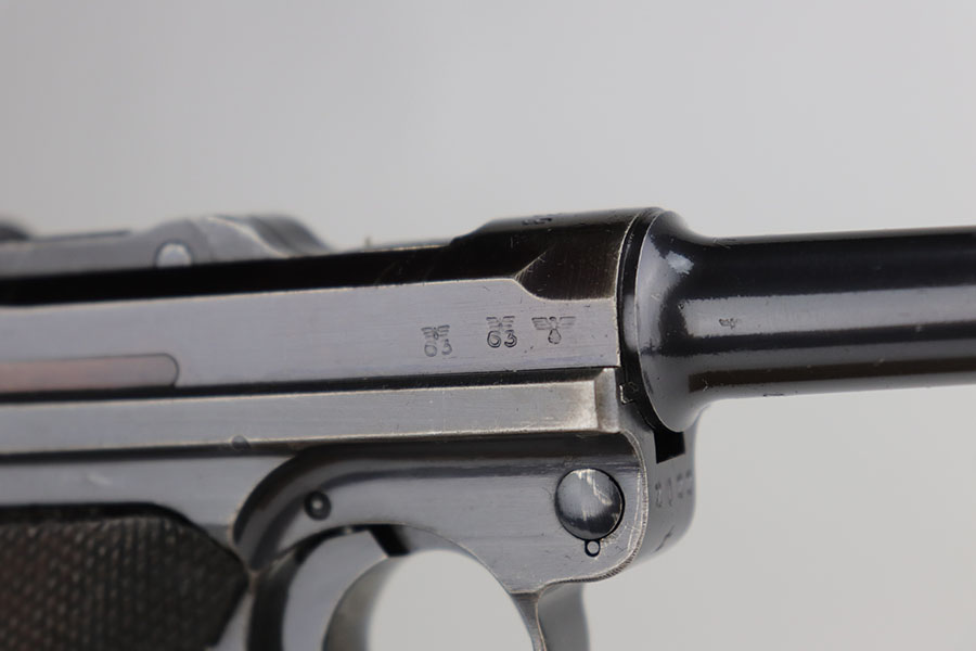 10/28/20 – This is a matching and original Nazi Mauser Luger from 1939. The pistol is all original, including the matching grips, but magazine is mismatched. The original blue rates at about 85-90% with minor finish loss on the muzzle and sideplate, and some patina throughout on the straps. Excellent bore. The grips are in great shape with no cracks or chips. Magazine has same inspectors stamp as receiver but mismatched number.