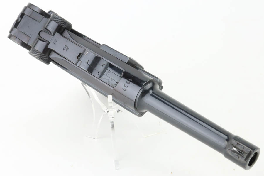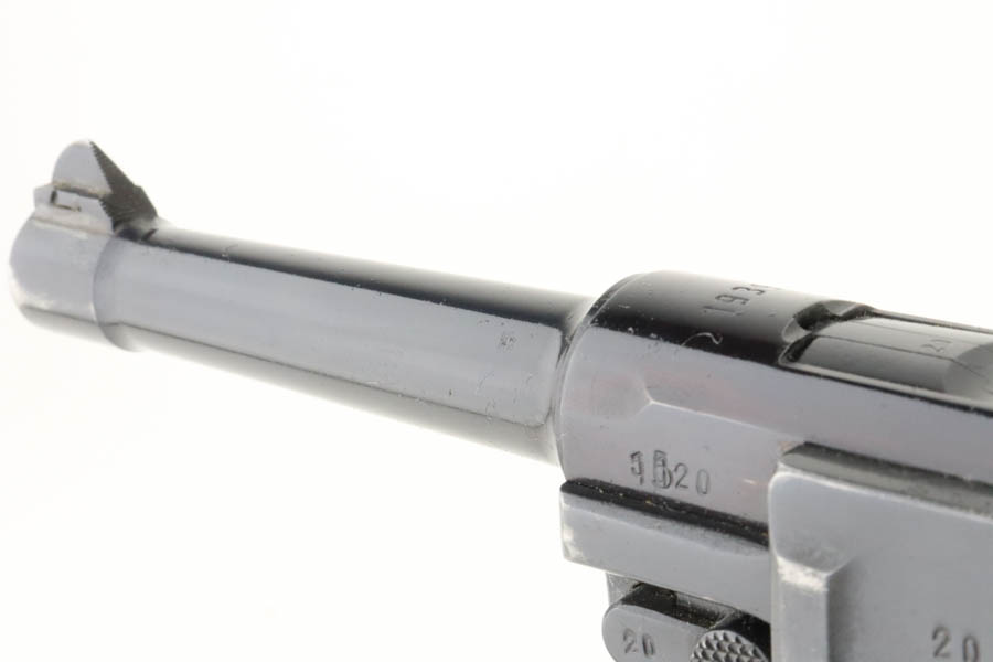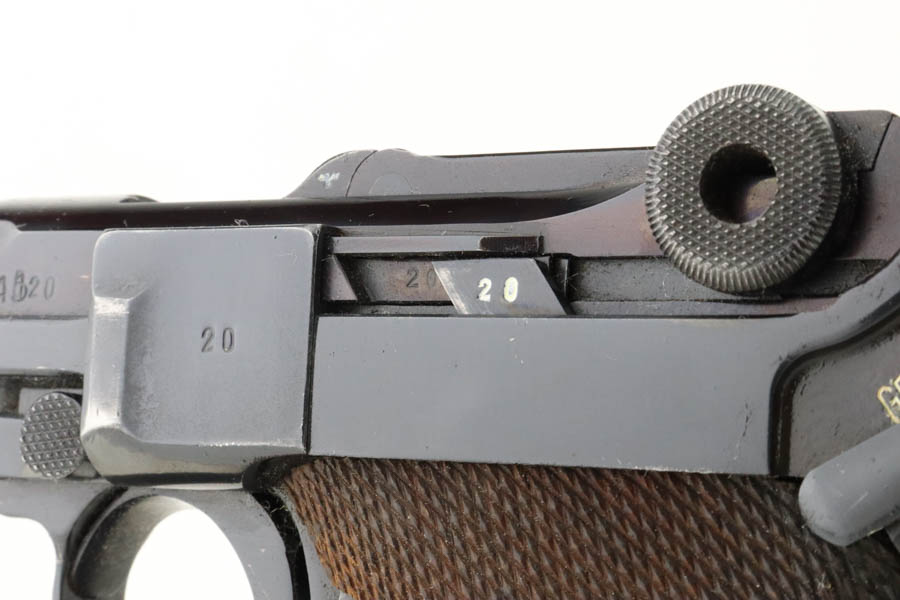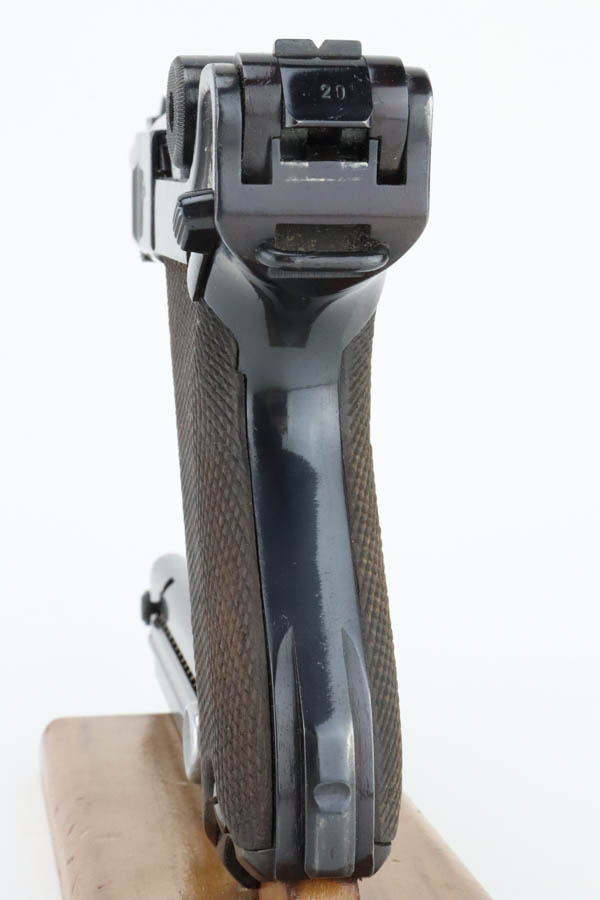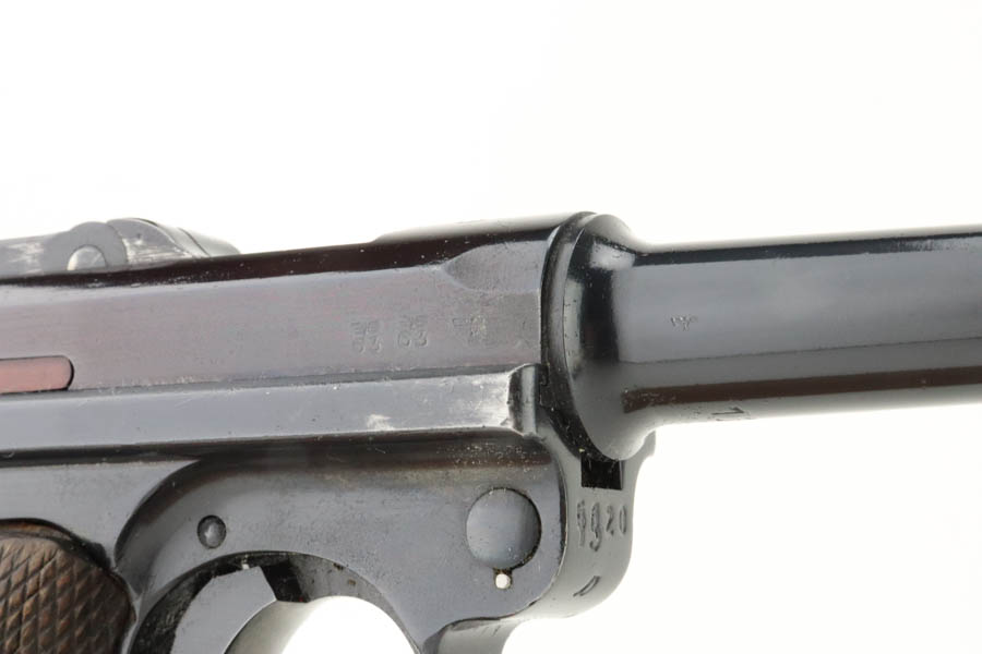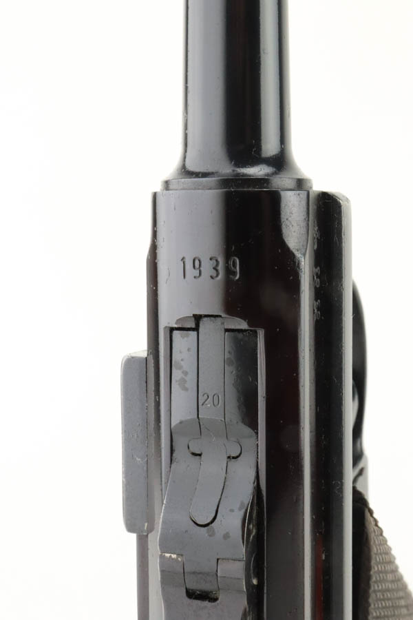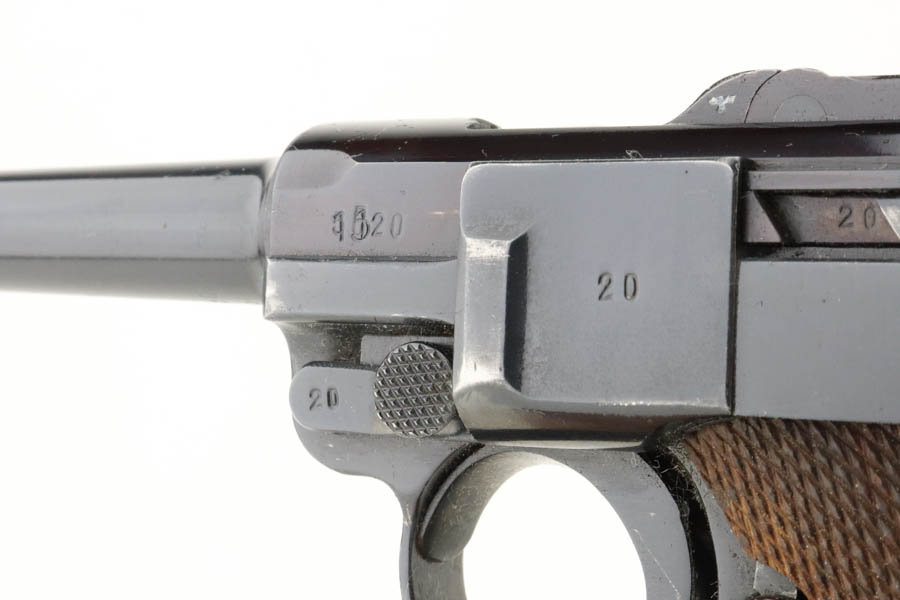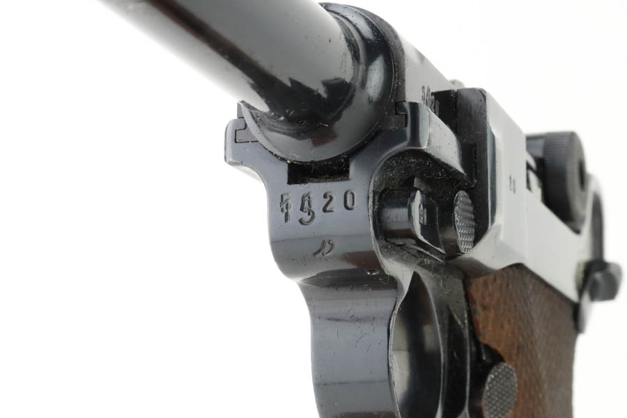 6/19/24 – This is a nice example of a Mauser Luger issued to the Nazi military in 1939. It is all matching, but the upper receiver and frame appear to have been re-numbered for some reason. It has the proper “Eagle 63” military acceptance proofs. The entire gun has been refinished, so there is very little bluing loss. Fitted with mismatched wood grips and comes with a mismatched “Eagle 63” magazine. The bore shows minor pitting and fouling in the grooves.