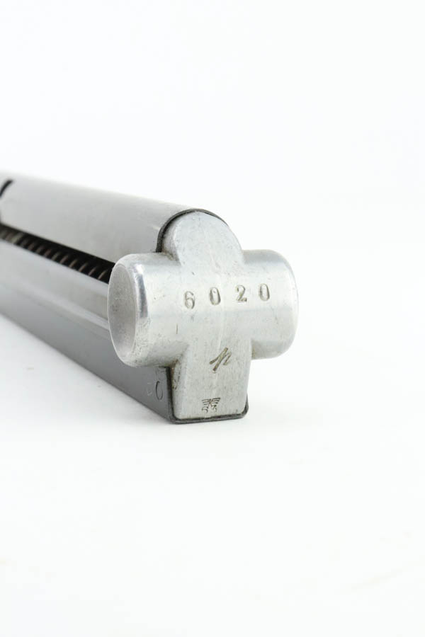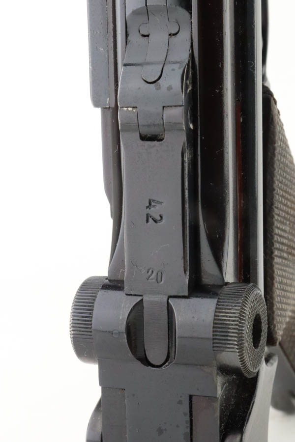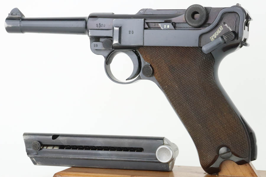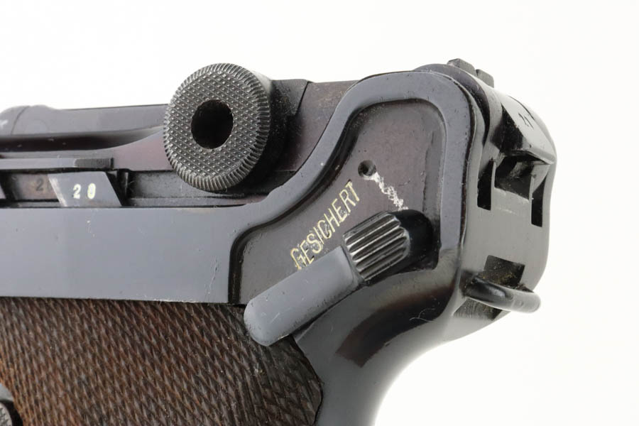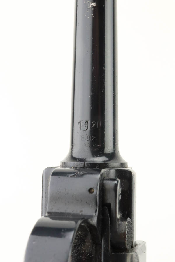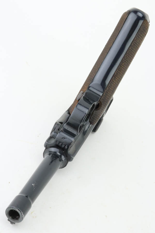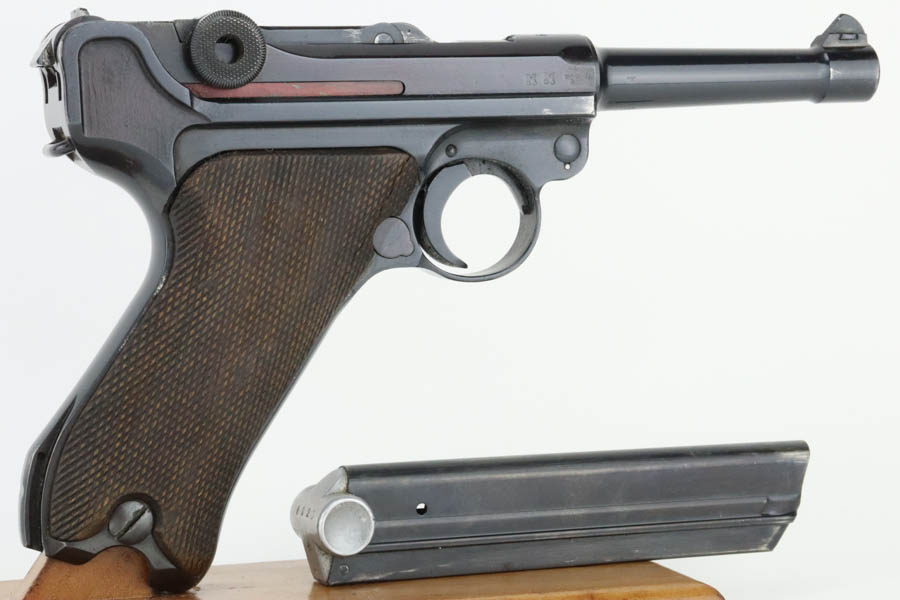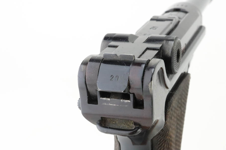6/19/24 – This is a nice example of a Mauser Luger issued to the Nazi military in 1939. It is all matching, but the upper receiver and frame appear to have been re-numbered for some reason. It has the proper “Eagle 63” military acceptance proofs. The entire gun has been refinished, so there is very little bluing loss. Fitted with mismatched wood grips and comes with a mismatched “Eagle 63” magazine. The bore shows minor pitting and fouling in the grooves.