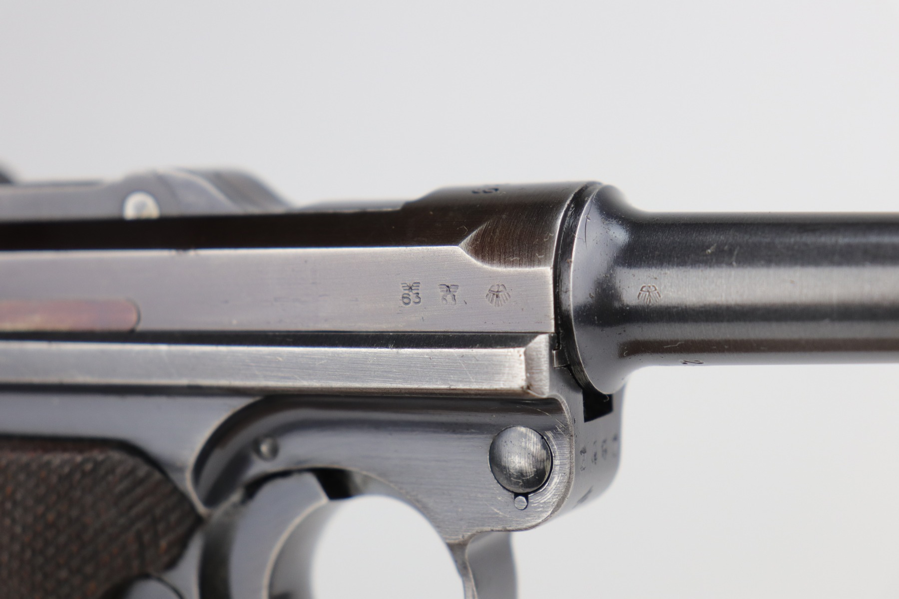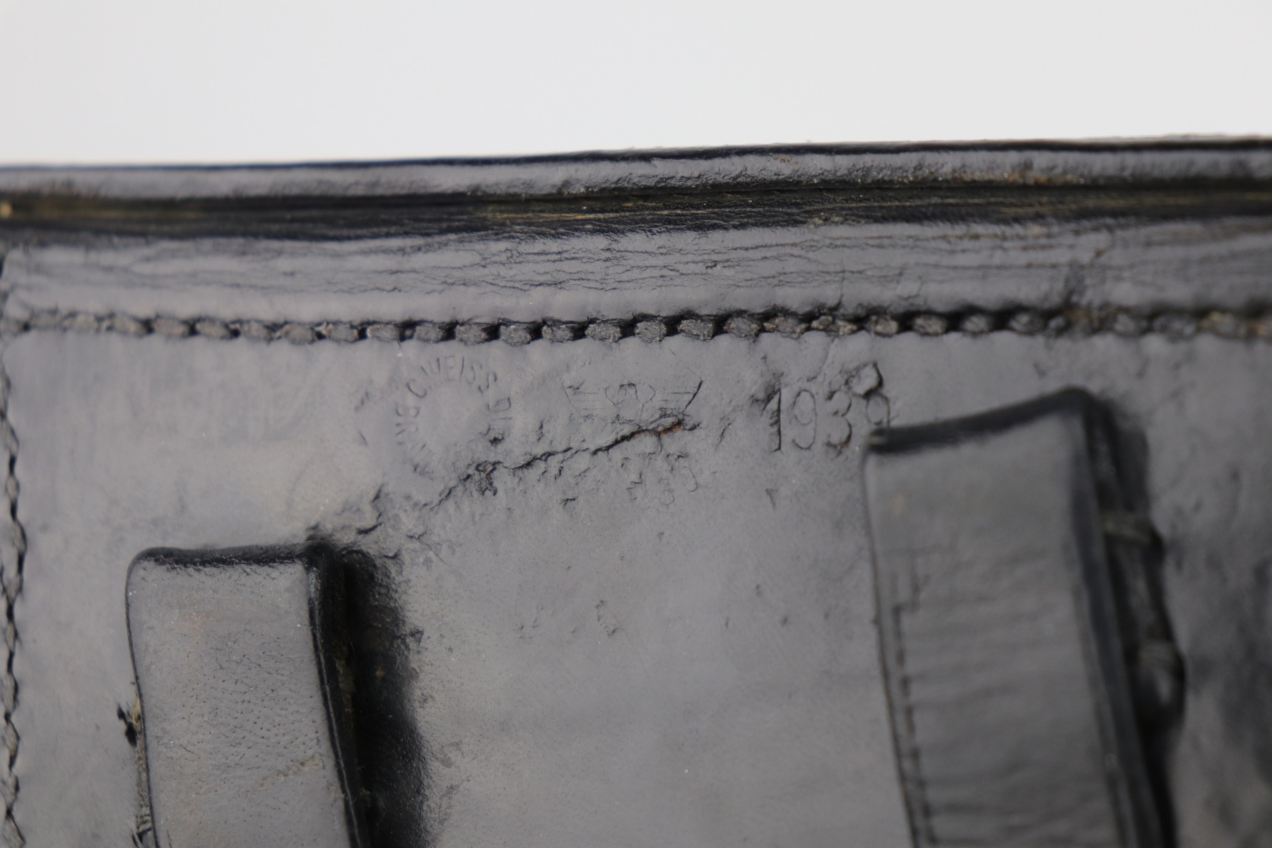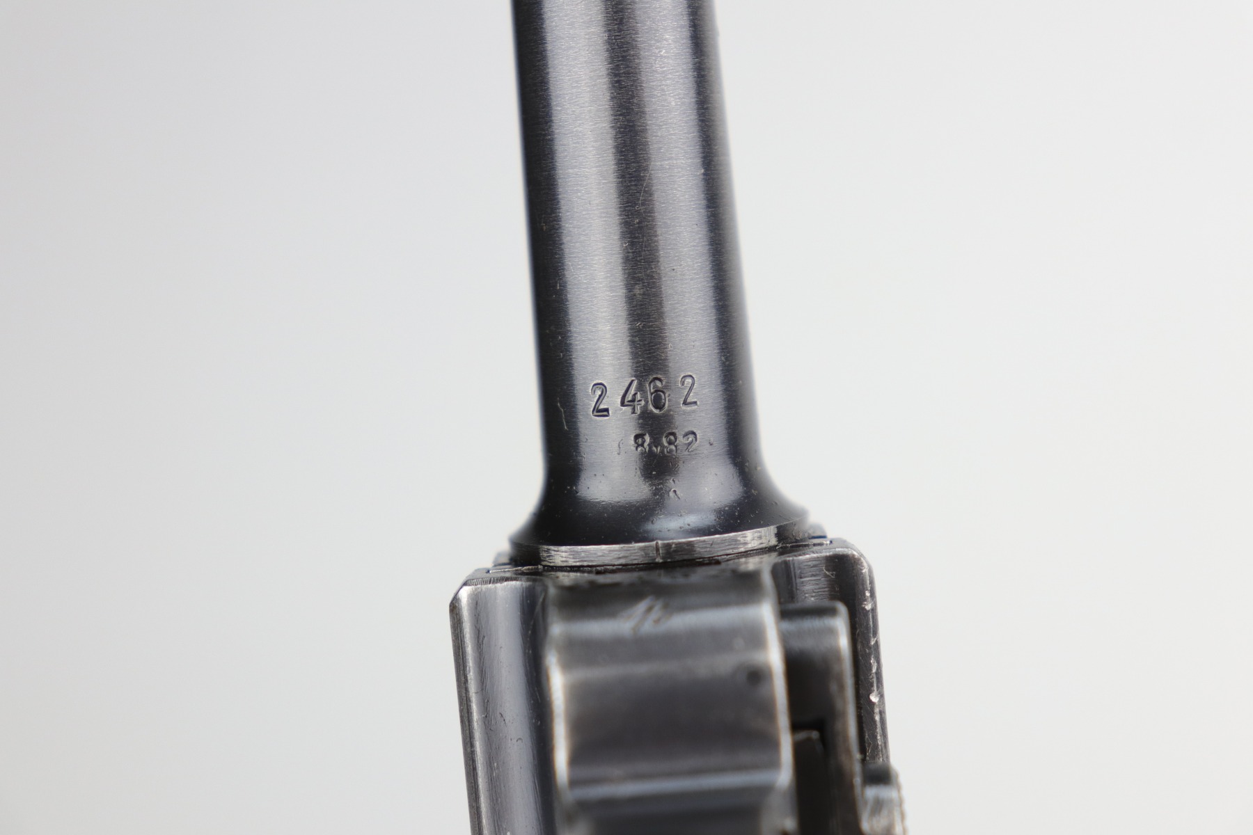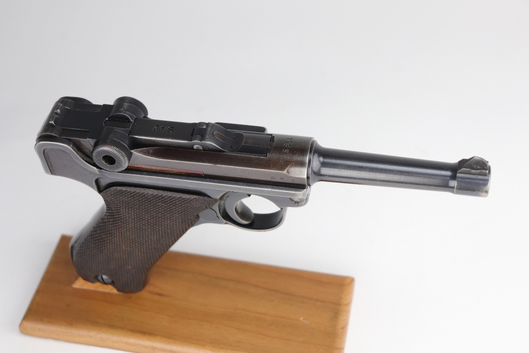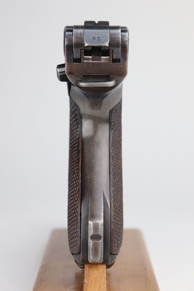 9/9/20 – This is a Mauser Luger Rig issued to the Nazi military in 1939. The chamber is dated 1939, and the toggle has the “S/42” Mauser factory code. The gun is all matching and functions well. The right side of the slide has the proper “Eagle 63” Nazi military proofs. Excellent, unnumbered wood grips. It comes with a period-correct mismatched luger magazine. The mag bottom is stamped “Eagle 63”. This gun has retained roughly 70-75% of its original bluing. This gun is a little difficult to rate because much of the finish looks thin but it could just be dulling rather than actual finish loss. In any case, there is muzzle wear, wear on the side plate, and thinning on both straps. Generally, there is minor wear on the high edges of the frame and slide. The bore has decent rifling, but there is minor pin-pricking throughout. Included in the rig is a very nice, waffenamt, 1939-dated, black leather holster and an unmarked luger tool.