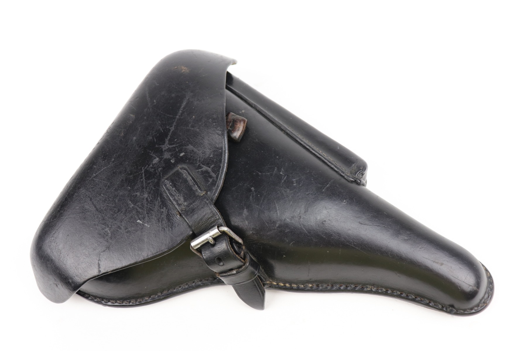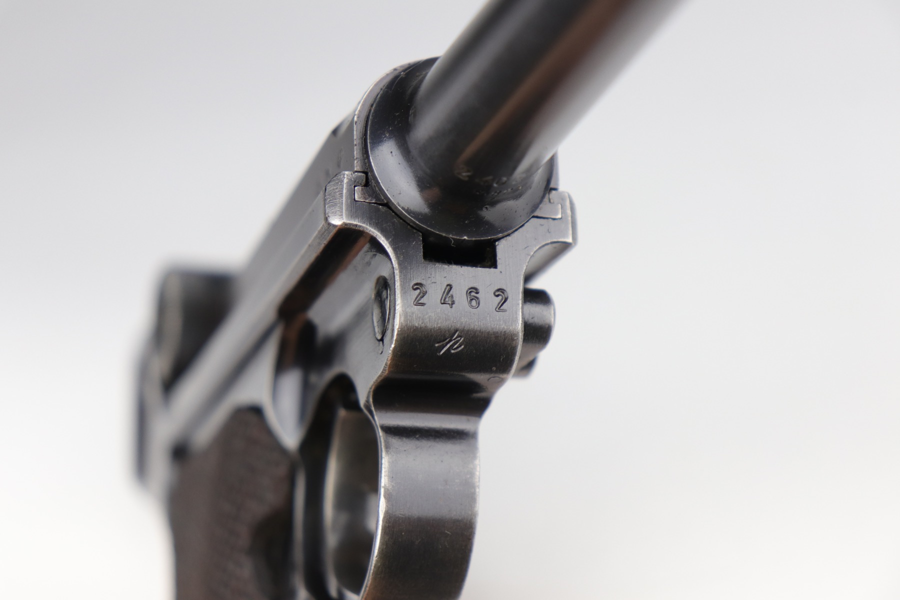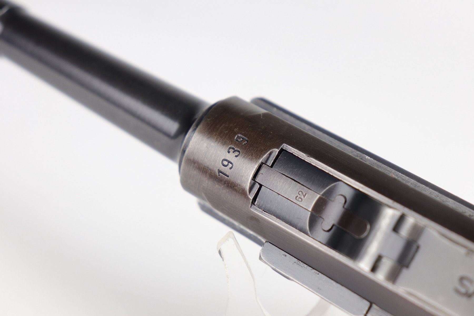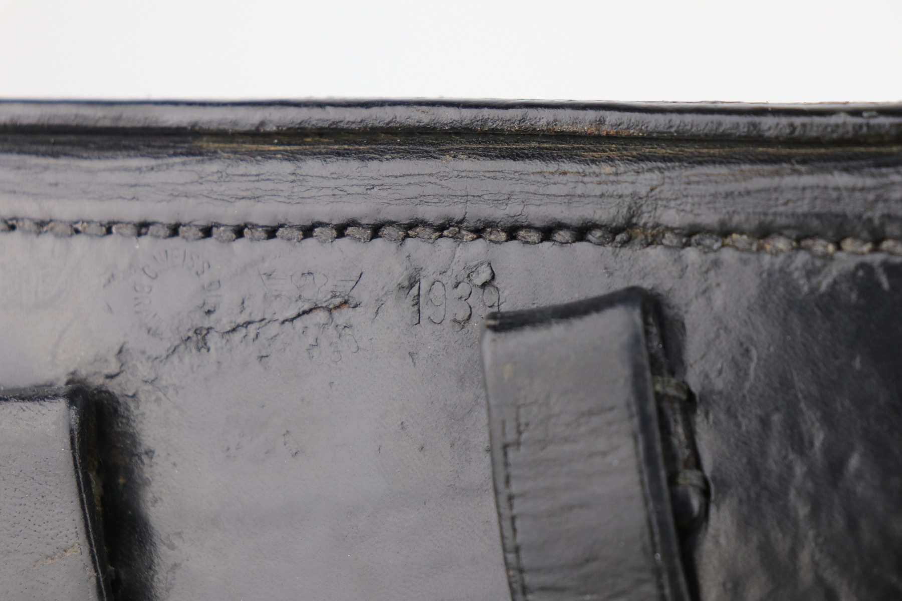 9/9/20 – This is a Mauser Luger Rig issued to the Nazi military in 1939. The chamber is dated 1939, and the toggle has the “S/42” Mauser factory code. The gun is all matching and functions well. The right side of the slide has the proper “Eagle 63” Nazi military proofs. Excellent, unnumbered wood grips. It comes with a period-correct mismatched luger magazine. The mag bottom is stamped “Eagle 63”. This gun has retained roughly 70-75% of its original bluing. This gun is a little difficult to rate because much of the finish looks thin but it could just be dulling rather than actual finish loss. In any case, there is muzzle wear, wear on the side plate, and thinning on both straps. Generally, there is minor wear on the high edges of the frame and slide. The bore has decent rifling, but there is minor pin-pricking throughout. Included in the rig is a very nice, waffenamt, 1939-dated, black leather holster and an unmarked luger tool.