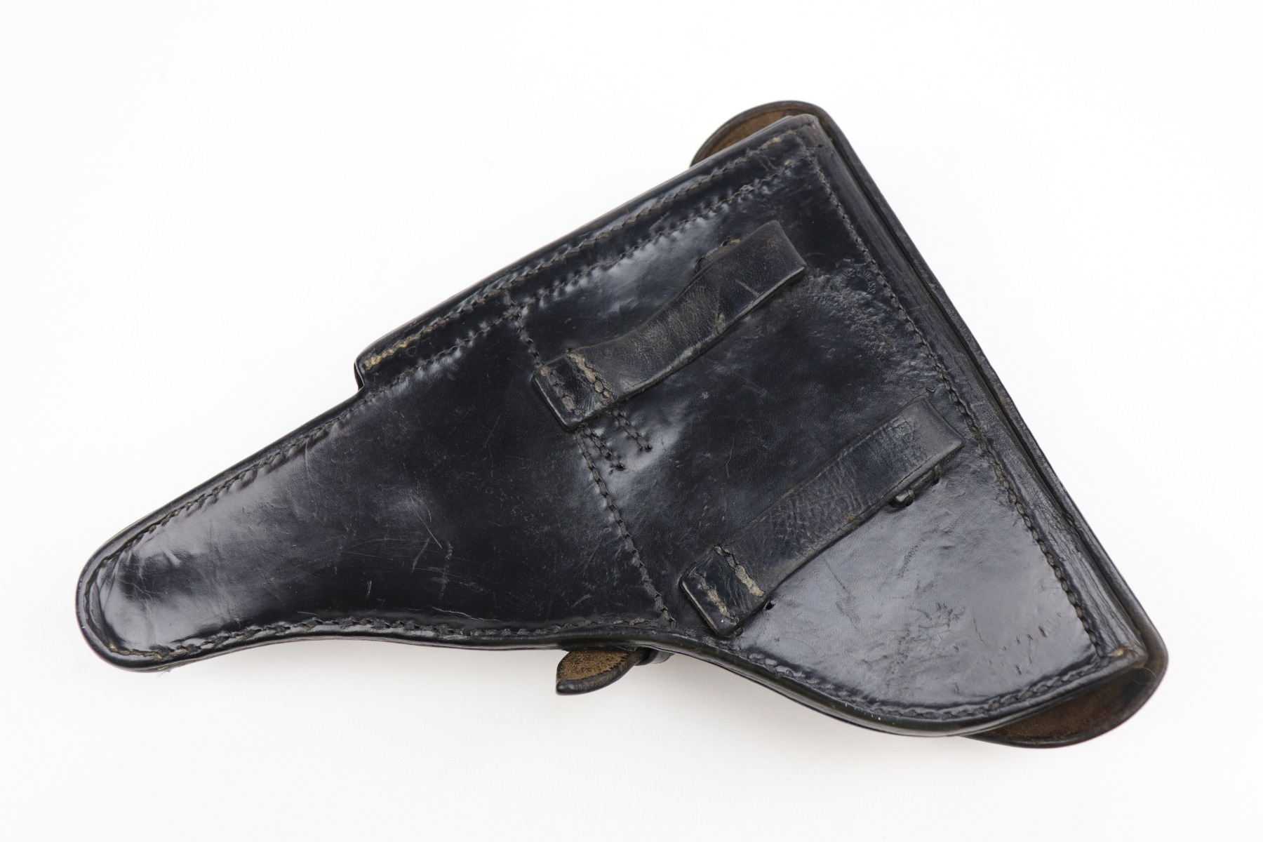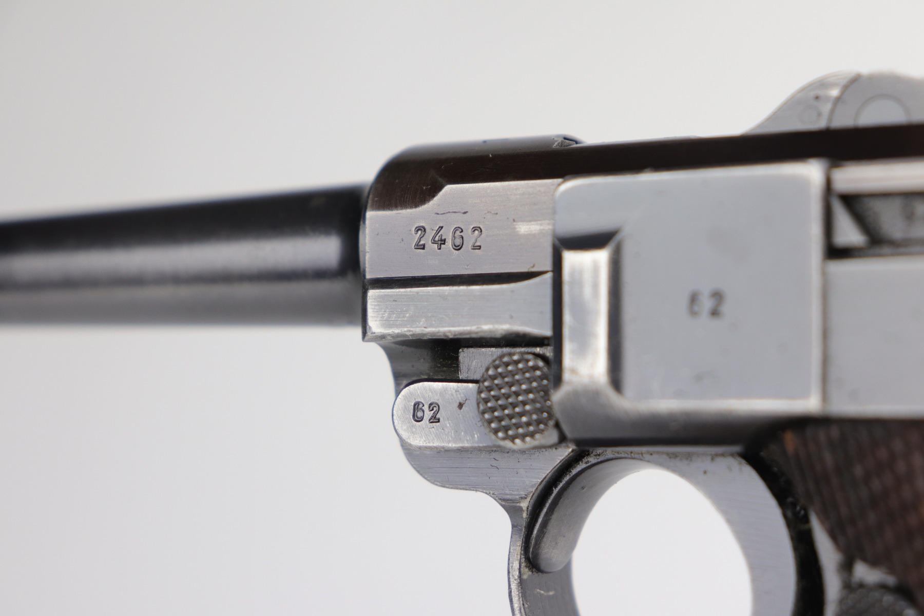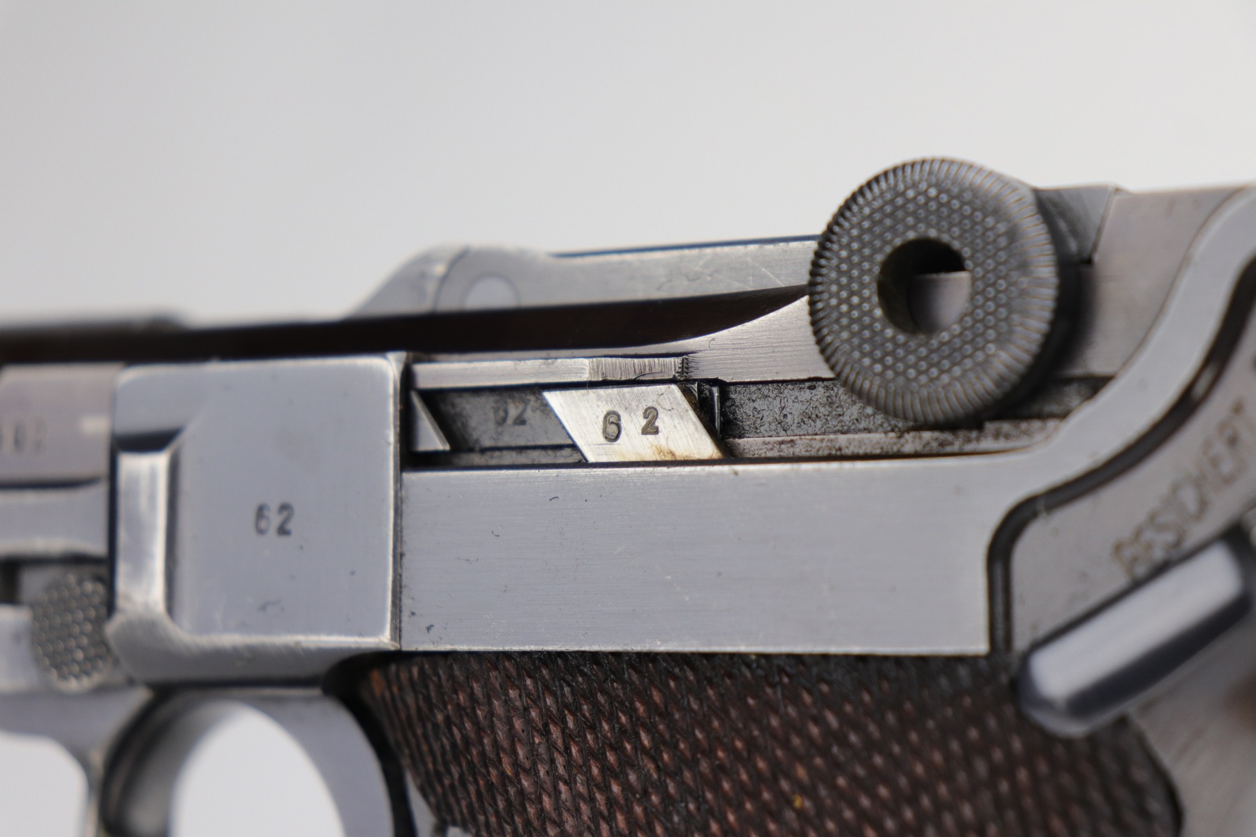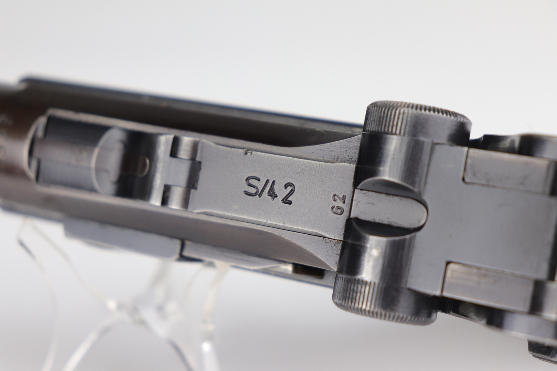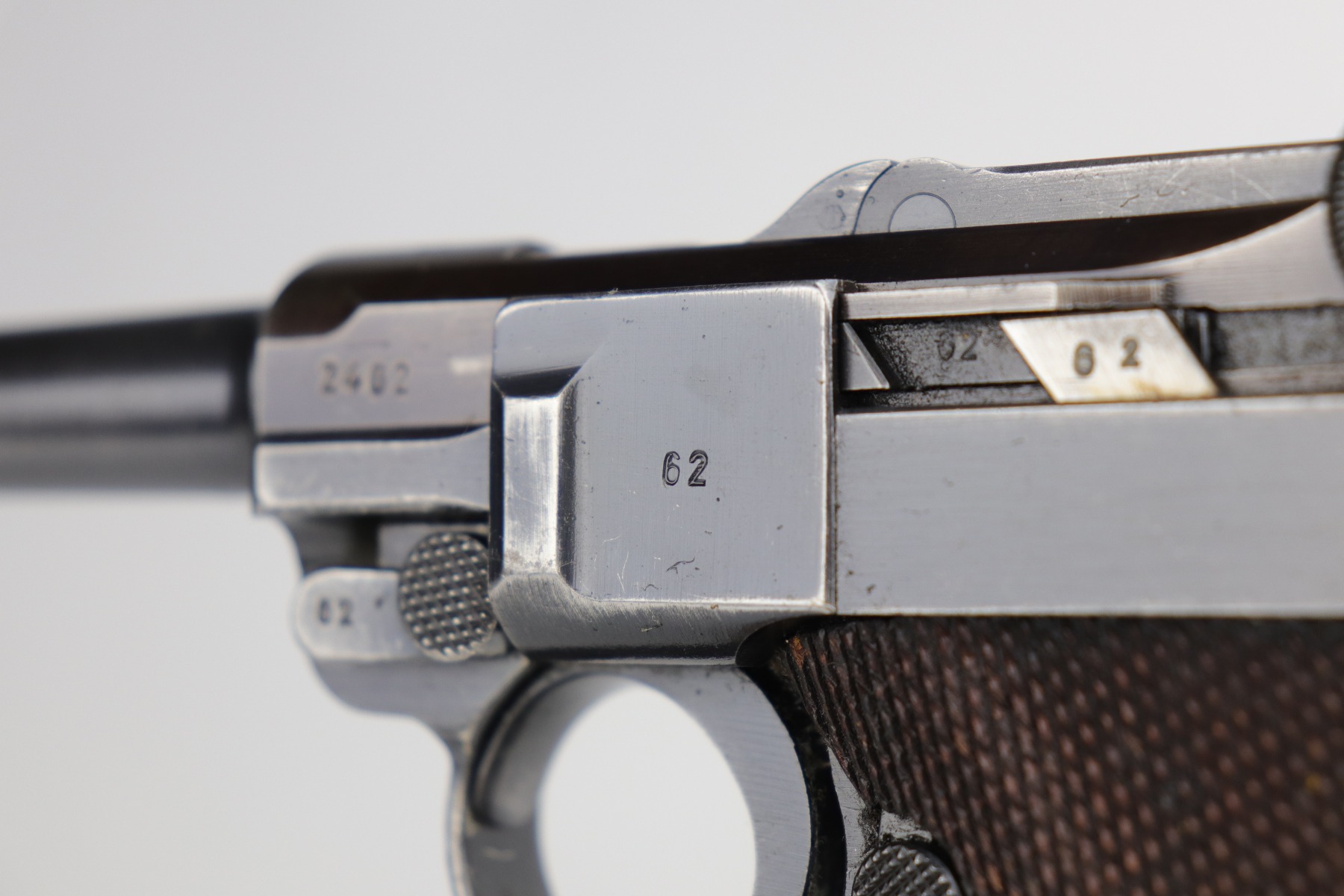 9/9/20 – This is a Mauser Luger Rig issued to the Nazi military in 1939. The chamber is dated 1939, and the toggle has the “S/42” Mauser factory code. The gun is all matching and functions well. The right side of the slide has the proper “Eagle 63” Nazi military proofs. Excellent, unnumbered wood grips. It comes with a period-correct mismatched luger magazine. The mag bottom is stamped “Eagle 63”. This gun has retained roughly 70-75% of its original bluing. This gun is a little difficult to rate because much of the finish looks thin but it could just be dulling rather than actual finish loss. In any case, there is muzzle wear, wear on the side plate, and thinning on both straps. Generally, there is minor wear on the high edges of the frame and slide. The bore has decent rifling, but there is minor pin-pricking throughout. Included in the rig is a very nice, waffenamt, 1939-dated, black leather holster and an unmarked luger tool.