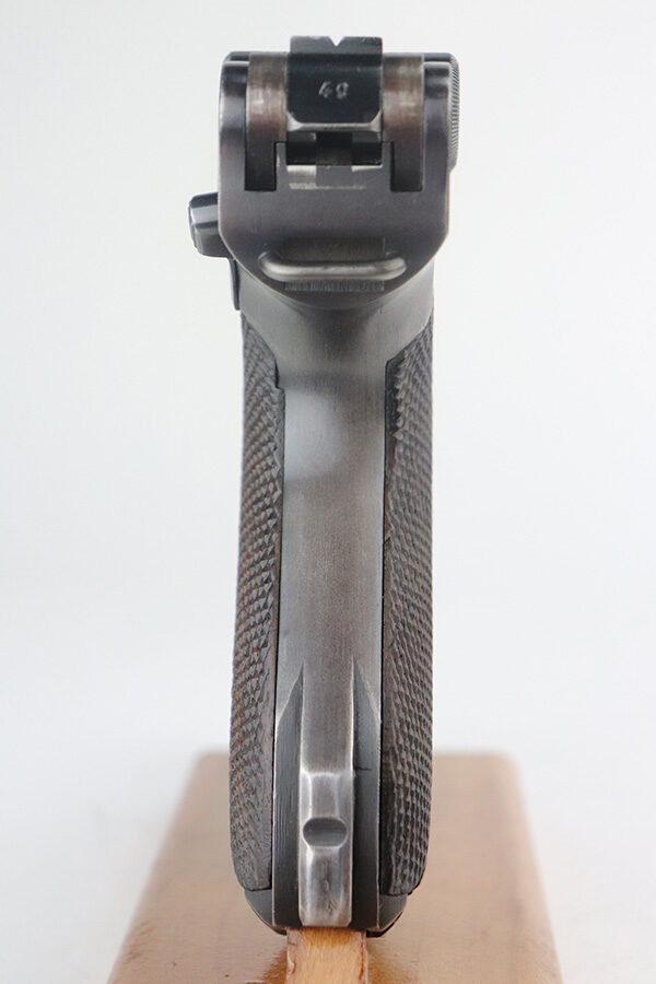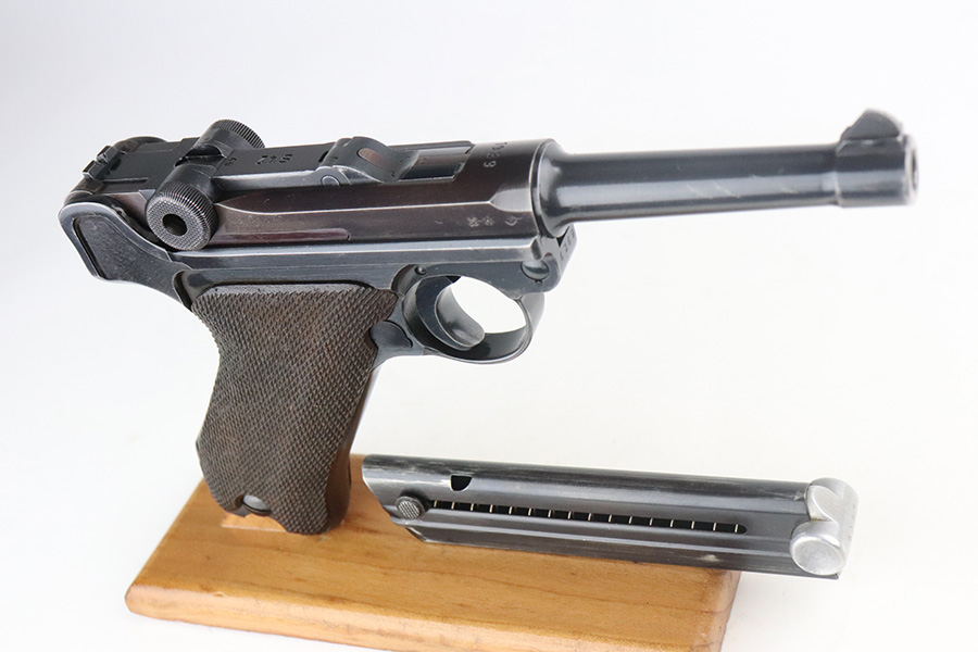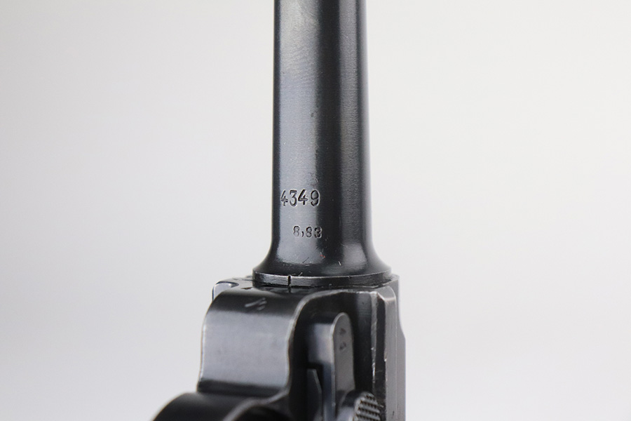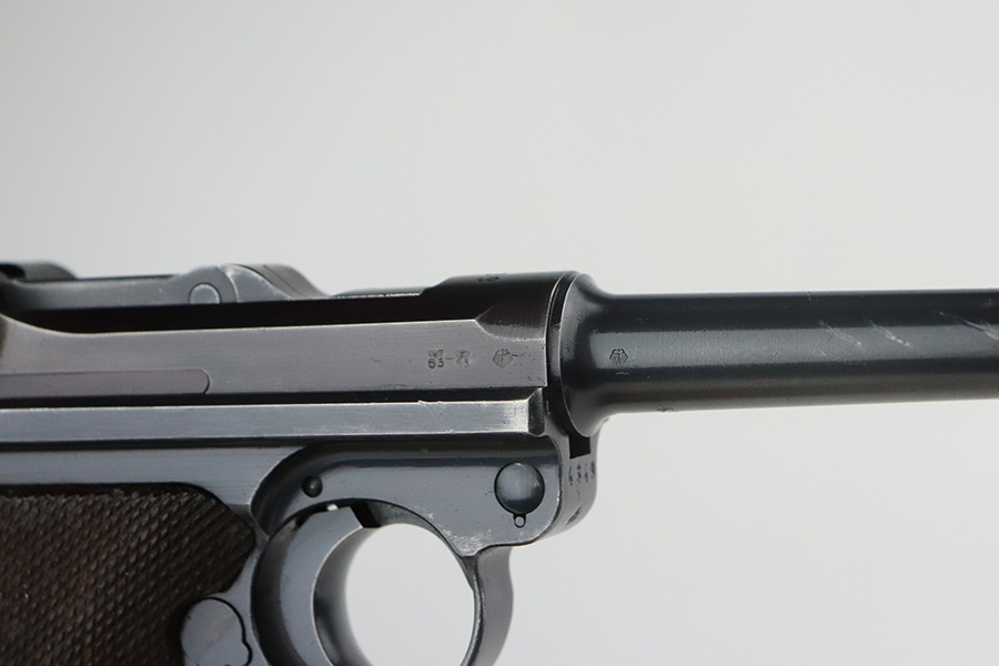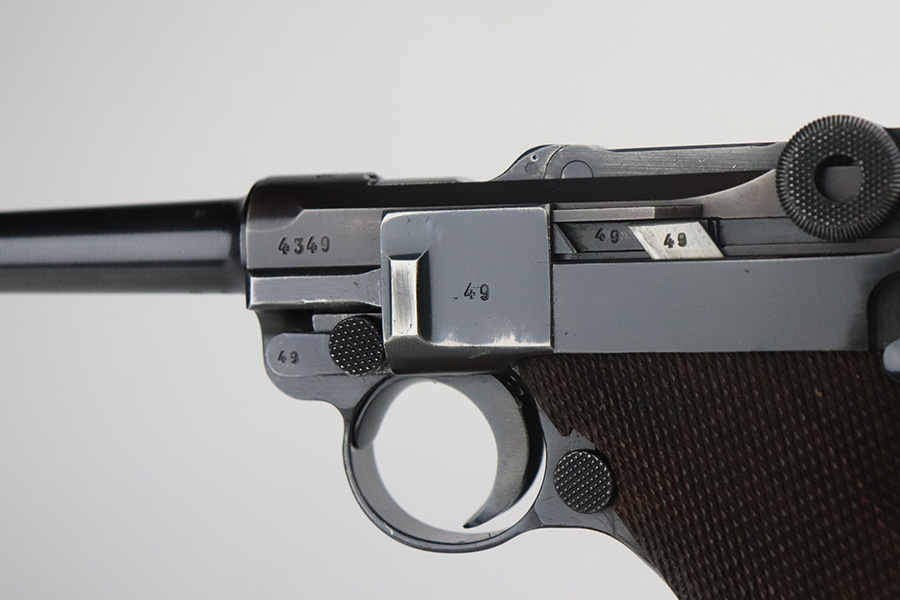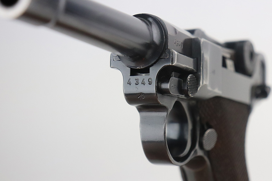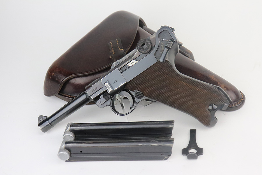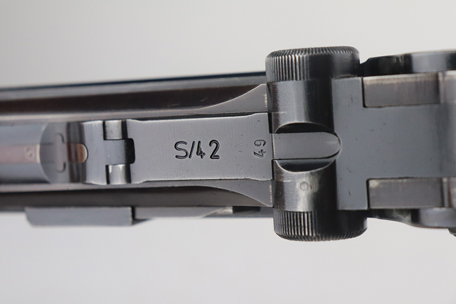 7/13/21 – This is a very nice example of a Mauser Luger rig issued to the Nazi military in 1939. It is all matching and has the proper “Eagle 63” military proofs. It’s also a four digit date, S/42 code example, which is significantly less common than the standard ’42’ code production. Fewer than 40,000 produced, as compared to nearly 90,000 with ’42’ code. It comes with a minty 1938-dated waffen proofed holster, an “Eagle 63” tool, and two original matching magazines. The gun has retained about 91-92% of its original finish. There is minor thinning on both straps and areas of minor wear on the side plate, side rails, around the chamber, and around the muzzle. A few noticeable scratches on the barrel. Comes with excellent un-numbered grips. The bore has great rifling with minor pin-pricking throughout.