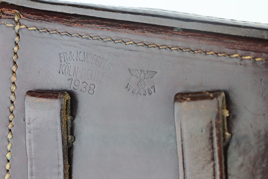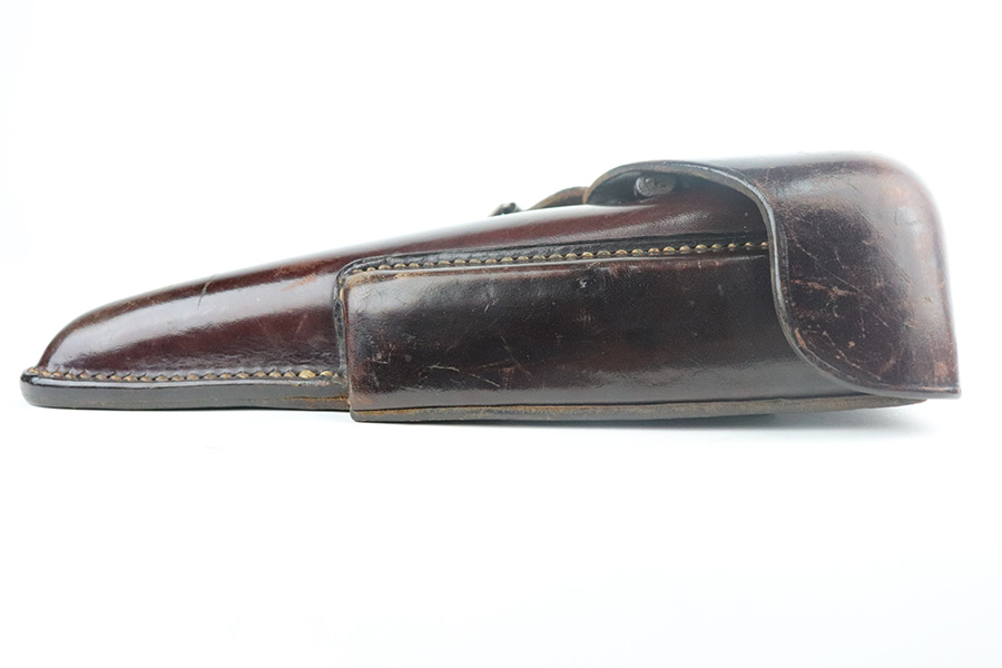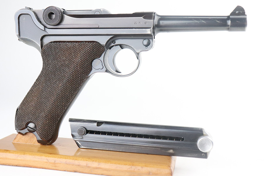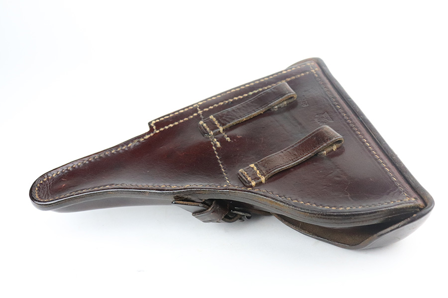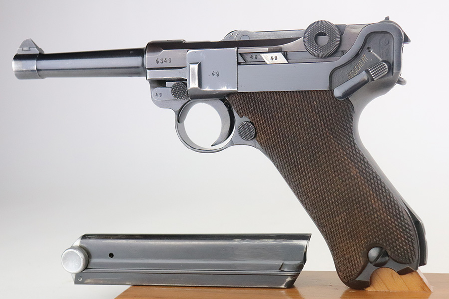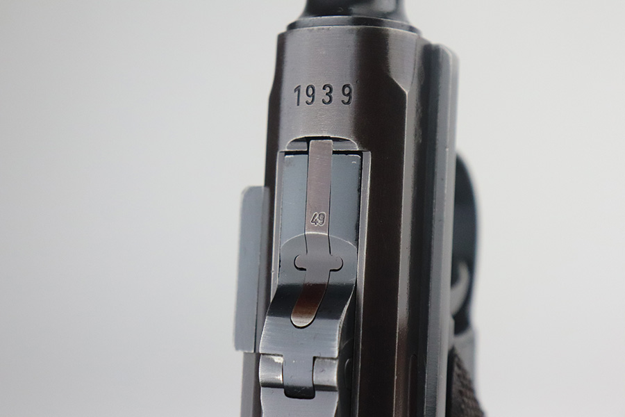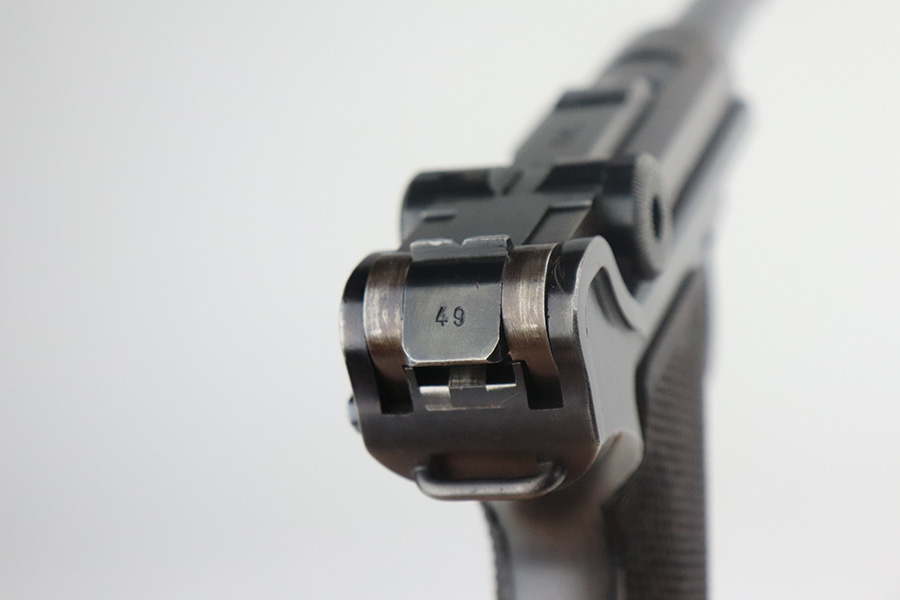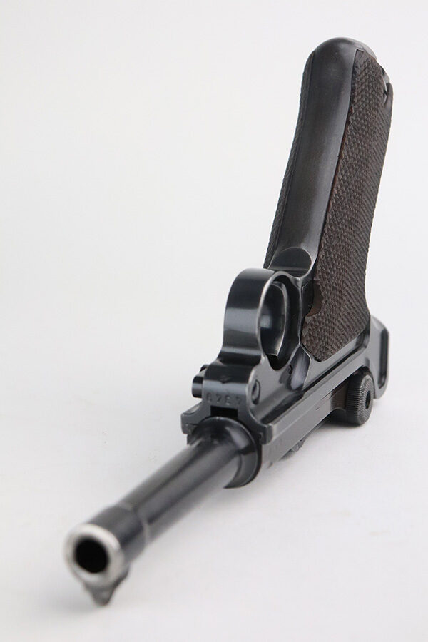 7/13/21 – This is a very nice example of a Mauser Luger rig issued to the Nazi military in 1939. It is all matching and has the proper “Eagle 63” military proofs. It’s also a four digit date, S/42 code example, which is significantly less common than the standard ’42’ code production. Fewer than 40,000 produced, as compared to nearly 90,000 with ’42’ code. It comes with a minty 1938-dated waffen proofed holster, an “Eagle 63” tool, and two original matching magazines. The gun has retained about 91-92% of its original finish. There is minor thinning on both straps and areas of minor wear on the side plate, side rails, around the chamber, and around the muzzle. A few noticeable scratches on the barrel. Comes with excellent un-numbered grips. The bore has great rifling with minor pin-pricking throughout.