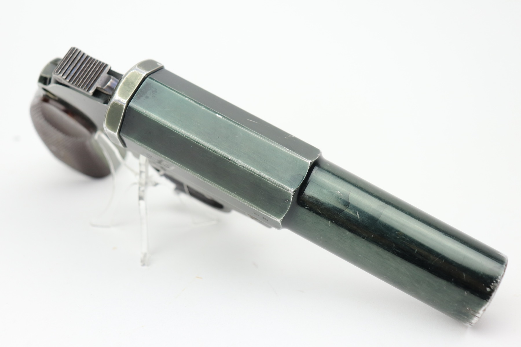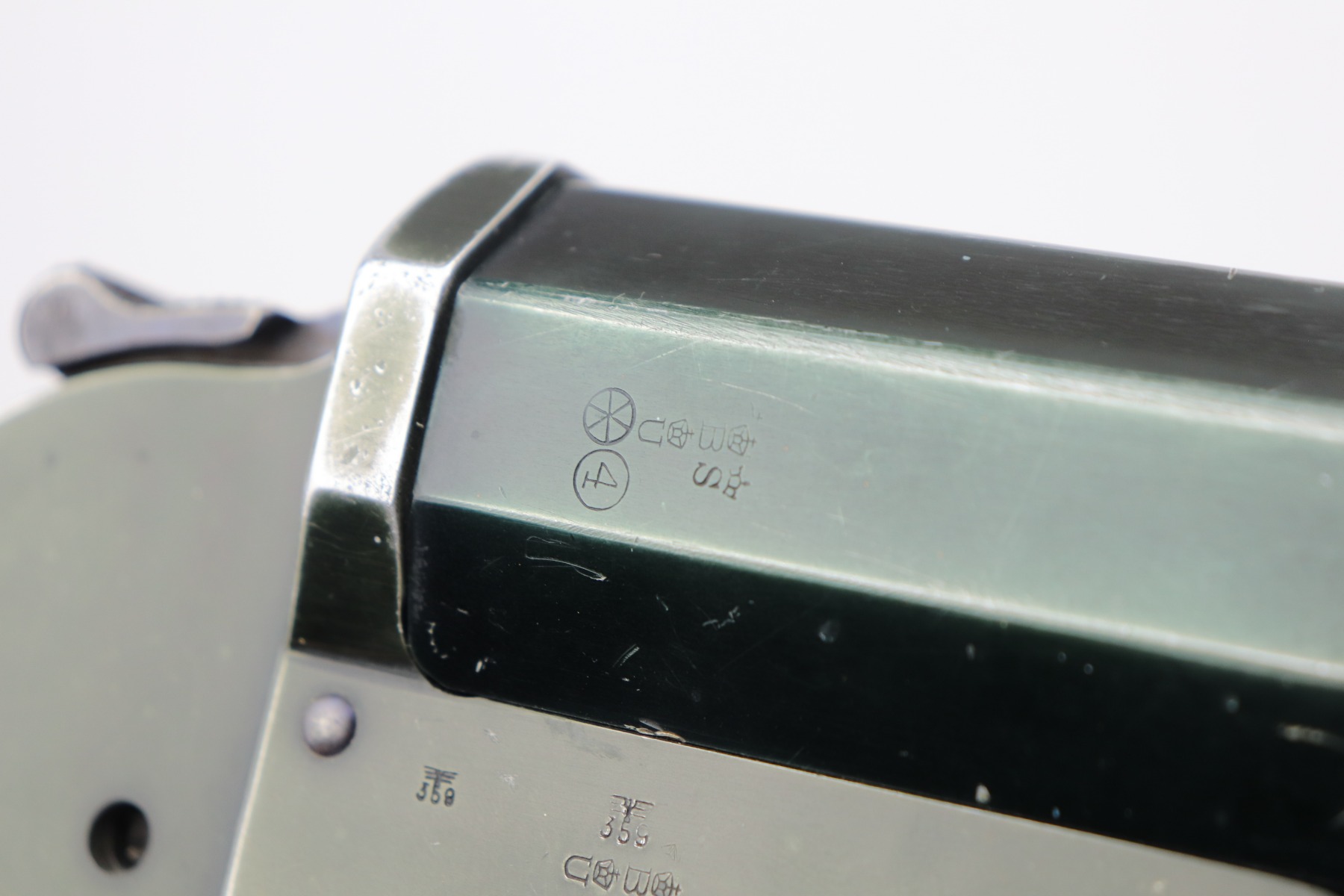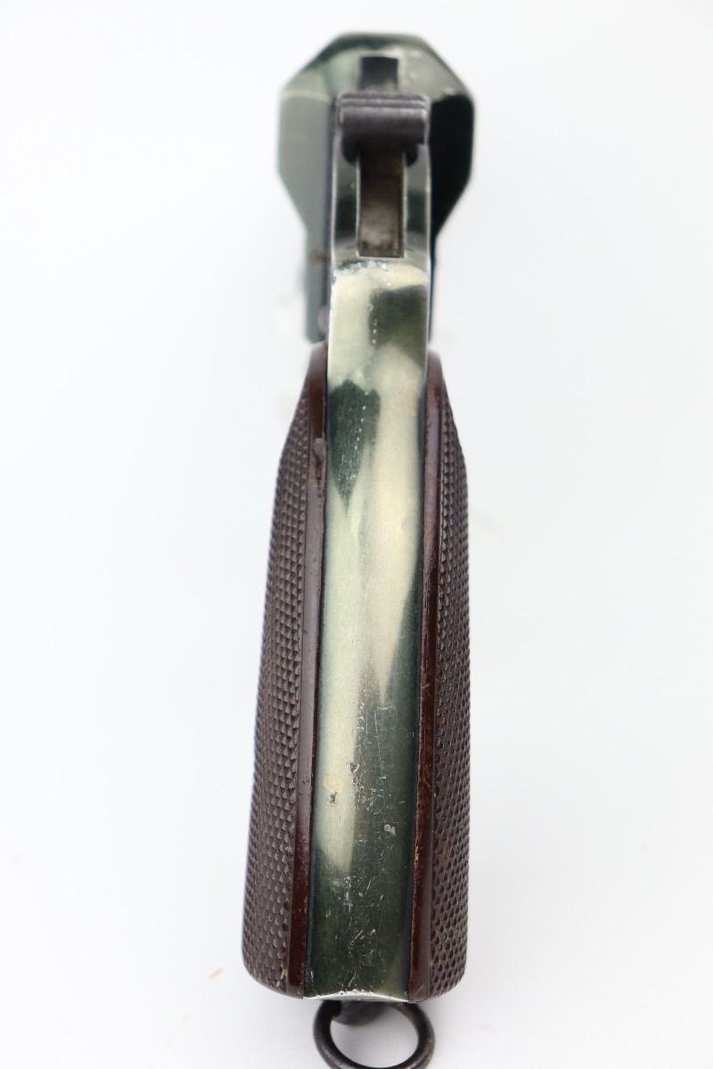 4/29/21 – This is a nice Pre-WW2 Walther LP 34 Flare Pistol with an interesting history. It was manufactured in 1939, and from the looks of it, may have been originally sold in the commercial market. There are waffen proofs throughout, indicating it was issued to the Nazi military at some point. It also has “Crown B U and S” proofs on the frame and barrel. From research, these are post-war East German proofs, so it likely ended up there after the war. All serial numbers match. It has retained roughly 65% of its greenish anodized finish. There are areas of scratchy wear throughout. Noticeable wear around the muzzle, high edges in general, and thinning on the straps. There is an area of wear on the left side of the frame where there is a series of numbers lightly scratched into the metal. The same numbers are scratched onto the underside of the barrel. Some splotchy discoloration on the left side of the frame. Comes with excellent bakelite grips. The bore is shiny with some very light scratching throughout.