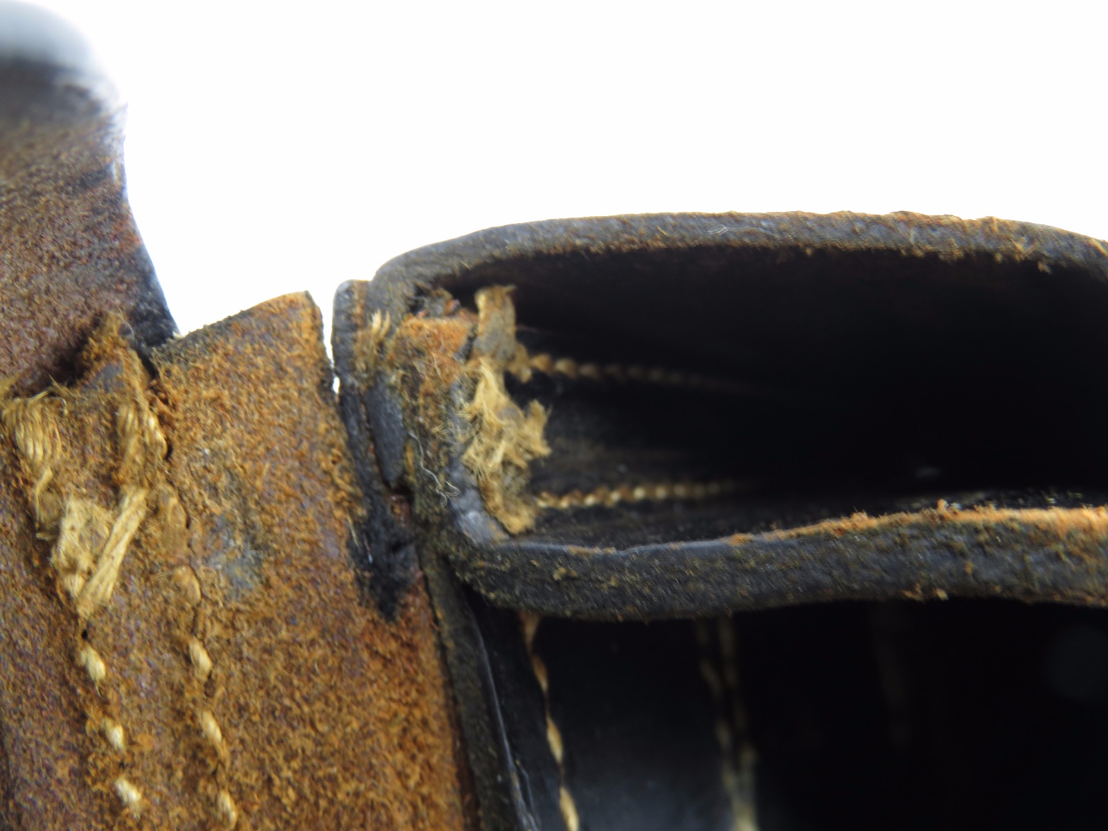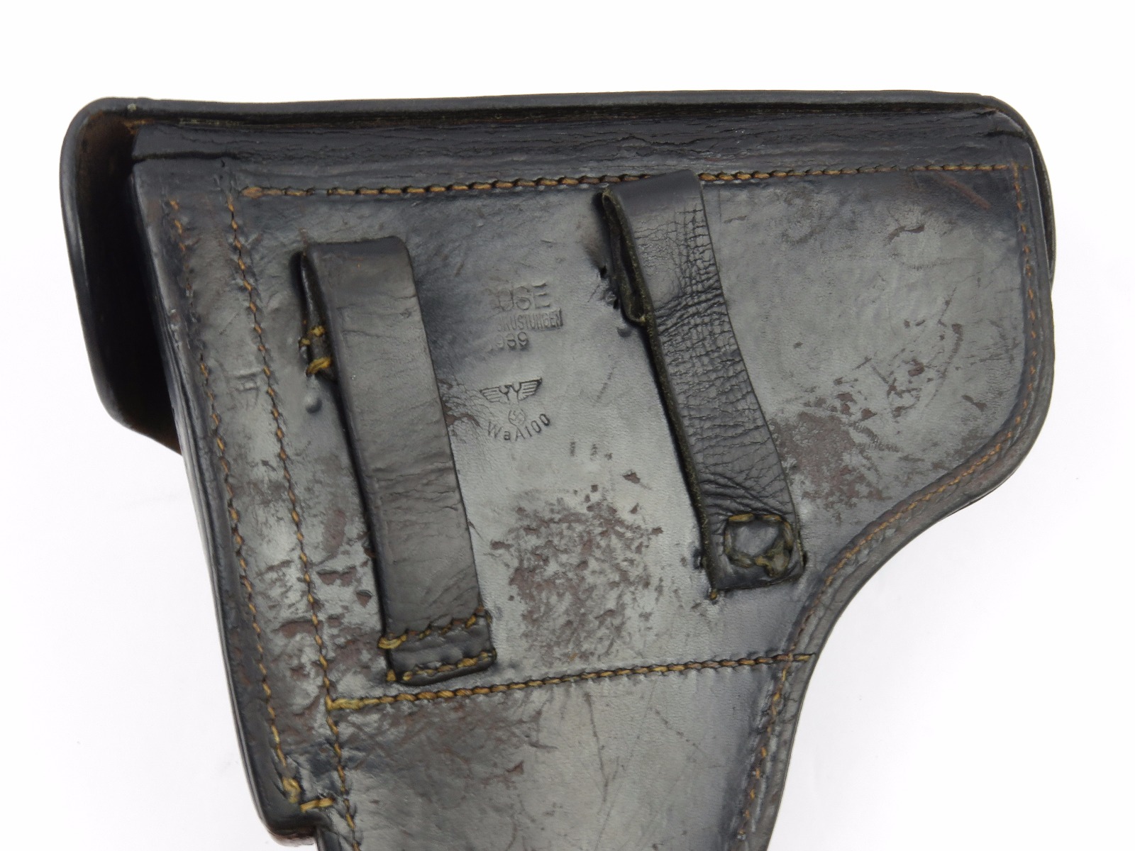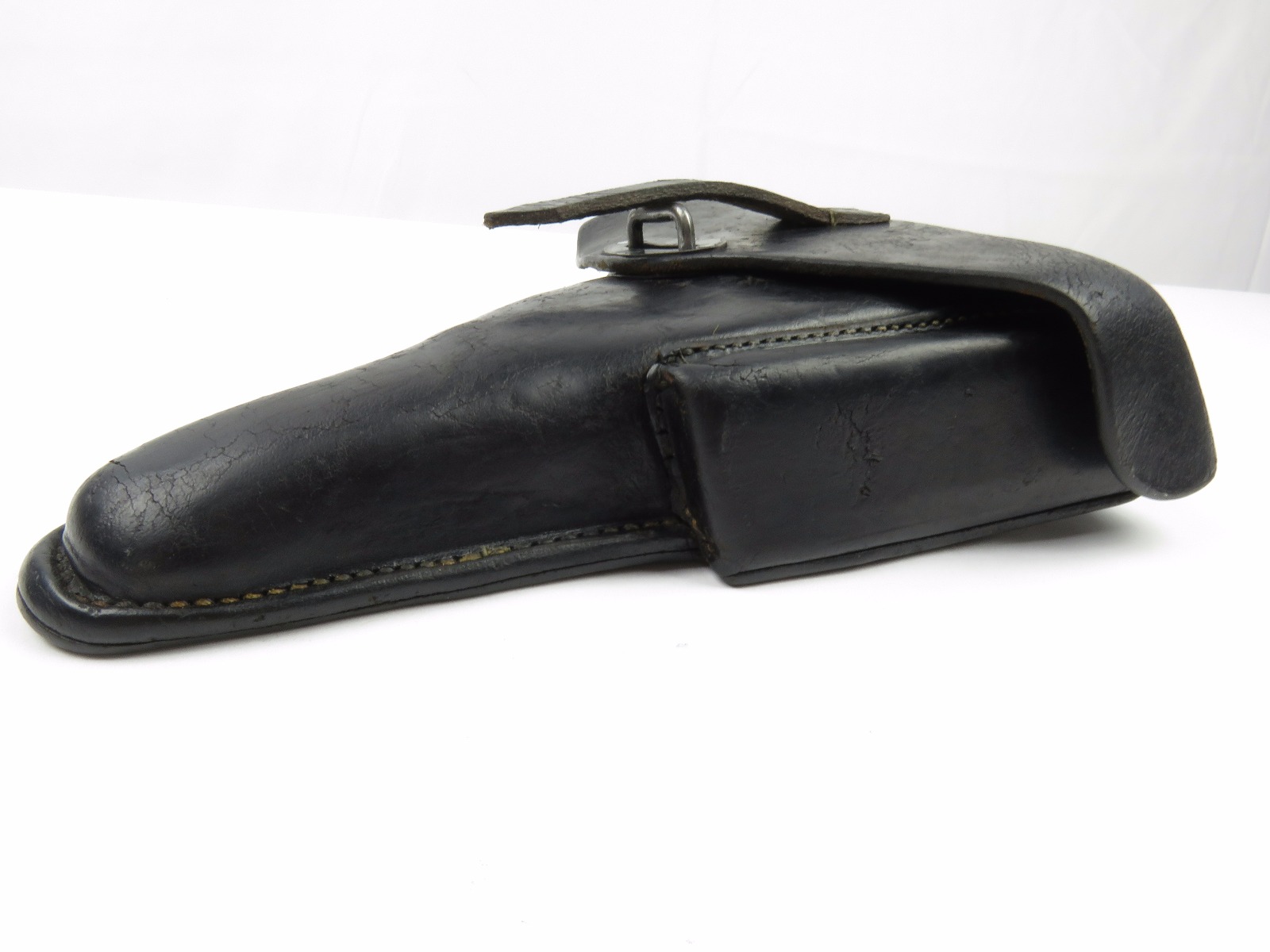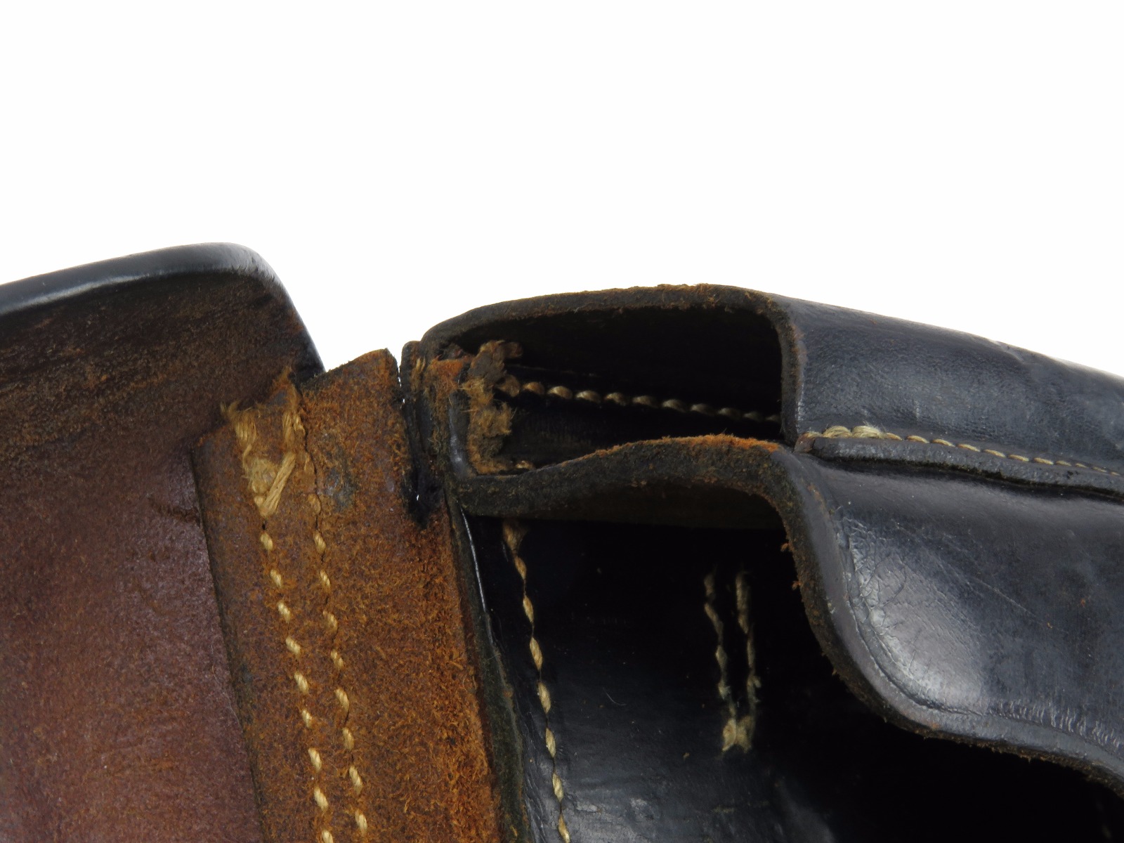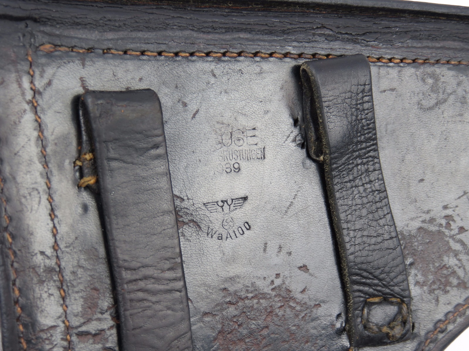 11/10/17 – This is an extremely rare 1939 dated P.38 holster! These early P.38 holsters are unheard of, and are often mistaken with CZ-39 holsters. So, when this holster came across my desk, my first reaction is to assume CZ-39. However, upon further inspection of the proofs on the back leather, and the lack of leather tab on the interior of the magazine pouch, we’ve concluded this is an original P.38 holster made in 1939! The back stamps are C. Pose maker, and waffen WaA100, which are seen with other Walther holsters from the time. The waffen 100 is found on PPK holsters, made by the same maker. It makes sense that this maker would be also making a few P.38 holsters for Walther as well. The black leather is fairly weak and worn, and pliable overall. The exterior ahs some surface cracking, but other experts claim that the other 1939 P.38 holsters they’ve seen (though very few) were in similar condition. The closure strap appears to be replacement, but otherwise the leather is all original. The stitching appears all original as well with no major issues. Guaranteed original and authentic.