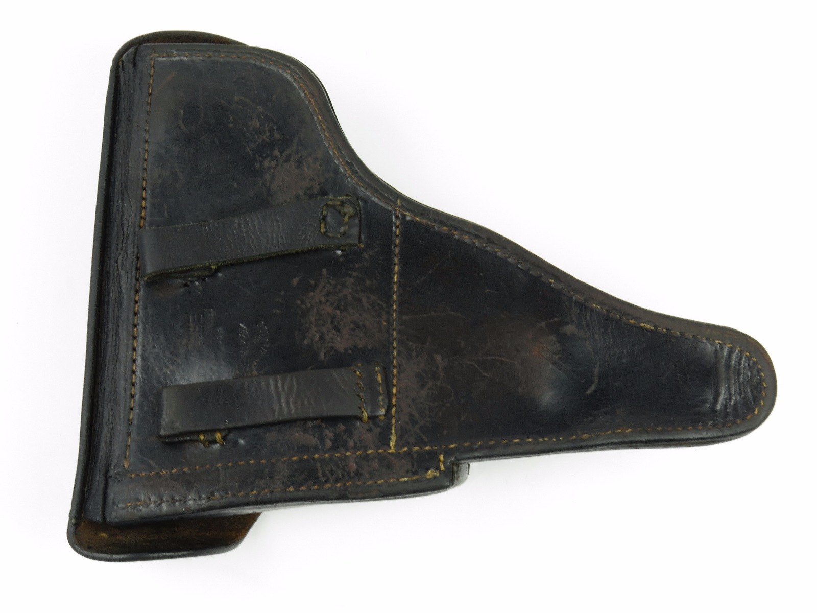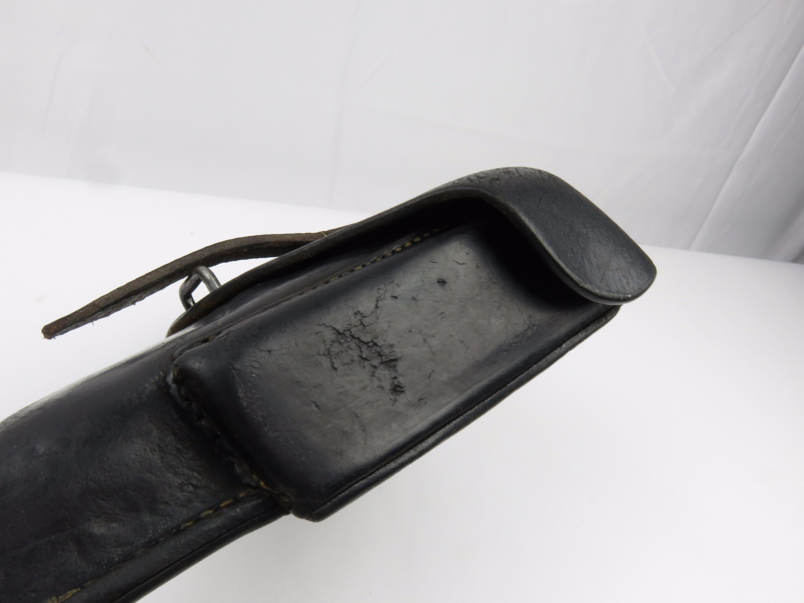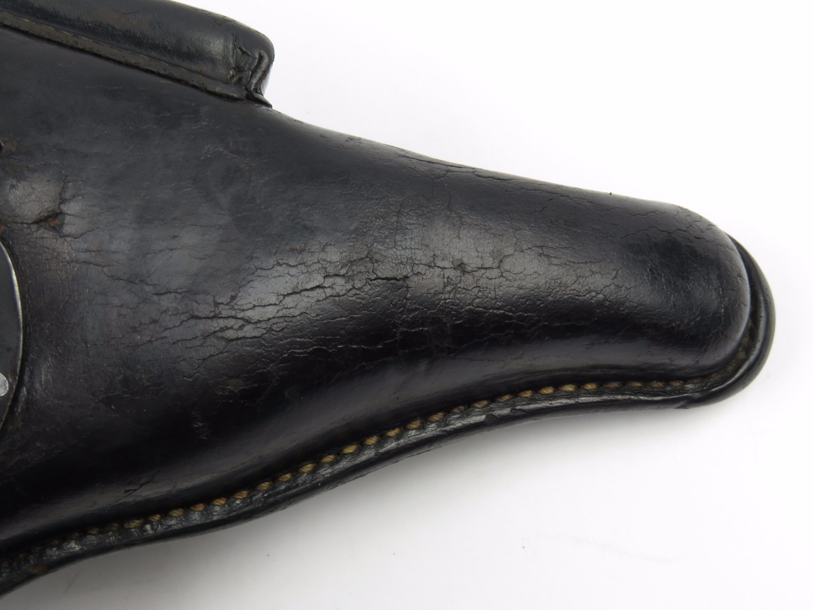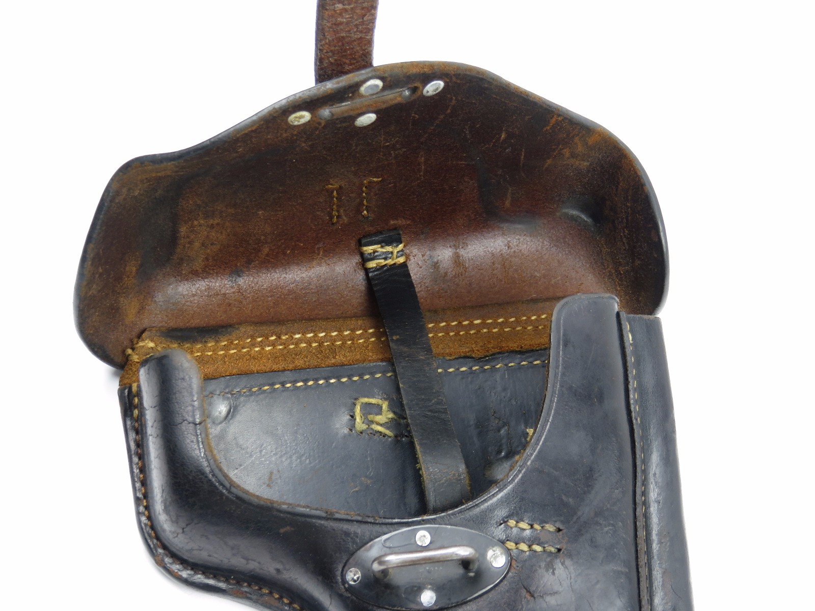 11/10/17 – This is an extremely rare 1939 dated P.38 holster! These early P.38 holsters are unheard of, and are often mistaken with CZ-39 holsters. So, when this holster came across my desk, my first reaction is to assume CZ-39. However, upon further inspection of the proofs on the back leather, and the lack of leather tab on the interior of the magazine pouch, we’ve concluded this is an original P.38 holster made in 1939! The back stamps are C. Pose maker, and waffen WaA100, which are seen with other Walther holsters from the time. The waffen 100 is found on PPK holsters, made by the same maker. It makes sense that this maker would be also making a few P.38 holsters for Walther as well. The black leather is fairly weak and worn, and pliable overall. The exterior ahs some surface cracking, but other experts claim that the other 1939 P.38 holsters they’ve seen (though very few) were in similar condition. The closure strap appears to be replacement, but otherwise the leather is all original. The stitching appears all original as well with no major issues. Guaranteed original and authentic.