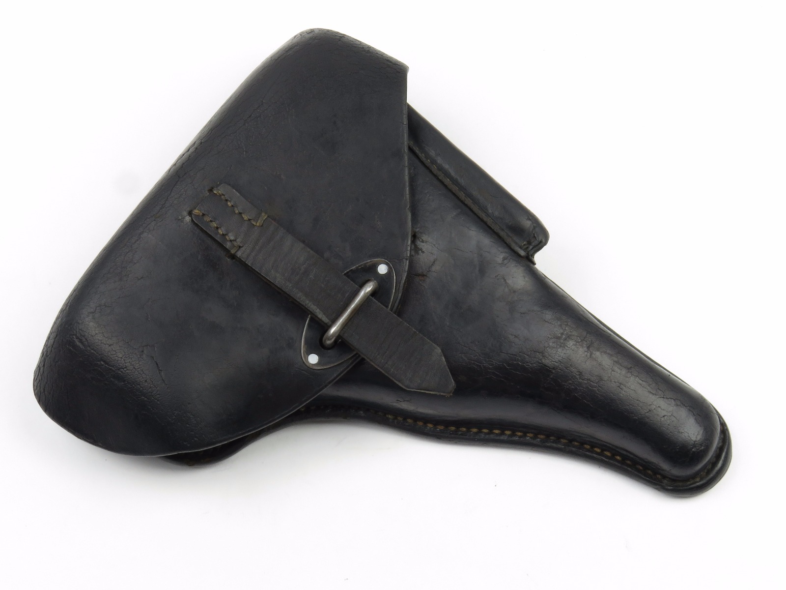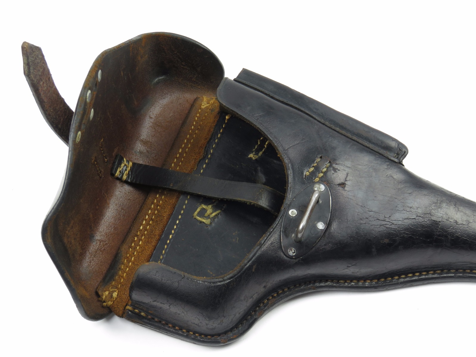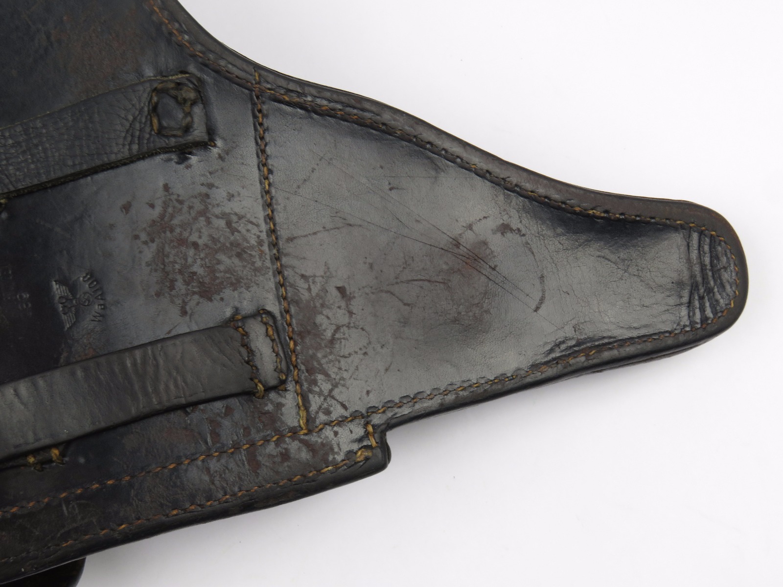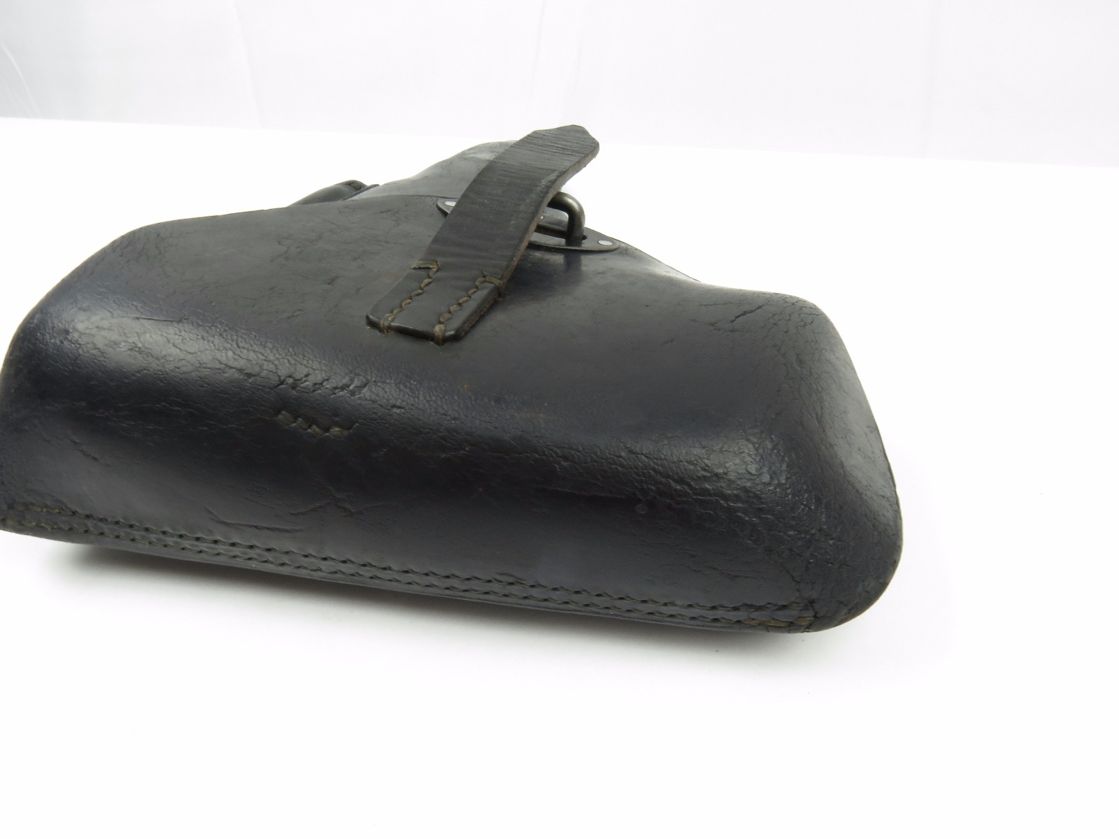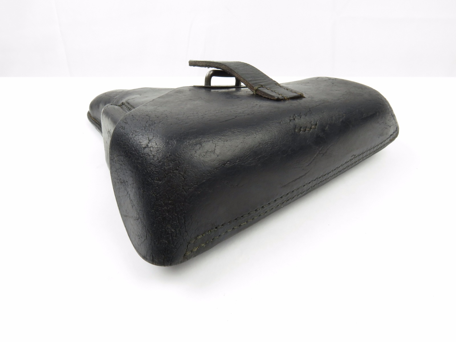 11/10/17 – This is an extremely rare 1939 dated P.38 holster! These early P.38 holsters are unheard of, and are often mistaken with CZ-39 holsters. So, when this holster came across my desk, my first reaction is to assume CZ-39. However, upon further inspection of the proofs on the back leather, and the lack of leather tab on the interior of the magazine pouch, we’ve concluded this is an original P.38 holster made in 1939! The back stamps are C. Pose maker, and waffen WaA100, which are seen with other Walther holsters from the time. The waffen 100 is found on PPK holsters, made by the same maker. It makes sense that this maker would be also making a few P.38 holsters for Walther as well. The black leather is fairly weak and worn, and pliable overall. The exterior ahs some surface cracking, but other experts claim that the other 1939 P.38 holsters they’ve seen (though very few) were in similar condition. The closure strap appears to be replacement, but otherwise the leather is all original. The stitching appears all original as well with no major issues. Guaranteed original and authentic.