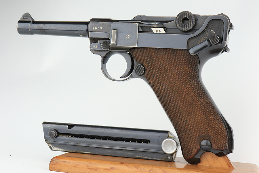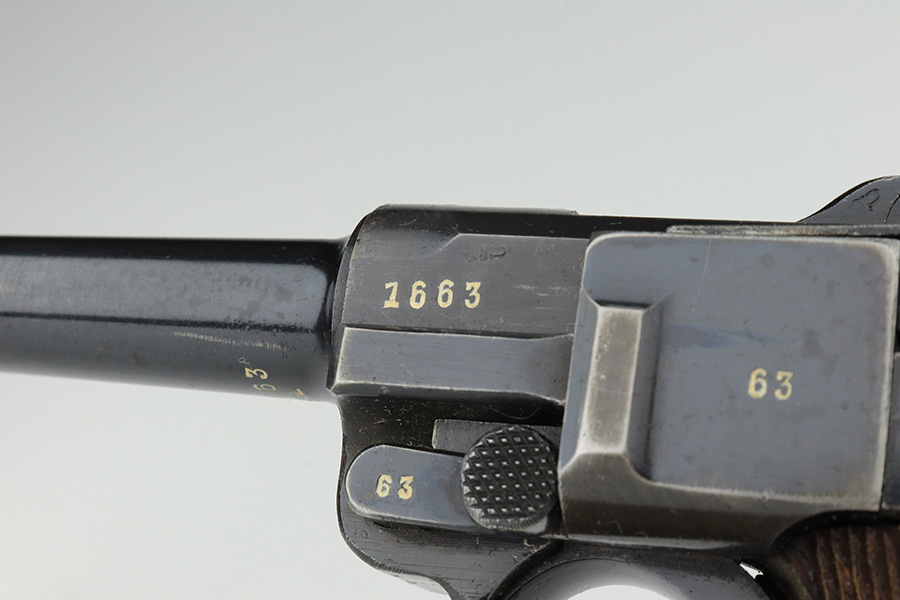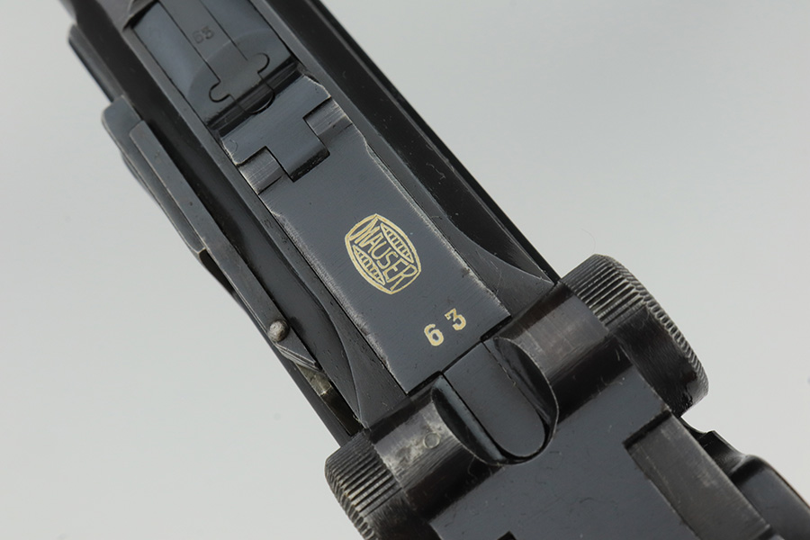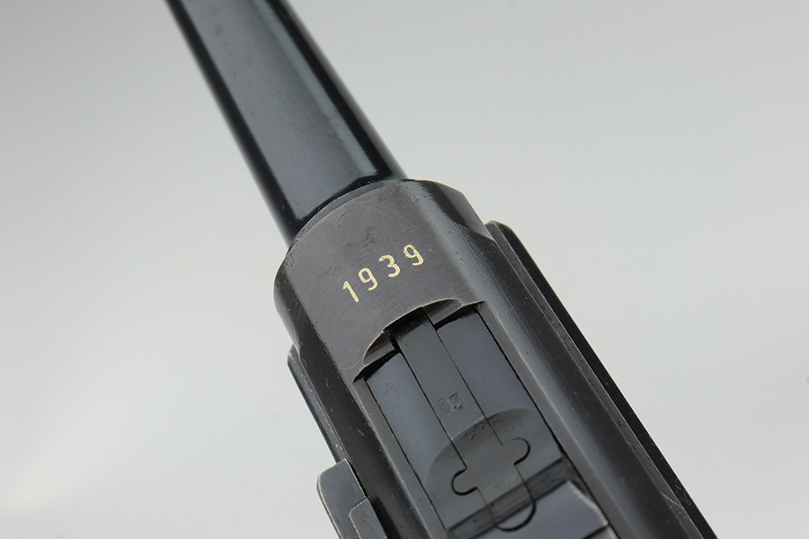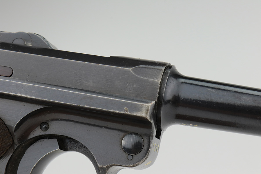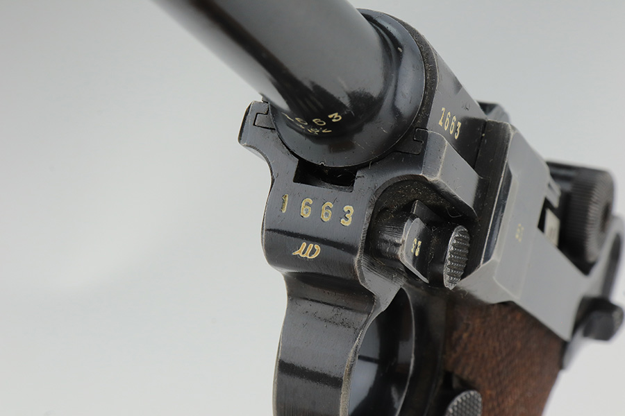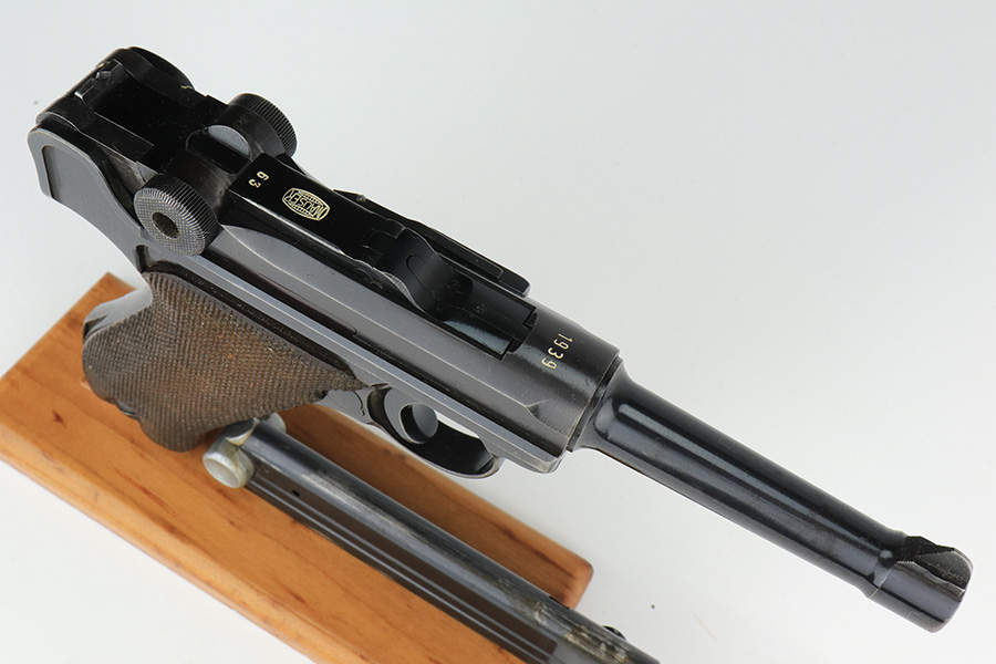 1/18/23 – This is a very nice example of a Mauser Luger issued to the Nazi police force in 1939. The gun is all matching, has the Mauser banner logo on the toggle, has an added police sear safety, and a proper police “Eagle C” marking on the right side of the slide. This one also comes with an original matching magazine. This gun is rare as only about 2,850 of this variation were ever produced. It has retained about 93% of its finish. There is very minor thinning on the grip straps and areas of minor wear around the muzzle, on the side plate, and on the side rails. Some small dots of oxidation on the barrel and on the front strap. Fitted with an excellent set of matching-numbered wood grips. Mint bore.