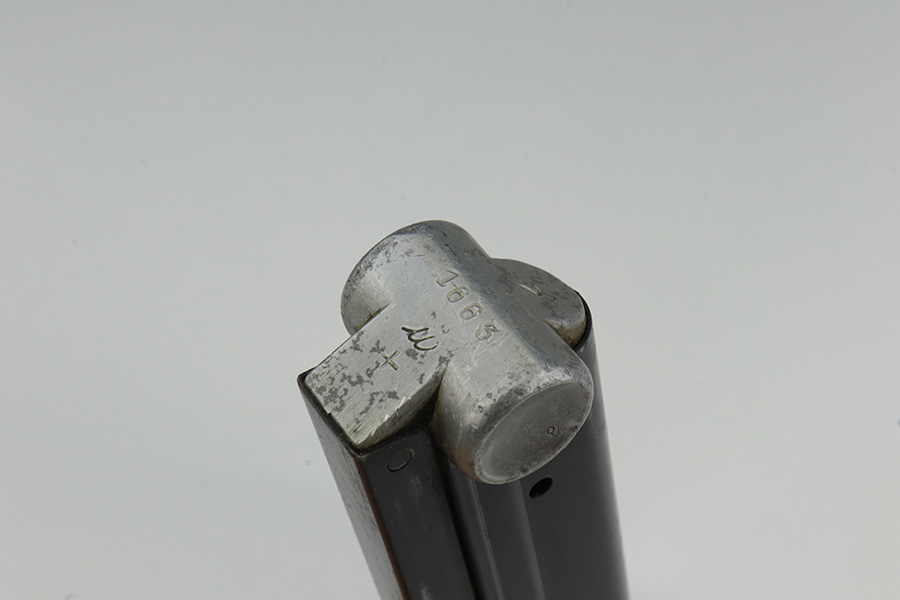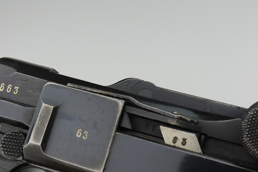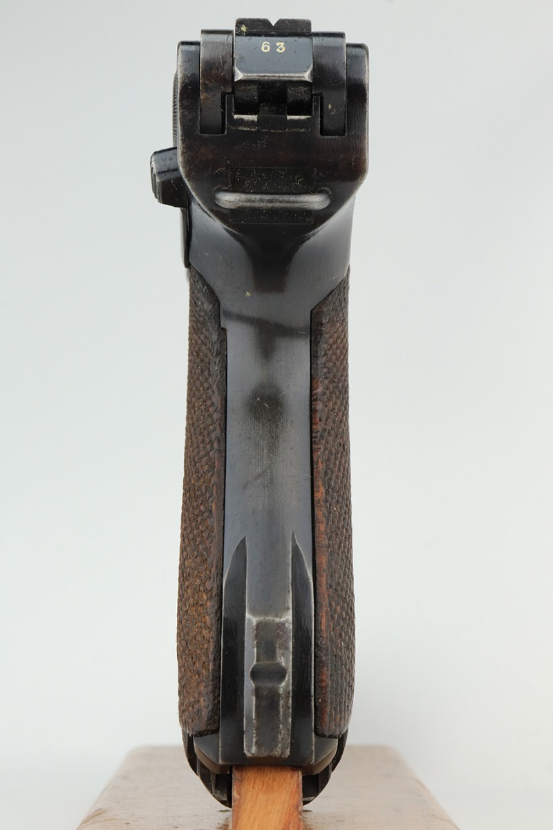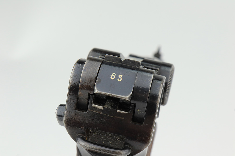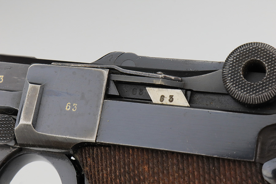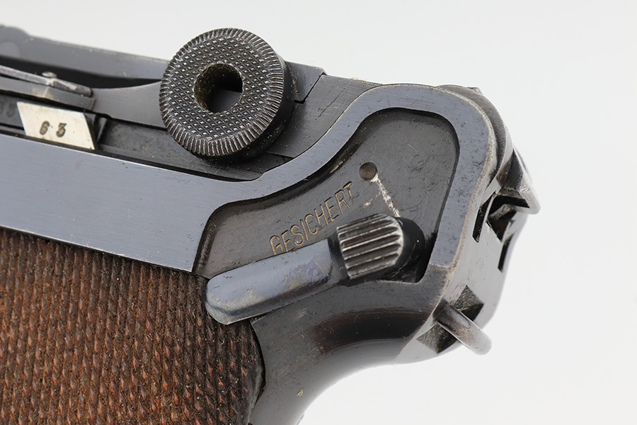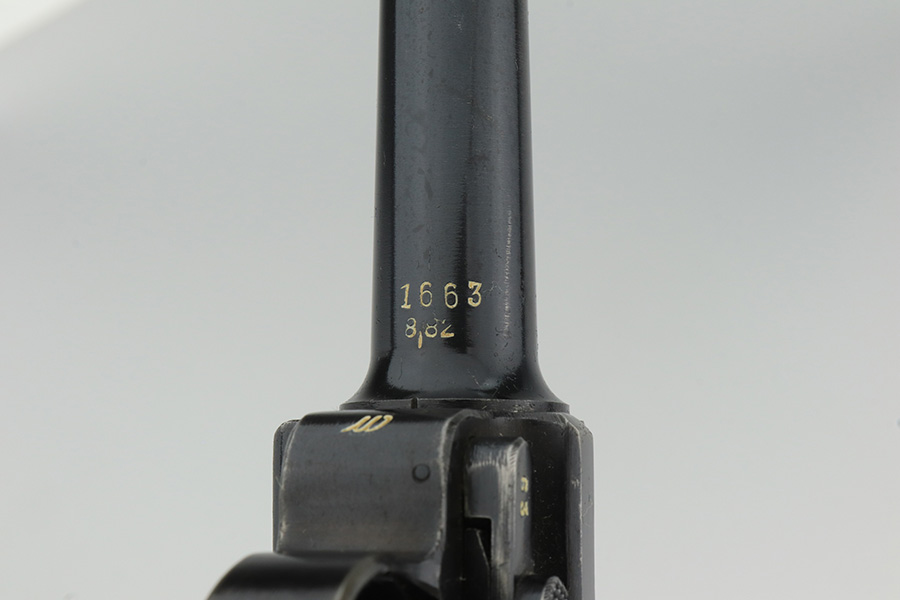 1/18/23 – This is a very nice example of a Mauser Luger issued to the Nazi police force in 1939. The gun is all matching, has the Mauser banner logo on the toggle, has an added police sear safety, and a proper police “Eagle C” marking on the right side of the slide. This one also comes with an original matching magazine. This gun is rare as only about 2,850 of this variation were ever produced. It has retained about 93% of its finish. There is very minor thinning on the grip straps and areas of minor wear around the muzzle, on the side plate, and on the side rails. Some small dots of oxidation on the barrel and on the front strap. Fitted with an excellent set of matching-numbered wood grips. Mint bore.