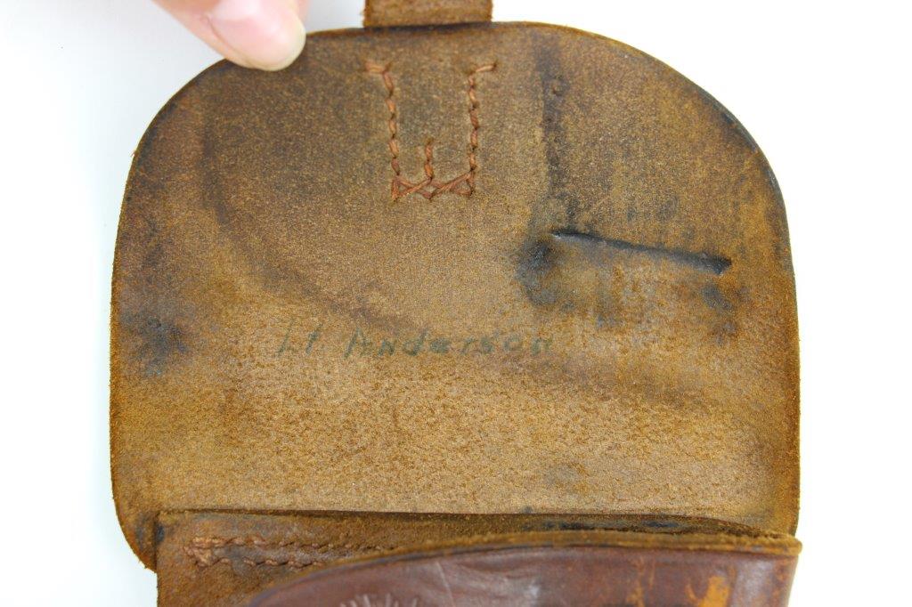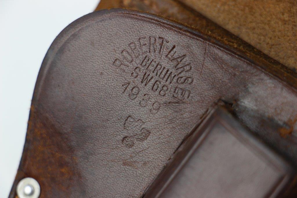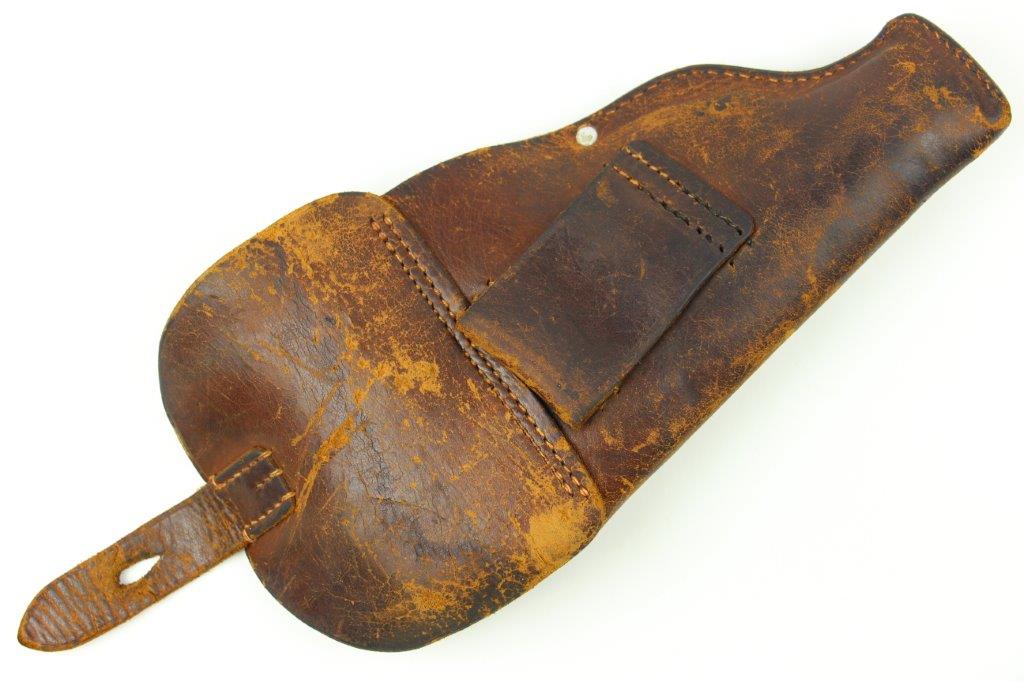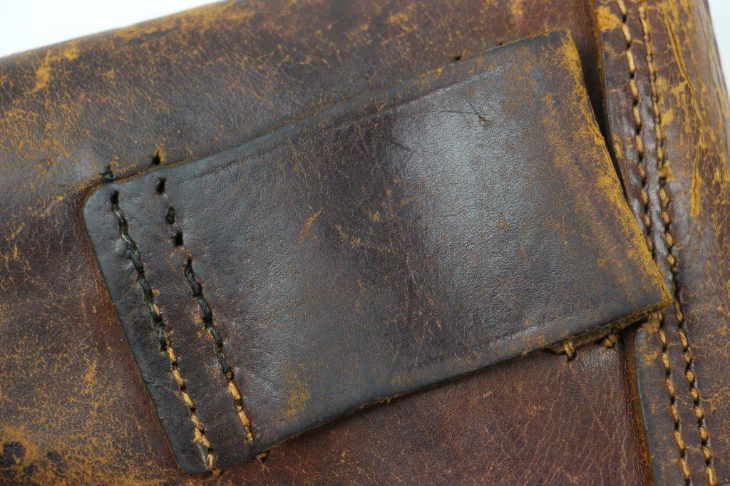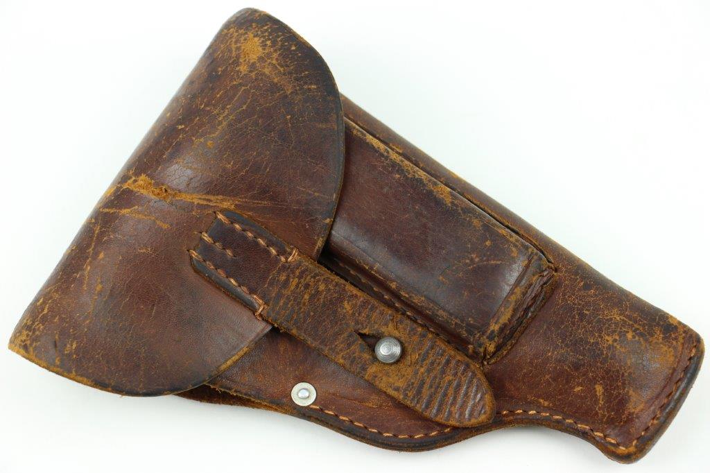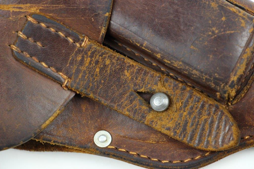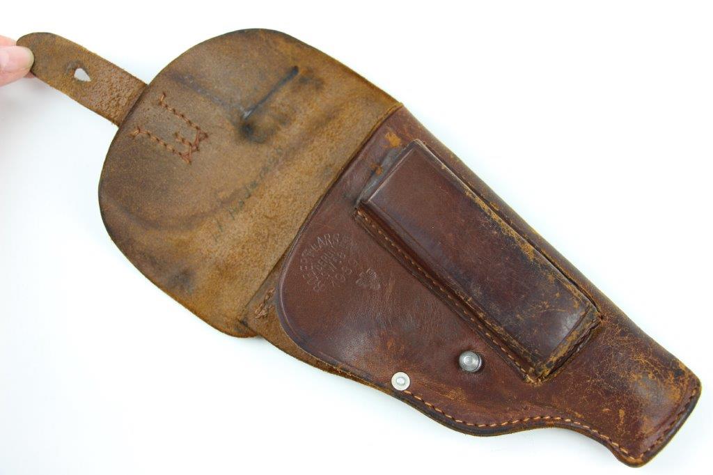 8/28/24 – This is an original 1939 dated Police pistol holster from WW2. The holster is smaller sized and can fit a Walther PPK and most 6.35mm Axis pistols. The holster measures about 16.5cm long and 12.1cm wide when closed. The leather is soft and pliable with honest wear from use and age. There’s scuffing and wrinkling / surface cracking on the top leather. More scuffing and surface wear found on the magazine pouch, closure strap, and toe of the holster. Under the front closure strap is a Robert Larsen maker stamp, 1939 date stamp, and police eagle proof stamp. The stitching is all original except for some of the stitches on the bottom portion of the belt loop, where there’s black replacement stitching. Good overall condition and well marked.
