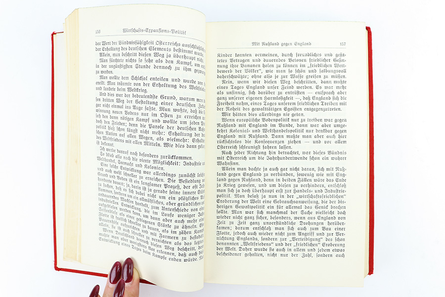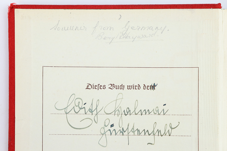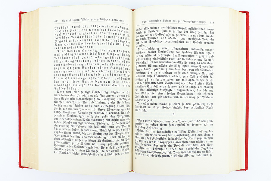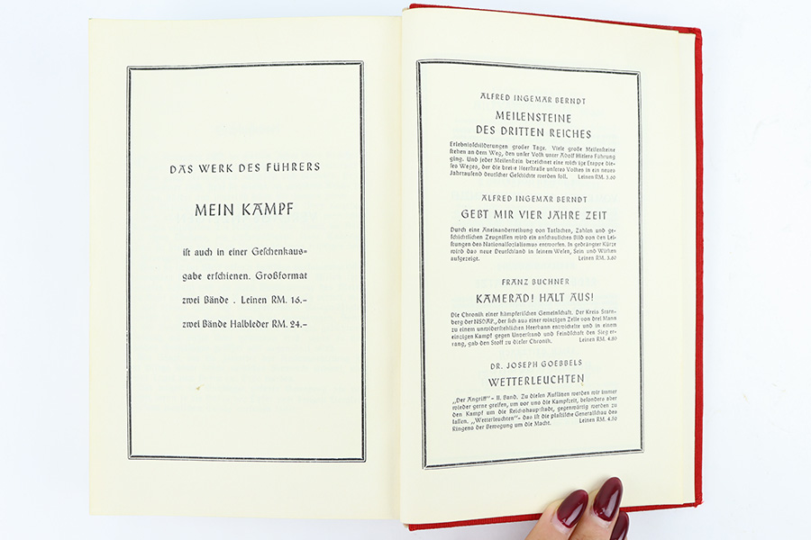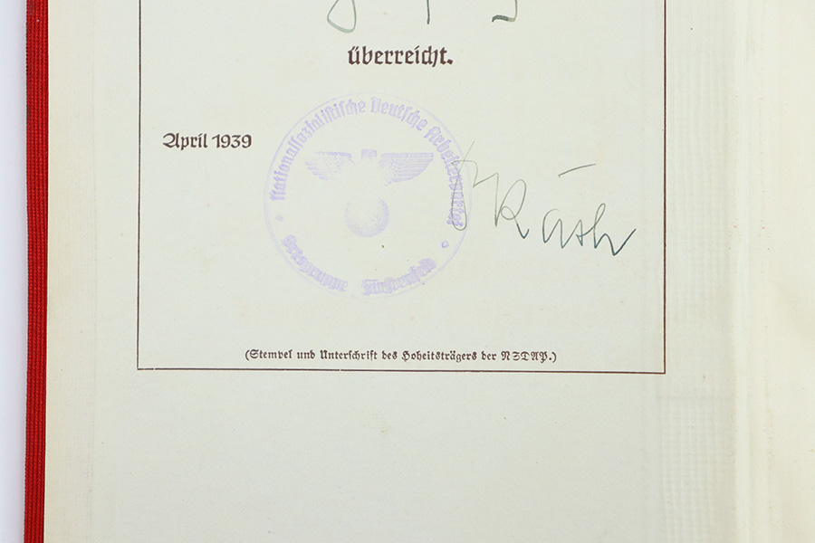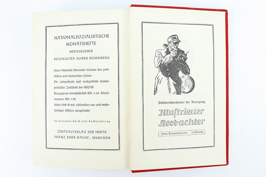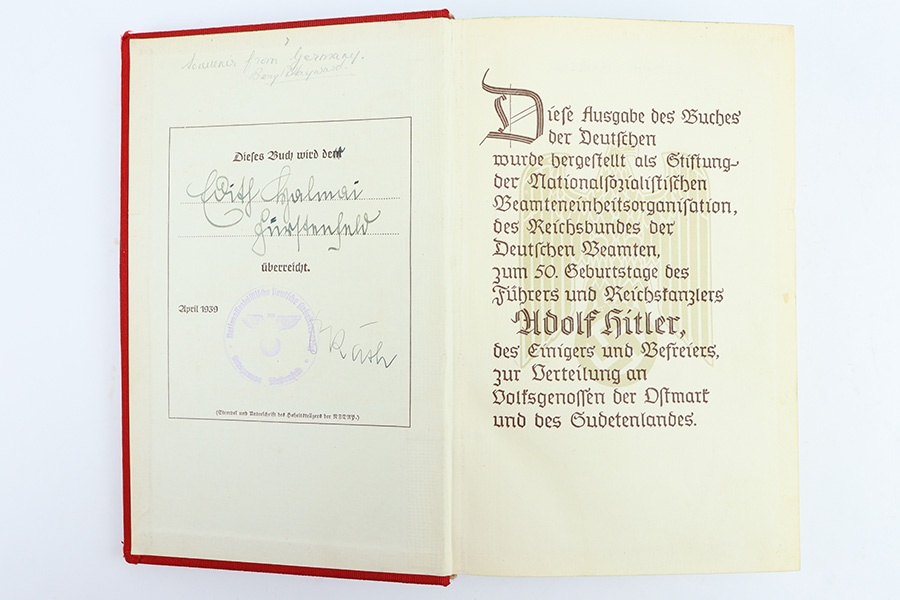 12/18/23 – This is an original 1939 publication of “Mein Kampf” by Adolf Hitler. The 1939 red cover publications are also referred to as “Jubilee Editions” as these were produced in honor of celebrating Hitler’s 50th birthday. Sure enough, this copy is marked “April 1939” on the interior cover page. Excellent condition with all pages intact and clean. Some mild yellowing but very minimal wear or damage. The cover is clean as well with no notable issues.