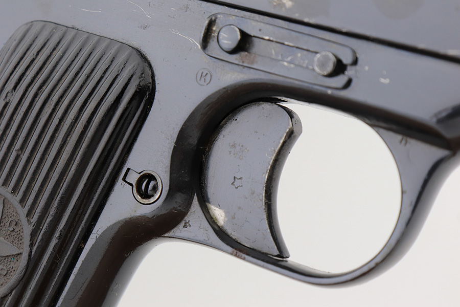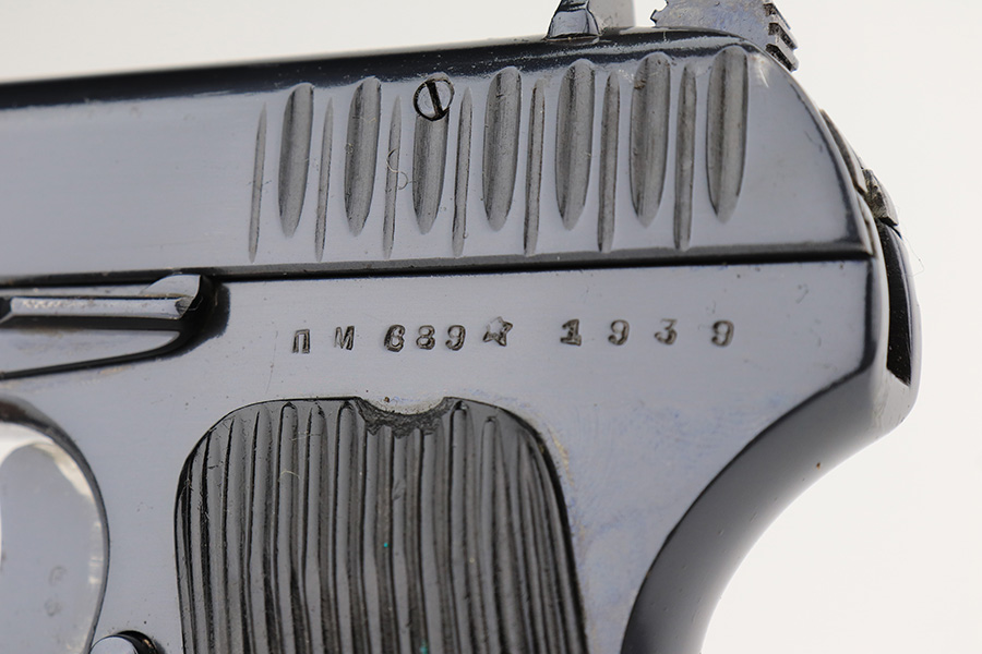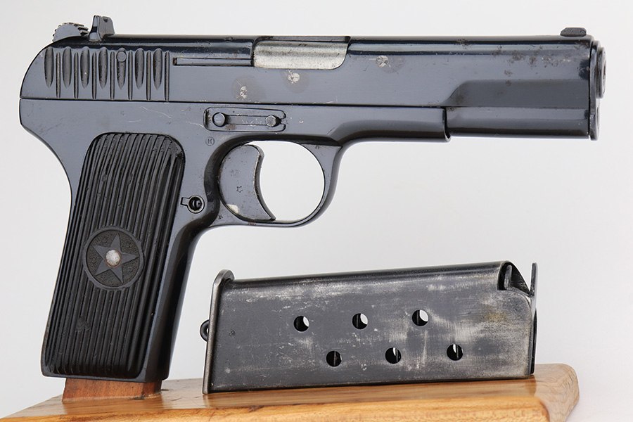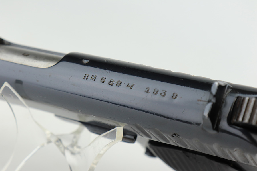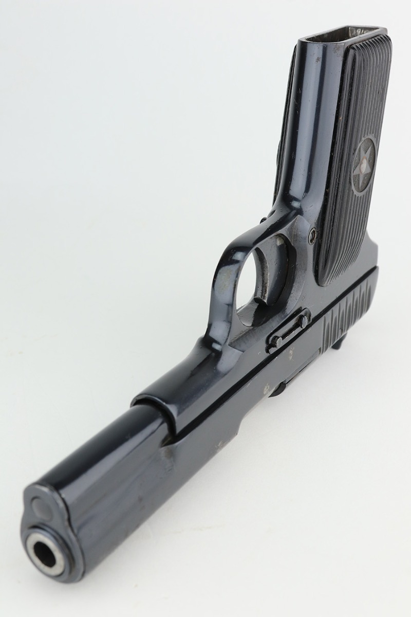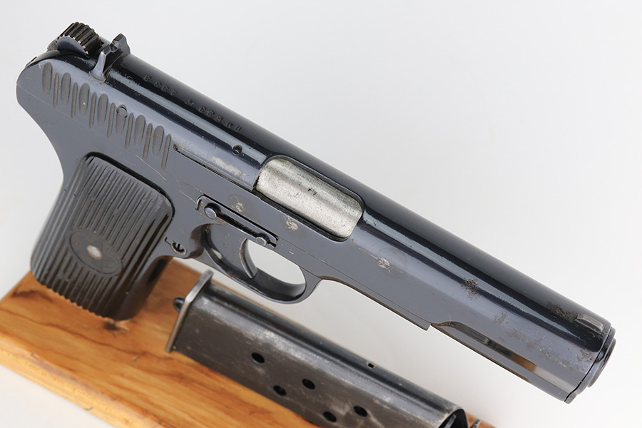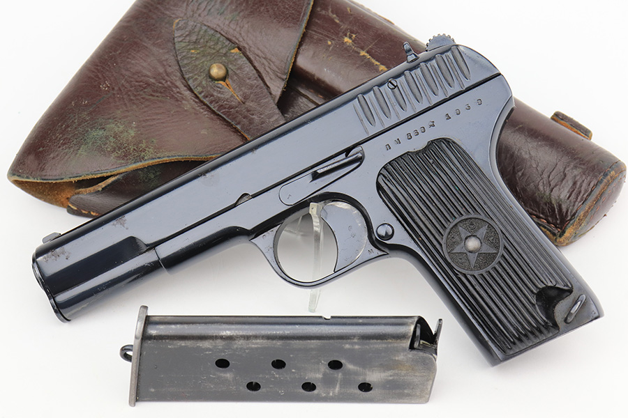 2/21/23 – This is a very nice example of a Tokarev TT-33 issued to the Russian military in 1939. It is all matching and comes as a rig with a nice brown leather holster and one mismatched but period-correct magazine. The finish on the gun has been completely restored. There is not much actual finish loss, but there are some small spots of noticeable oxidation and minor pitting on both sides of the slide. Three dots of discoloration on the right side of the slide. A few tiny scratches on the right side of the frame. Fitted with excellent period-correct black bakelite grips. The bore has good rifling, but there is very minor pin-pricking throughout.
