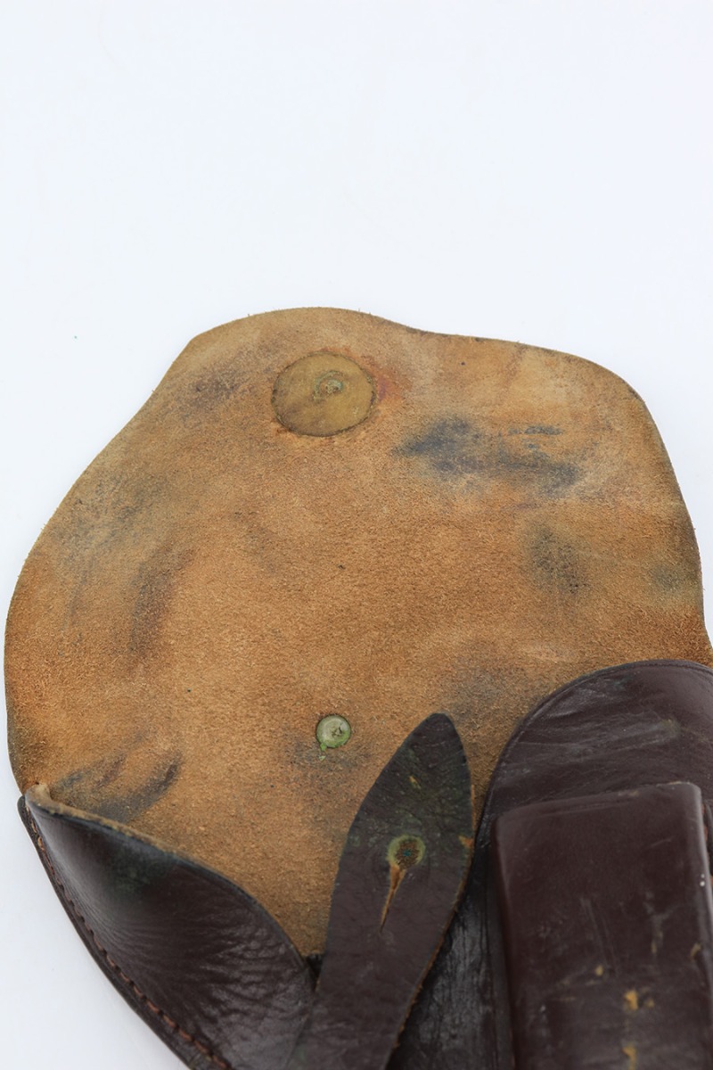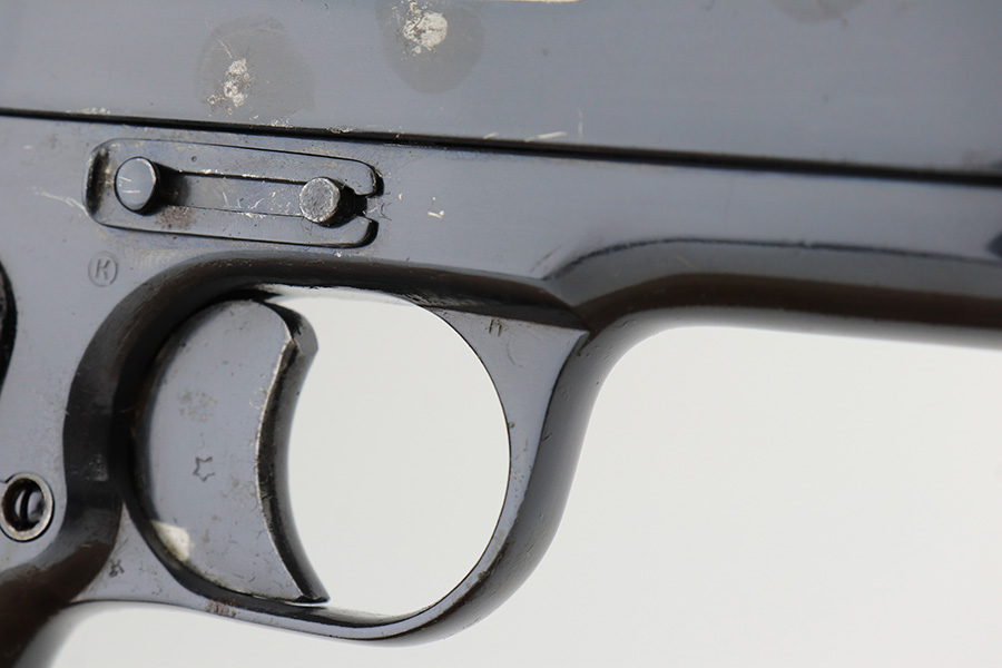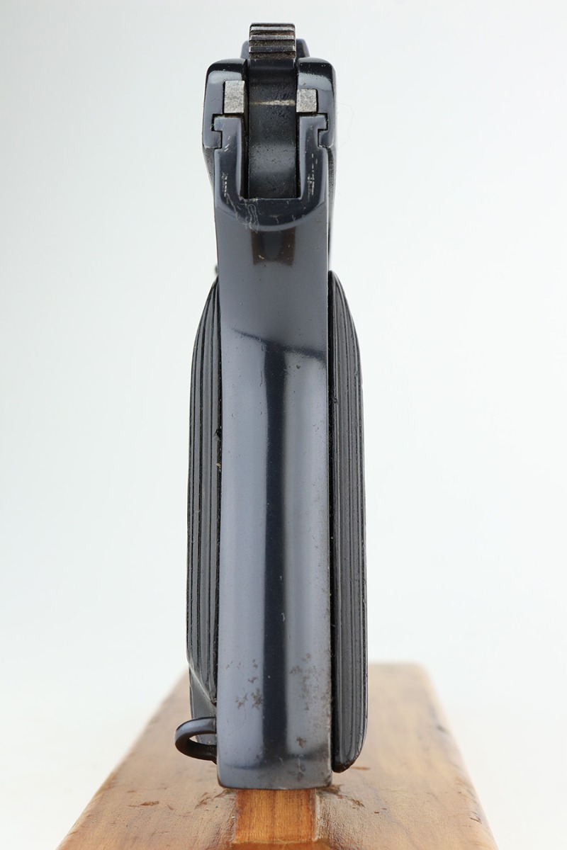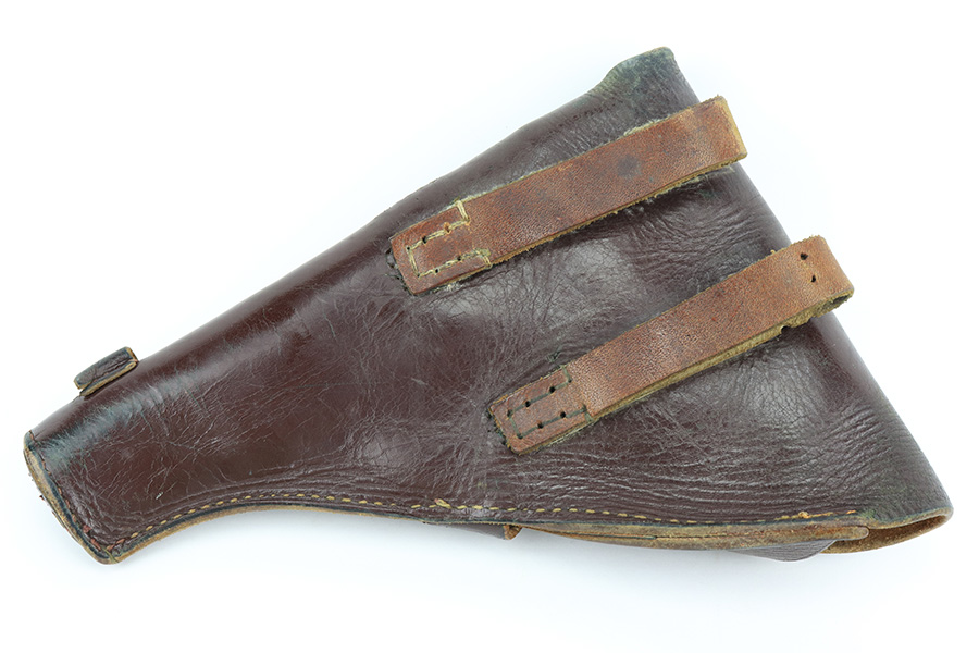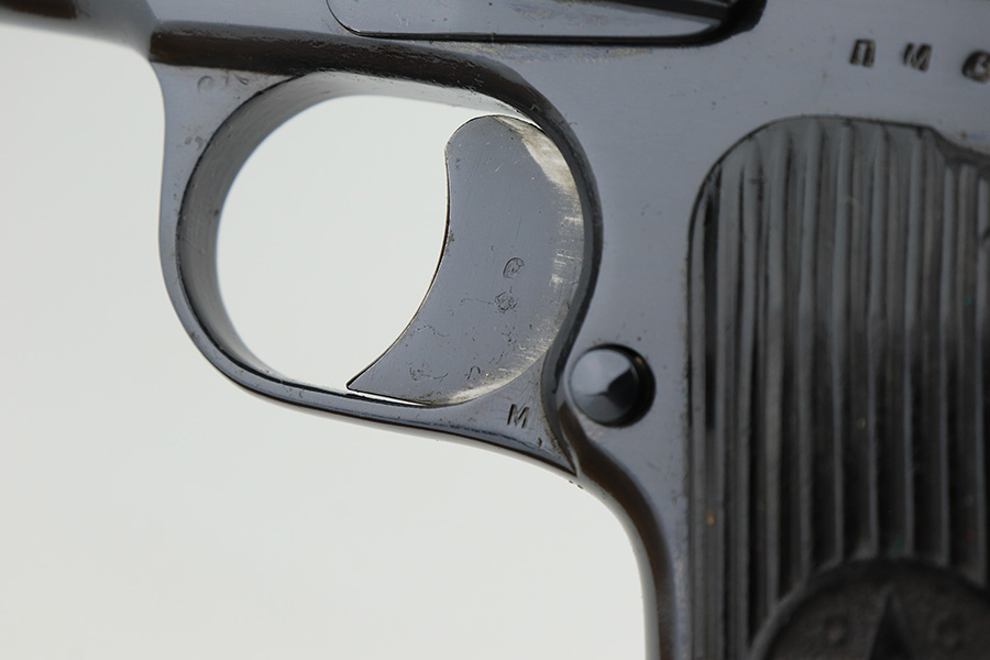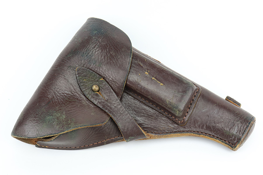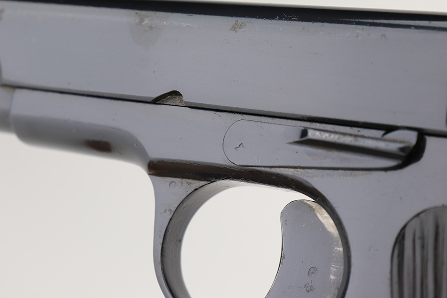 2/21/23 – This is a very nice example of a Tokarev TT-33 issued to the Russian military in 1939. It is all matching and comes as a rig with a nice brown leather holster and one mismatched but period-correct magazine. The finish on the gun has been completely restored. There is not much actual finish loss, but there are some small spots of noticeable oxidation and minor pitting on both sides of the slide. Three dots of discoloration on the right side of the slide. A few tiny scratches on the right side of the frame. Fitted with excellent period-correct black bakelite grips. The bore has good rifling, but there is very minor pin-pricking throughout.