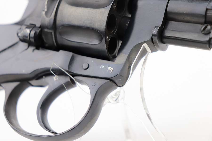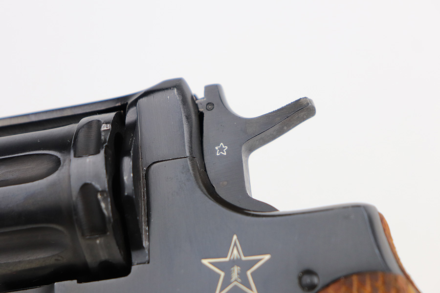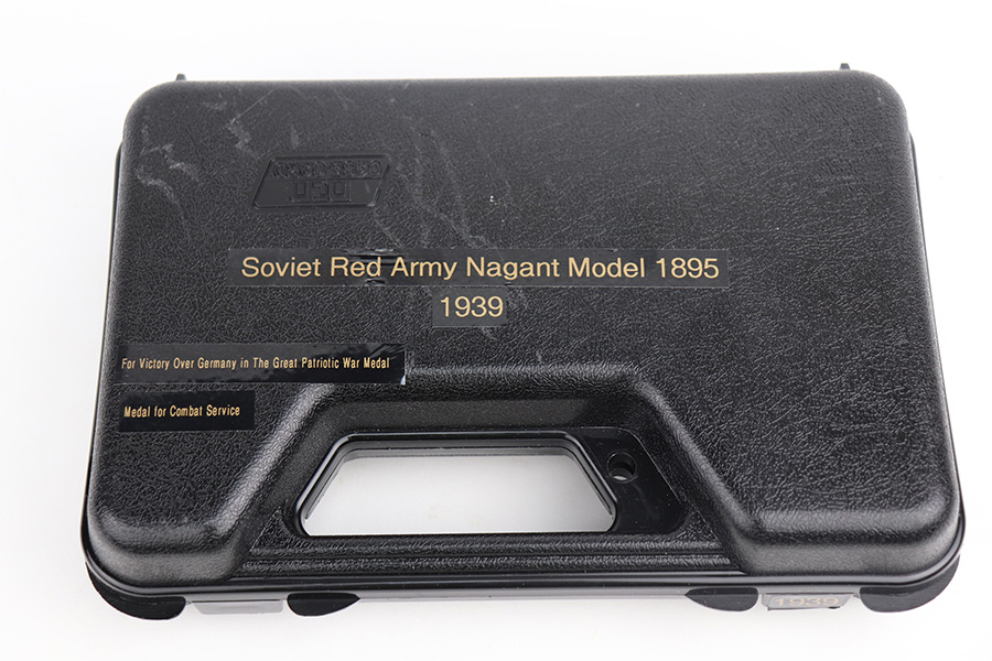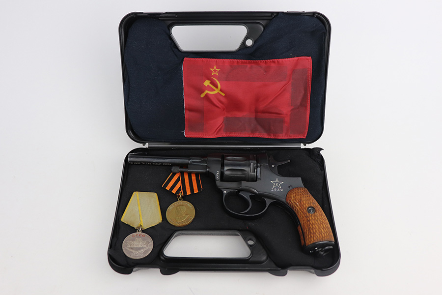 5/6/21 – This is an excellent example of a Nagant M1895 Revolver issued to the Soviet military in 1939. This gun is being sold on consignment. The consignor put together a very cool assembly to accompany the gun that includes a labeled hard case, a repro Soviet flag, a WW2 Medal for the victory over Germany in The Great Patriotic War, and a WW2 Medal for Combat Service. The gun is matching but has an import mark and the finish has been restored. It has retained virtually all of its new bluing with a tiny scratch on the front strap. Mint grips. Excellent bore with good rifling and minor freckling in the grooves.