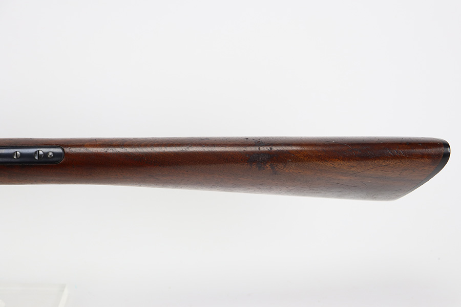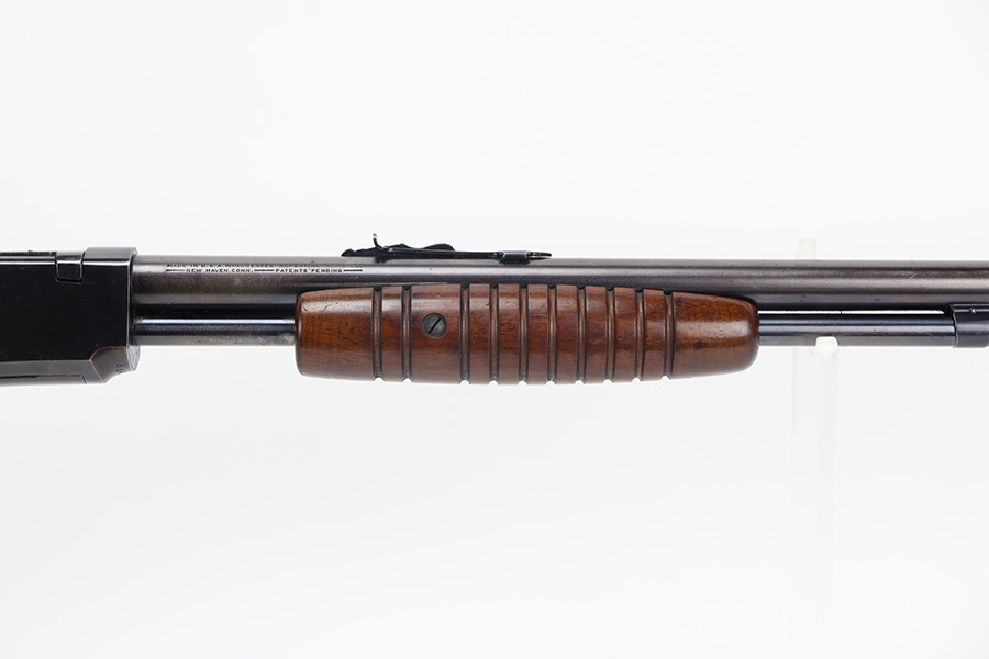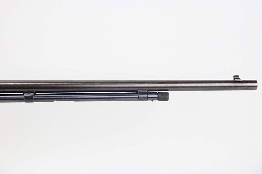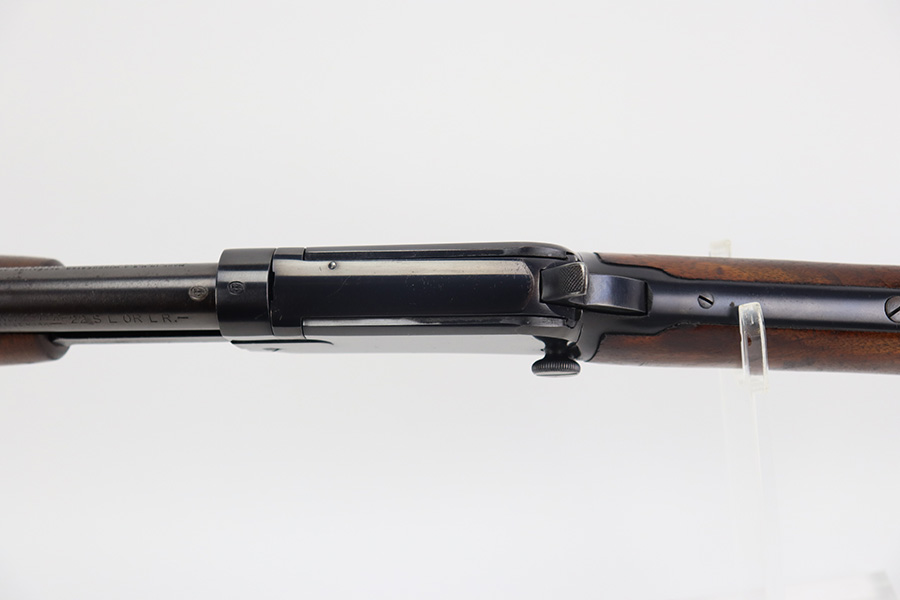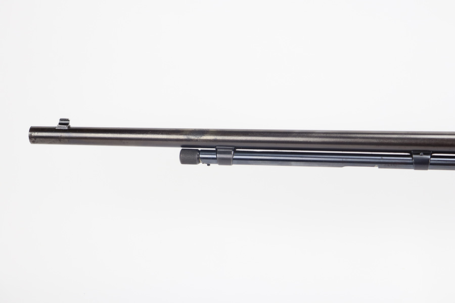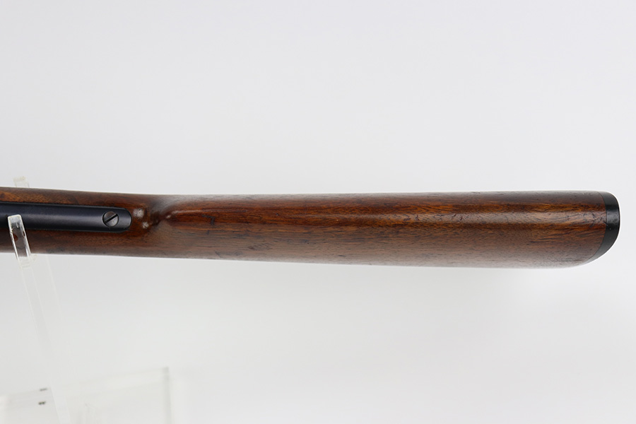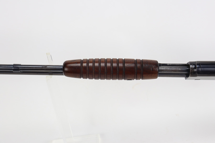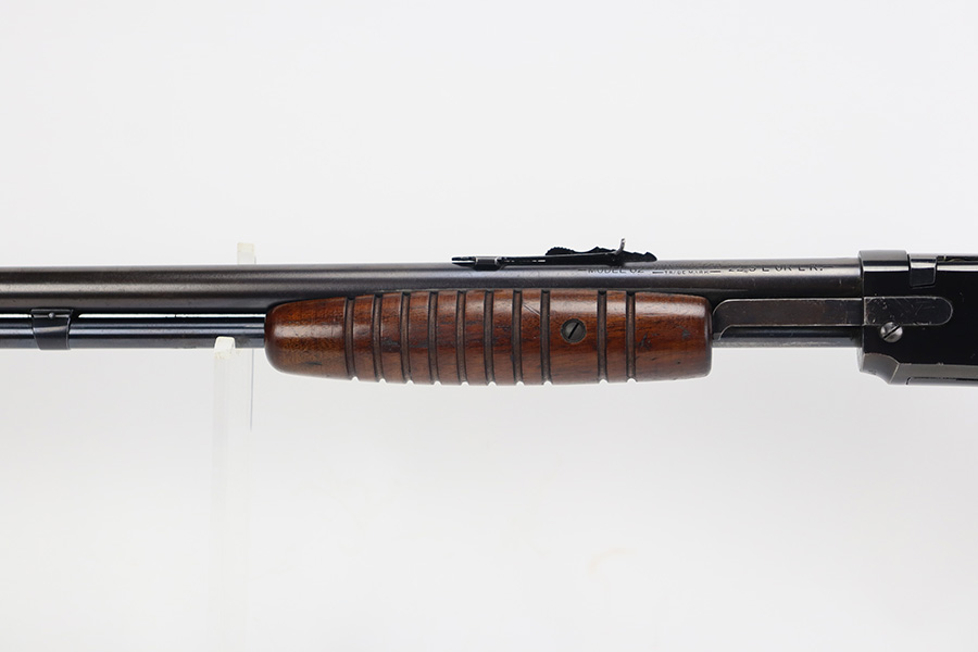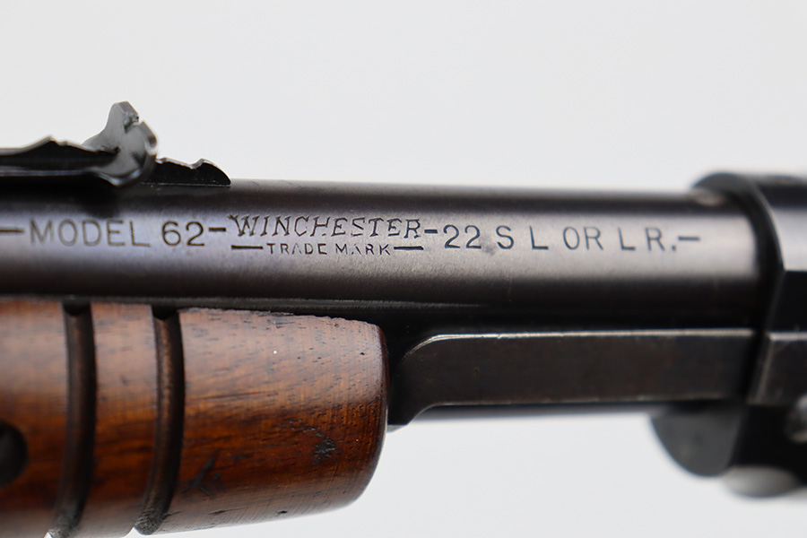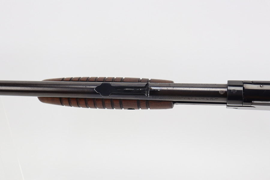 8/16/23 – This is a very nice example of a Winchester Model 62 pump action rifle, manufactured in 1939 and chambered in .22 short, long, and long rifle. It is matching and has retained about 92-93% of its original high polish bluing. The majority of the finish loss is along the barrel, where there are some areas of thinning. One noticeable spot of oxidation on the left side of the barrel. Some tiny surface scratches on the receiver. Excellent wood furniture. Mint bore.