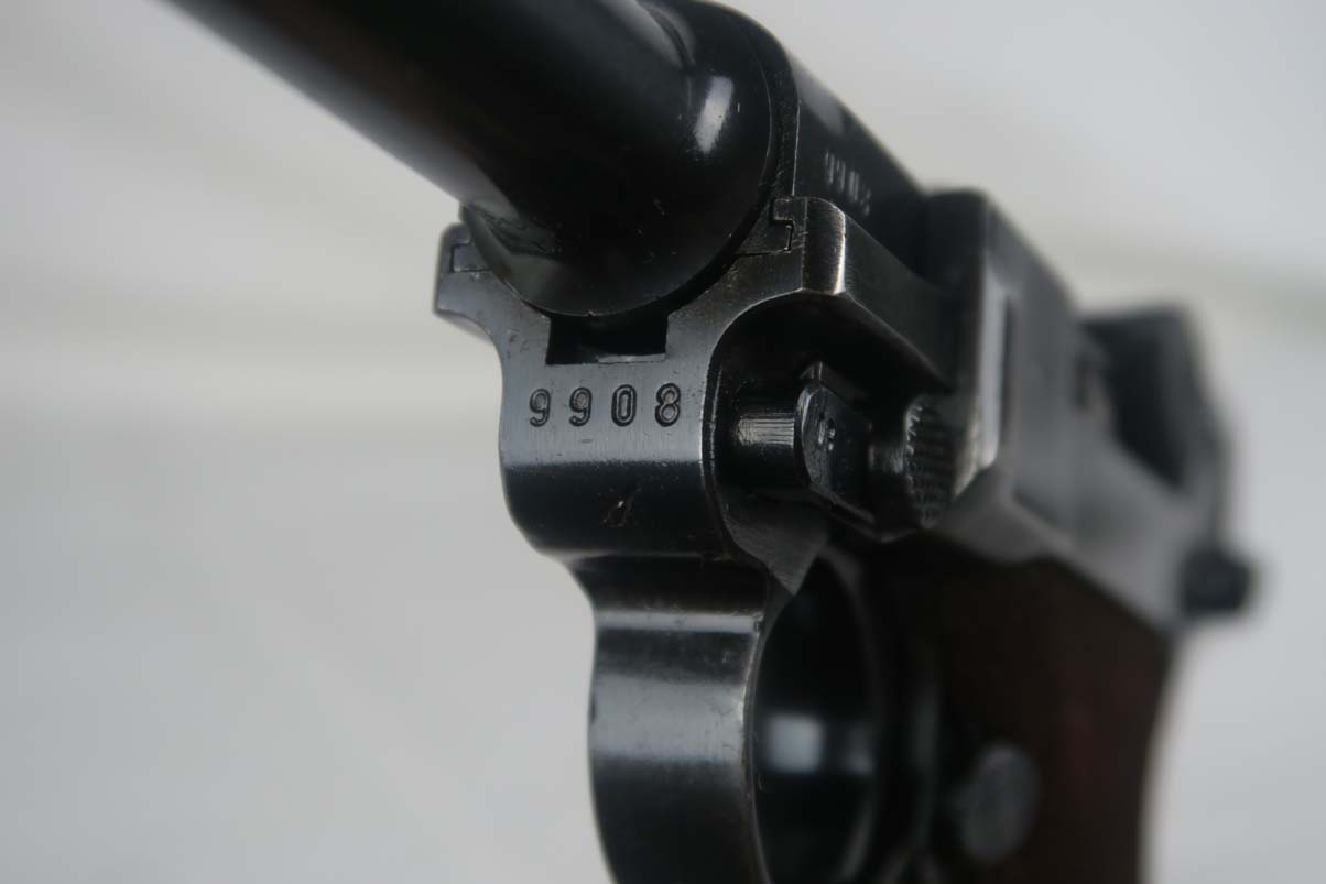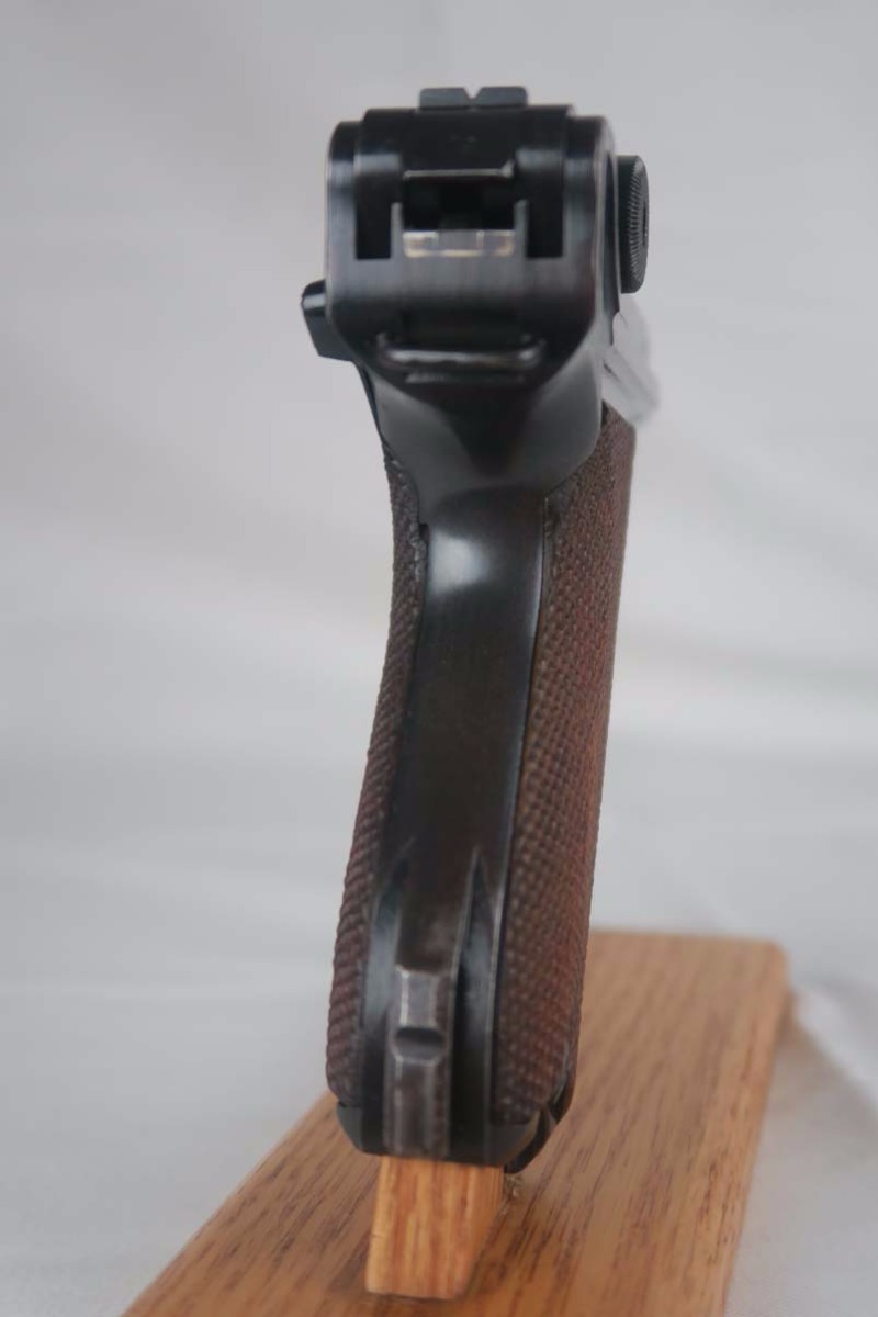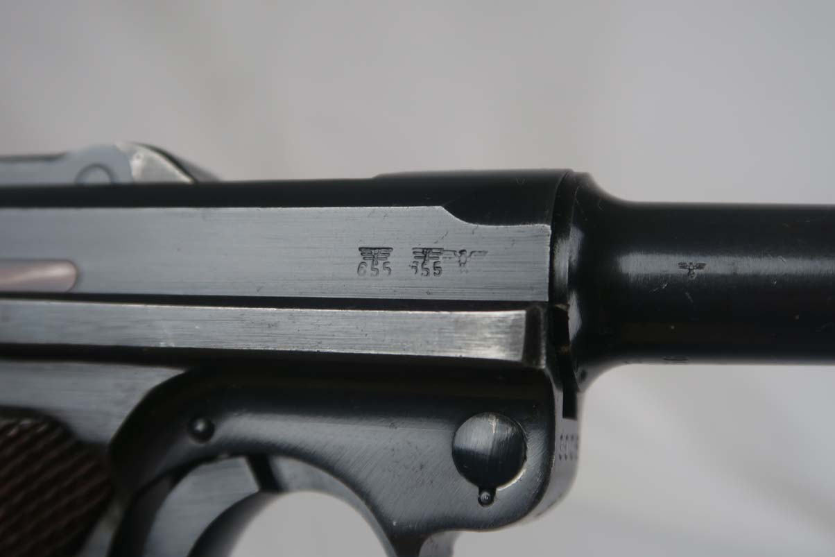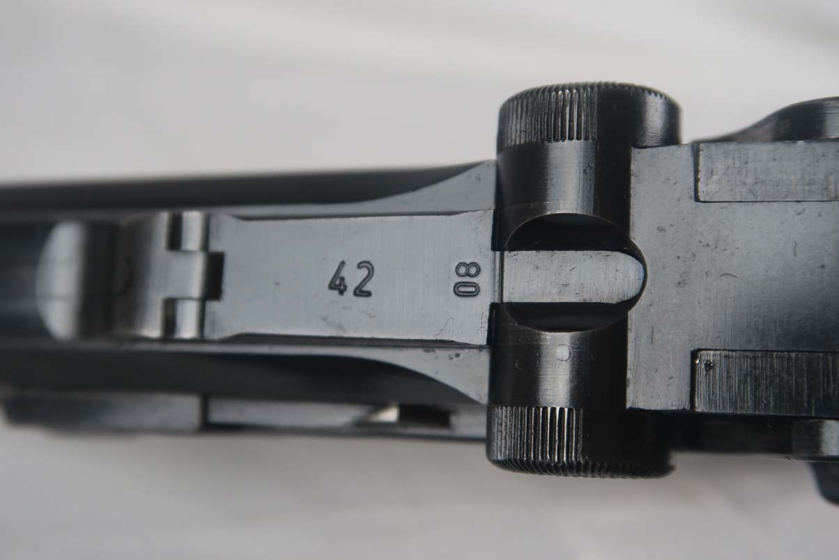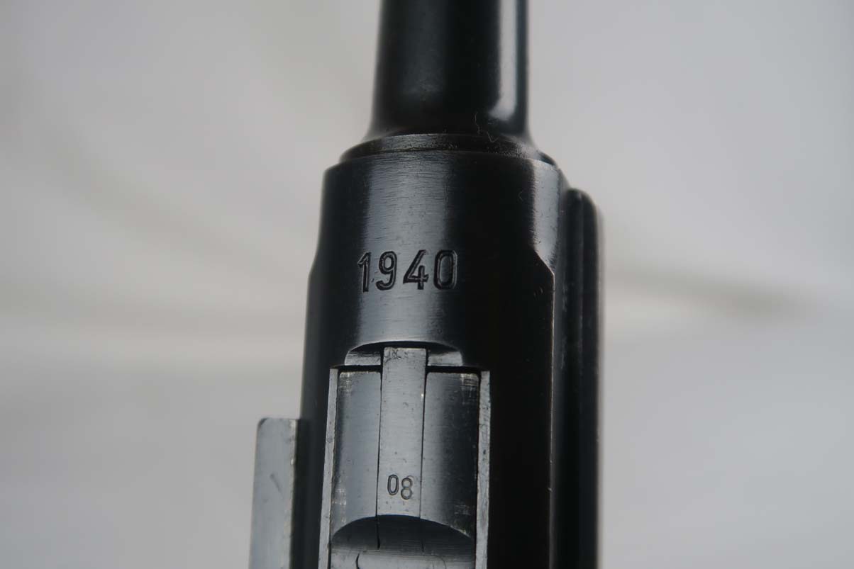 4/11/17 – This is a nice Mauser luger, produced in 1940 for use by the German army. It is all matching and correct, with ’42’ stamped on the toggle to denote it was made at the Mauser factory. The grips are E/655 proofed, numbered and matching to the pistol, and the magazine is period correct but numbered to another gun. The original finish is about 95%, with wear on the sideplate, high edges and the left side of the barrel near the muzzle. Grips are still in very good shape with no cracks or chips. Bore is minty.
