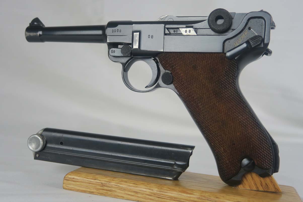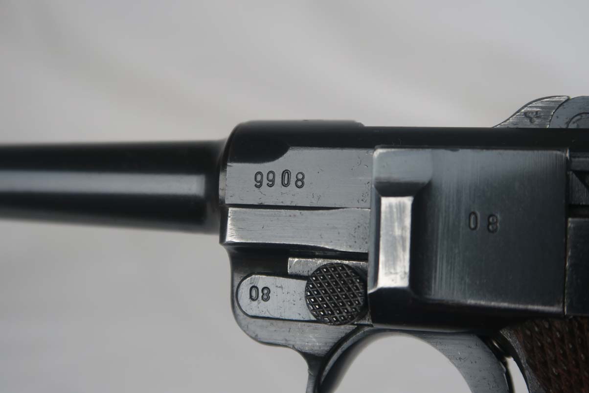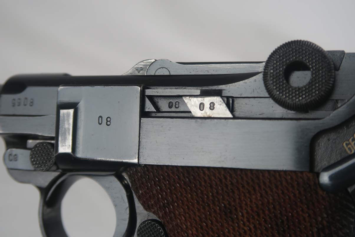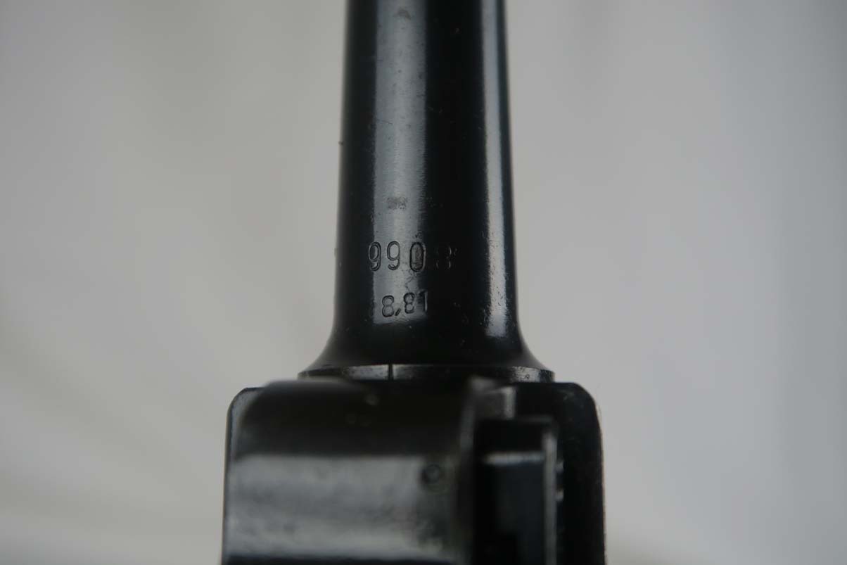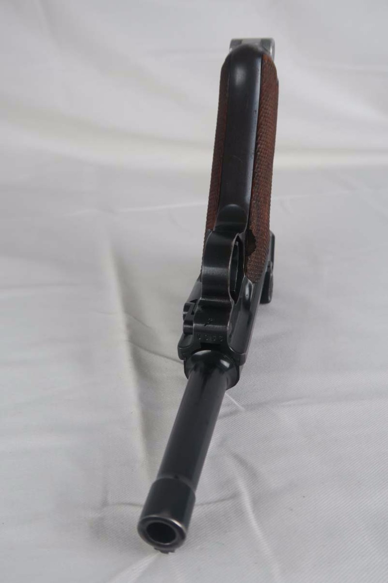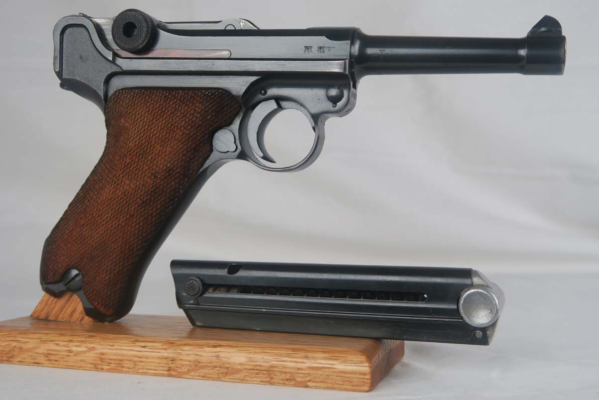 4/11/17 – This is a nice Mauser luger, produced in 1940 for use by the German army. It is all matching and correct, with ’42’ stamped on the toggle to denote it was made at the Mauser factory. The grips are E/655 proofed, numbered and matching to the pistol, and the magazine is period correct but numbered to another gun. The original finish is about 95%, with wear on the sideplate, high edges and the left side of the barrel near the muzzle. Grips are still in very good shape with no cracks or chips. Bore is minty.