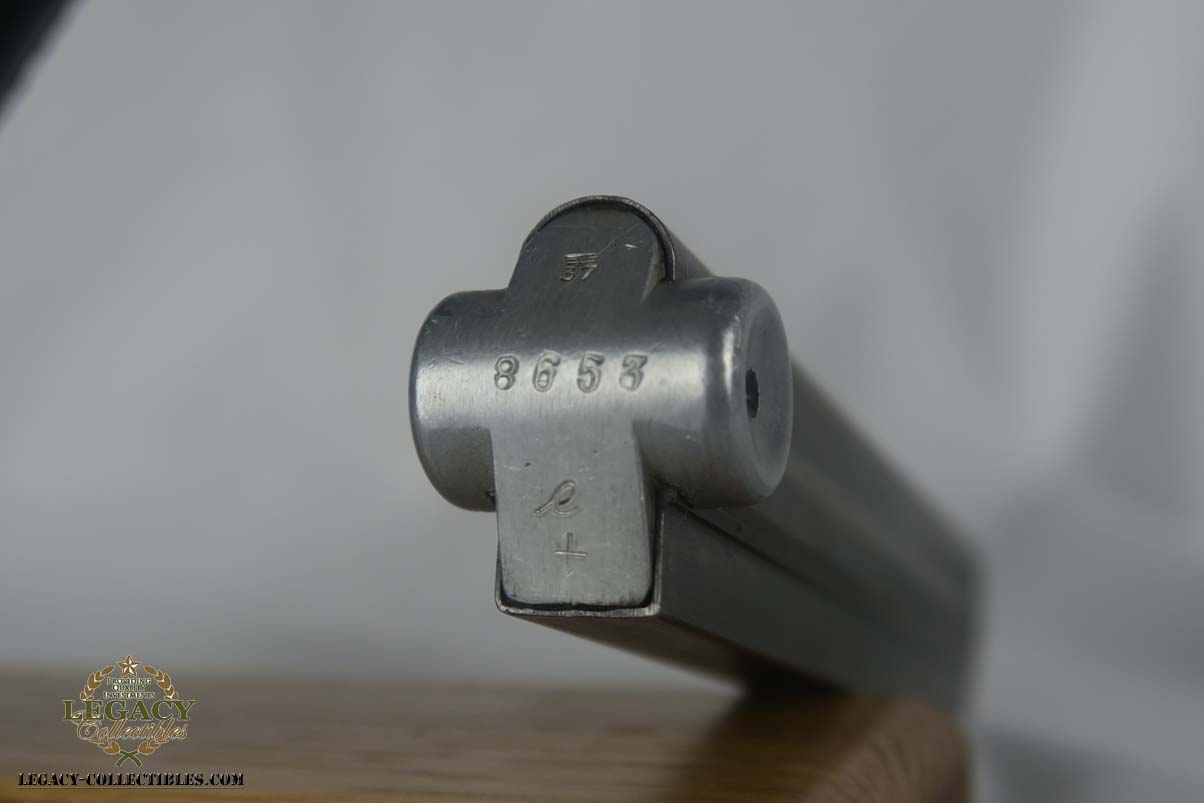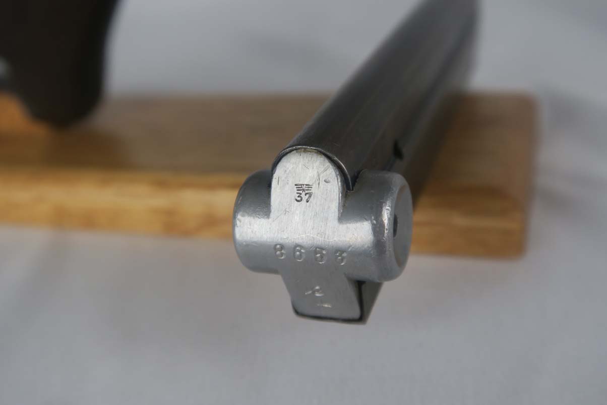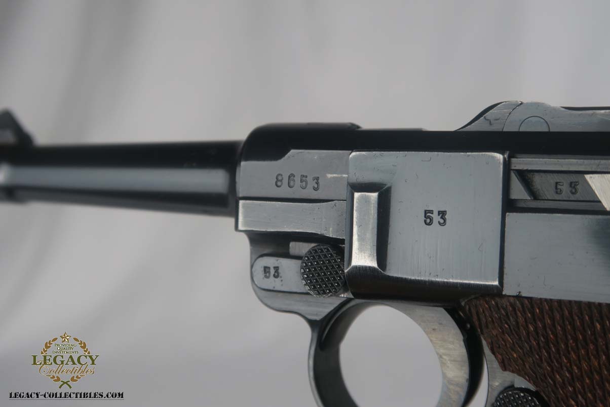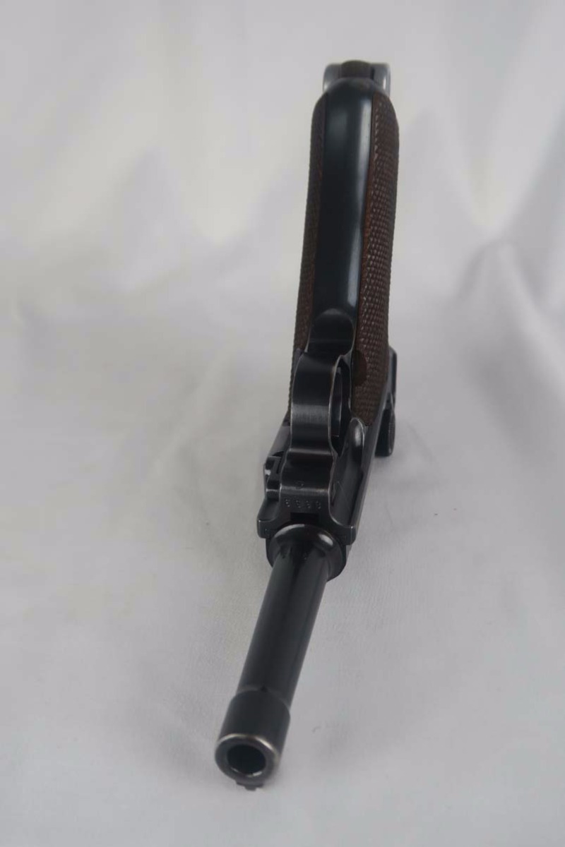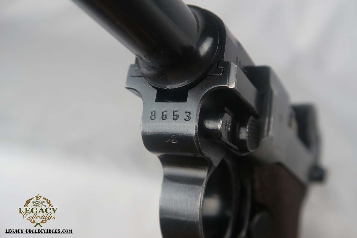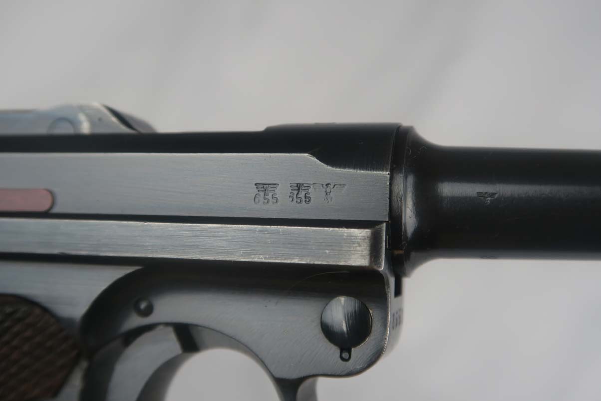 6/7/17 – This is an excellent 1940 Mauser luger, with ’42’ factory code on the toggle.  The original finish rates near 98%, with minor wear on the sideplate and left side of the barrel.  This pistol comes with the original matching magazine, and E/655 proofed grips that appear original to the pistol.  All small parts are numbered and matching, and externally blued as they should be.  Minty bore.