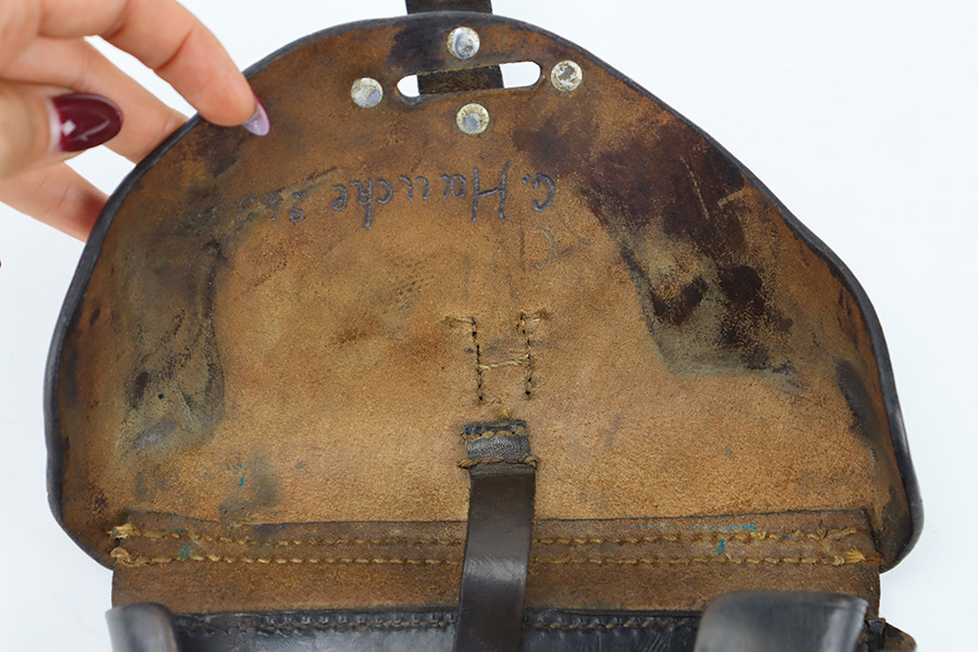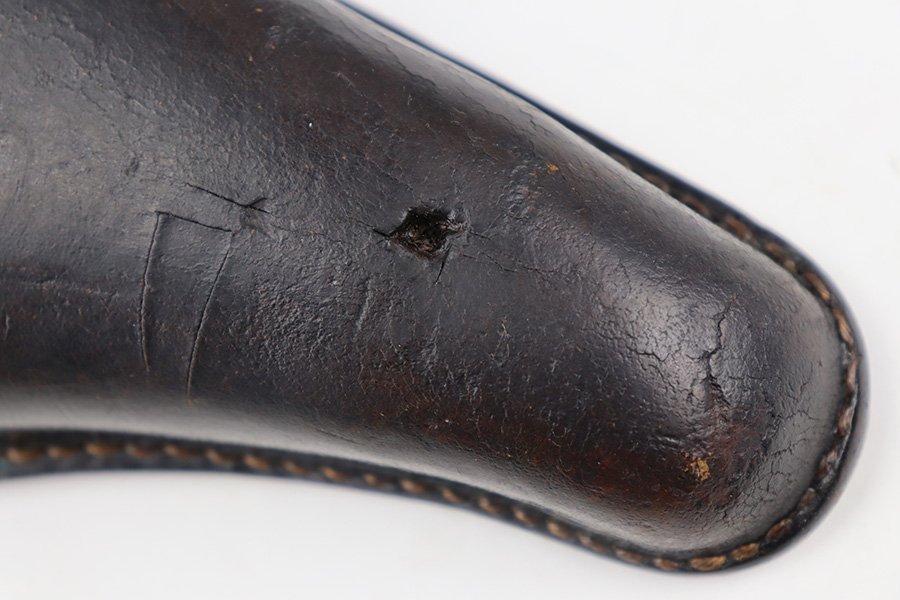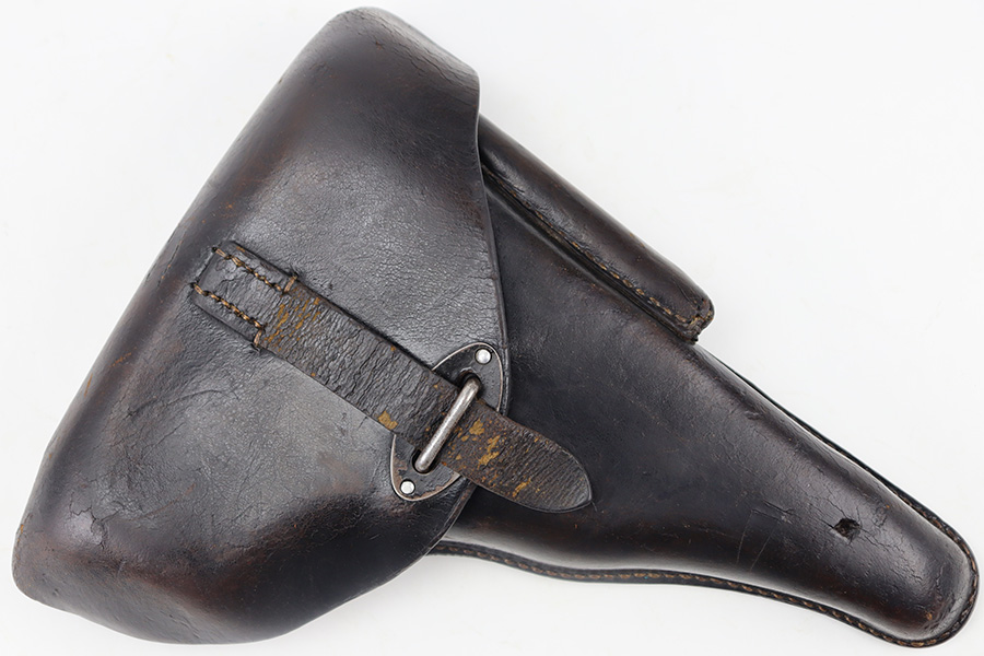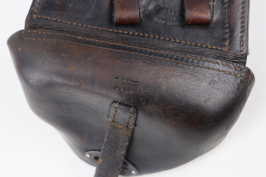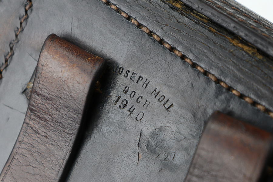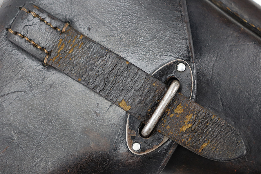11/30/23 – This is a 1940 dated holster for a CZ-39. These are also often found with P.38’s as the shape and style is similar and a P.38 fits nicely inside. This example is maker and date stamped on the back leather. There’s a very faint waffen military proof stamp next to these markings, but only the tail end of the waffen is visible (727). The leather has some surface scuffs and scratches. Most notable wear is found on the front leather near the toe where there’s a chunk of leather missing, this is not a hole however. Surface cracking on the closure strap, but it’s still intact and functional. All original stitching in great shape.
