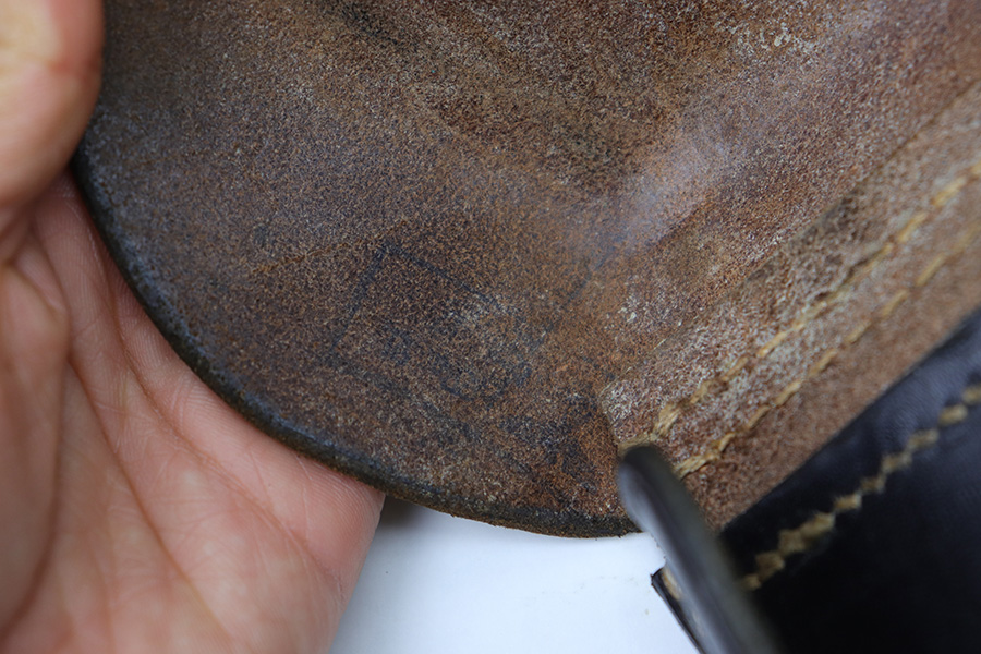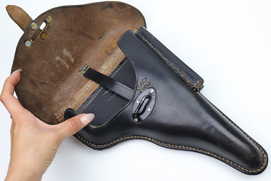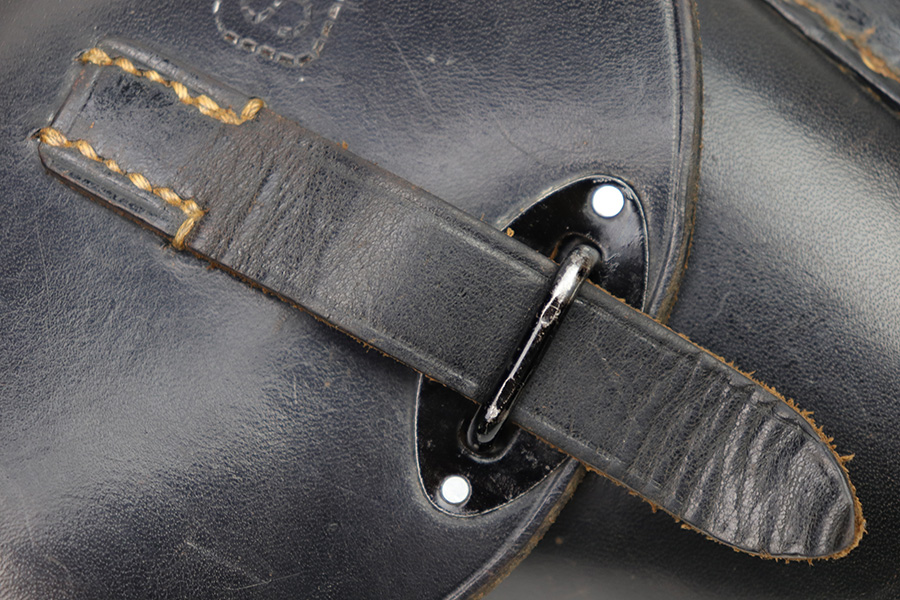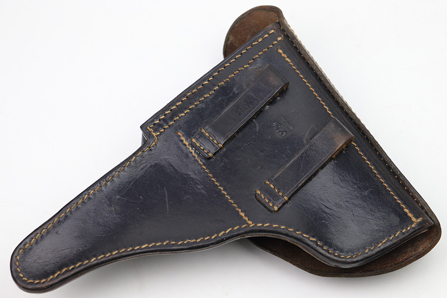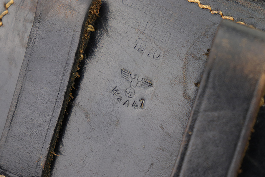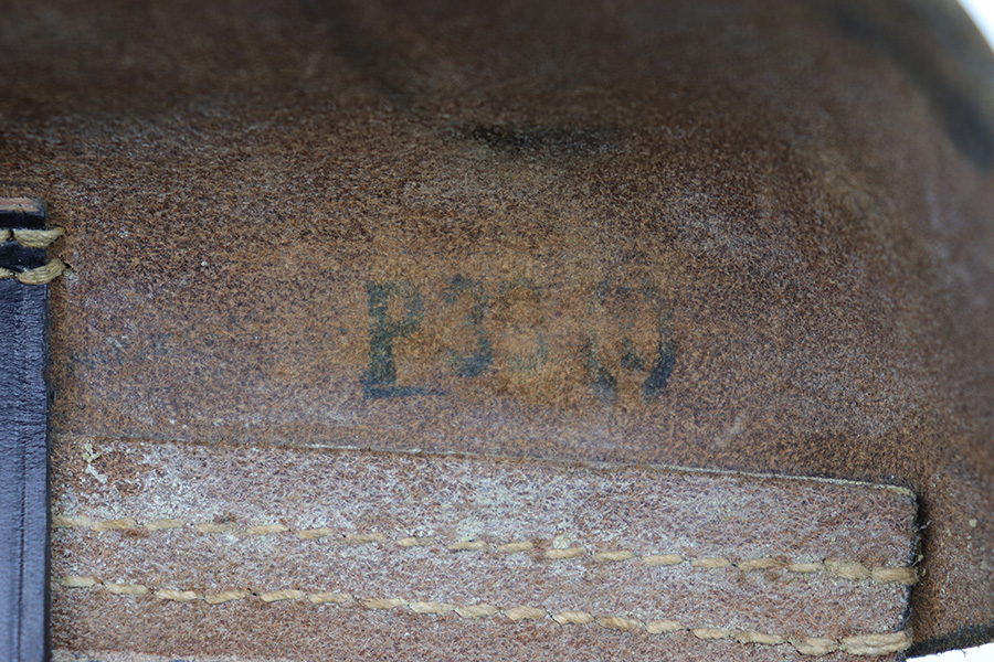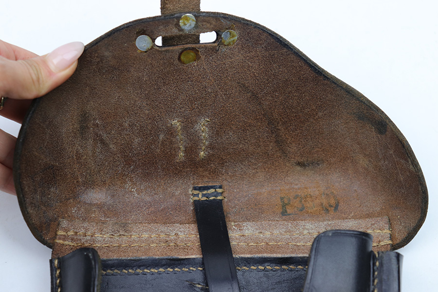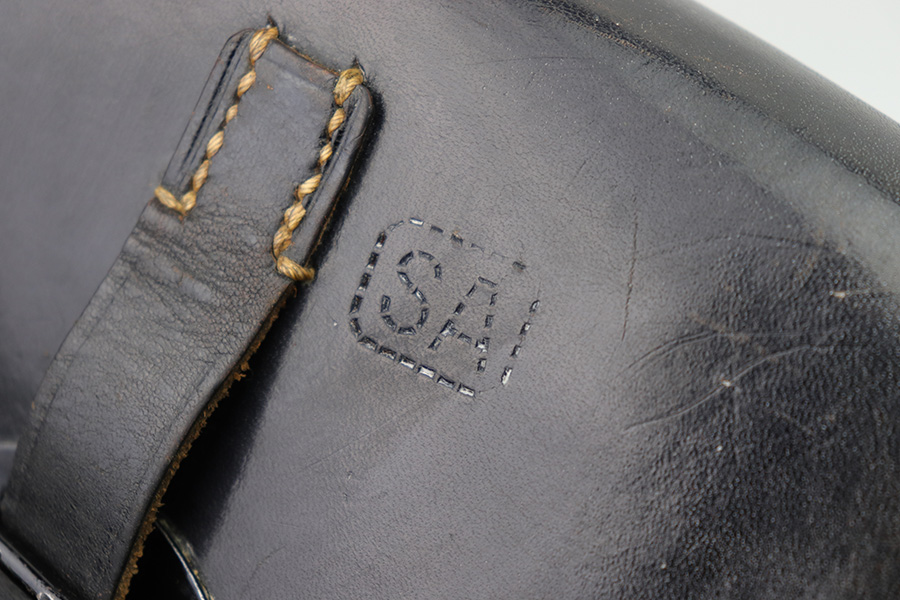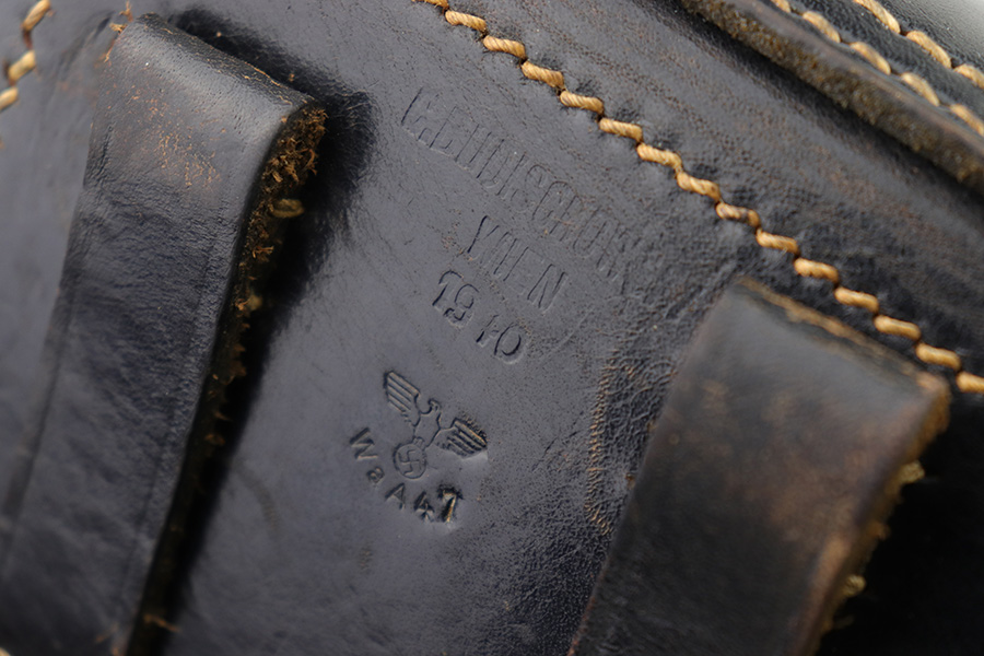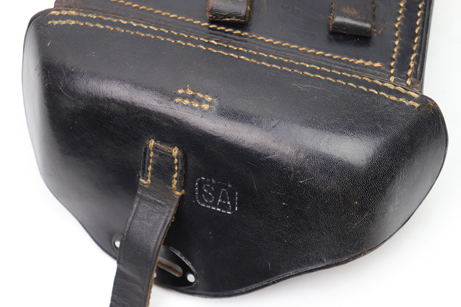 2/6/23 – This is an original 1940 dated holster for a CZ model 39 pistol from WW2. The holster looks just like a P.38 hard shell holster, except there’s no P.38 designation stamp on the back leather. Instead, there’s a P.(39)t ink stamp on the interior leather as shown. The leather is excellent and crisp with minimal pliability and some mild surface wear on the interior and exterior. No notable stitching issues and all original stitching. Maker stamped by a somewhat unusual maker on the back leather. Also date stamped and waffen military proof stamped. There’s an added “SA” stamp added to the front leather as shown – we’re not sure the significance as this was added post-factory.