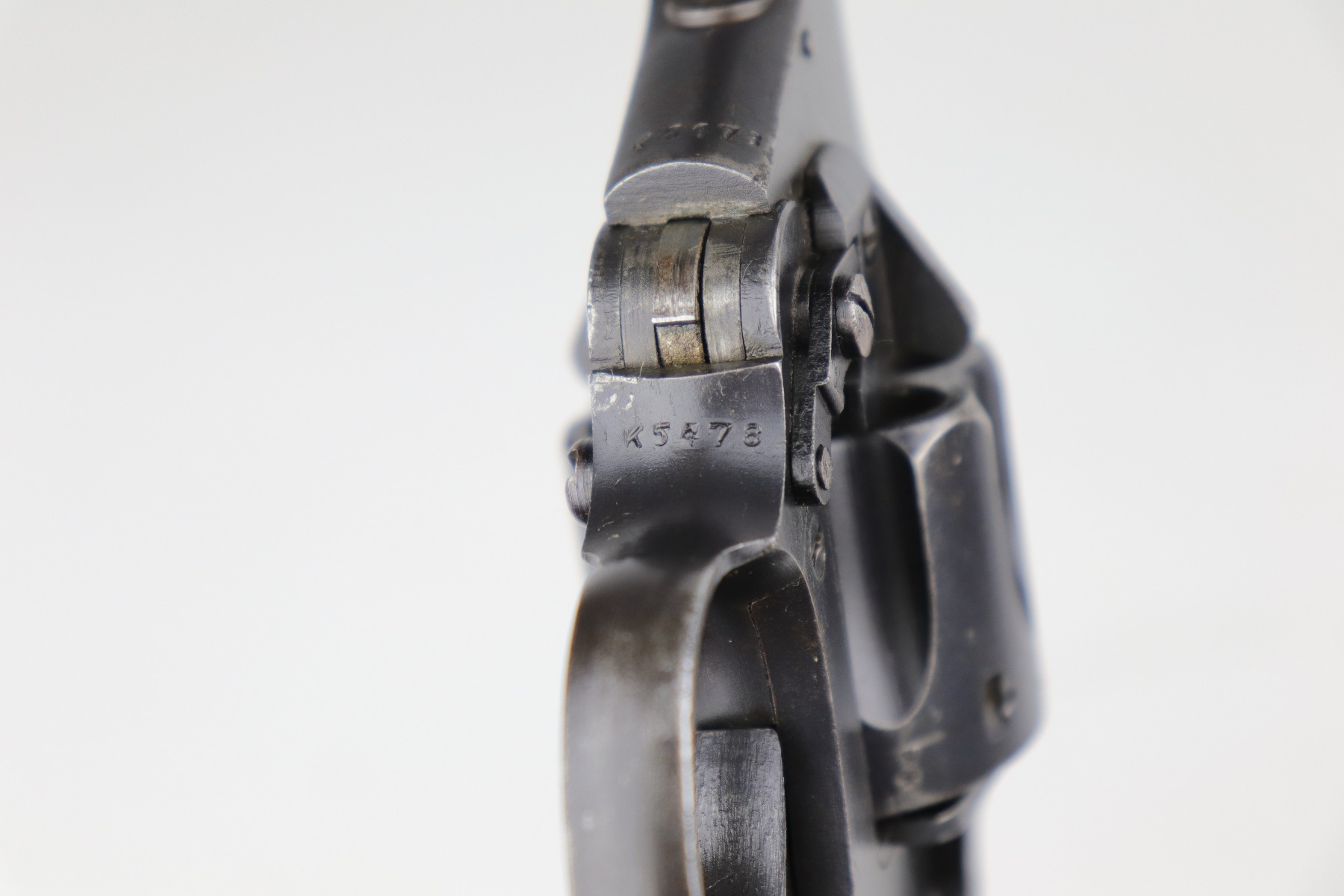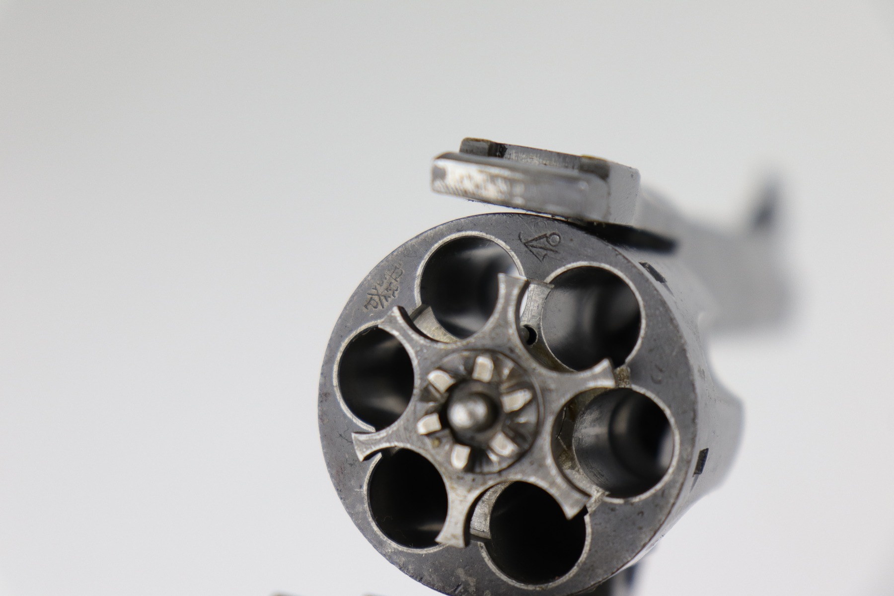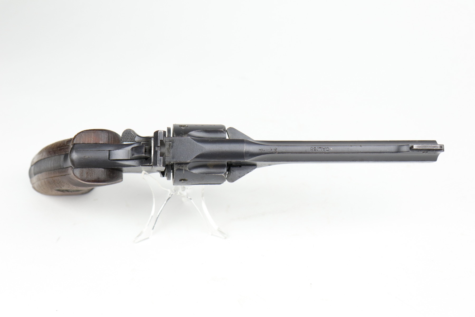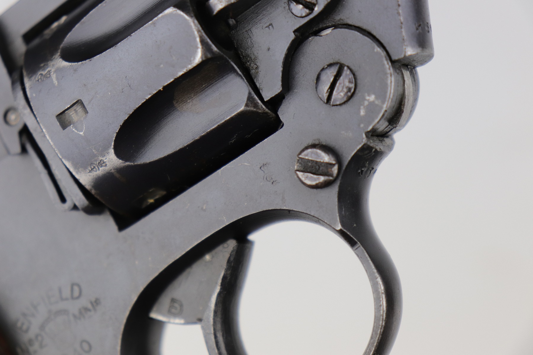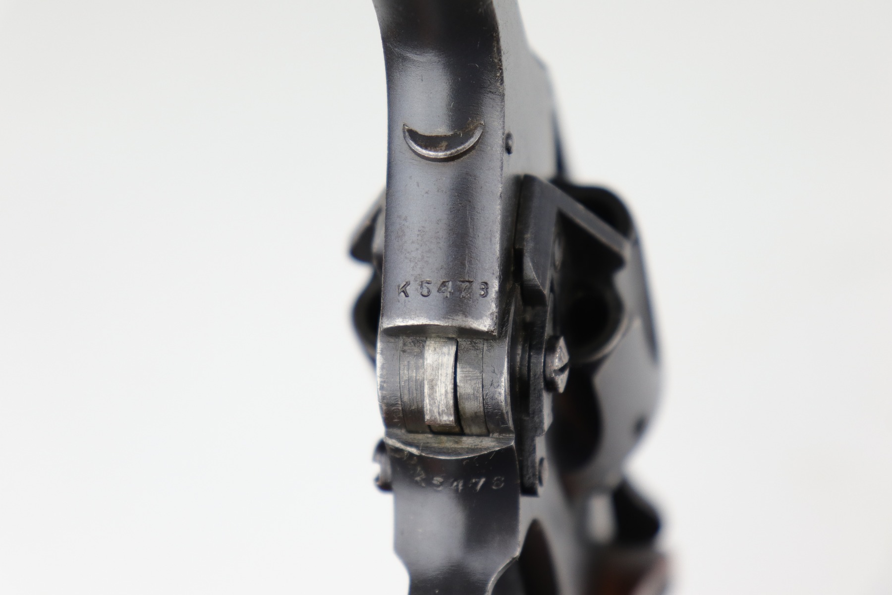 8/12/20 – This an original Enfield No. 2 Mk I revolver rig, manufactured in 1940. This particular gun has all matching serial numbers and has retained about 95% of its original finish. There is light pitting on both sides of the barrel and on the cylinder. There is minor wear on the high edges of the cylinder and a light roll mark. Minor oxidation on the underside of the trigger guard. A couple of light scratches on the butt. Very nice original grips – just a few minor dings. Very nice bore – shiny with strong rifling. There a few small spots of very minor pin-pricking. Comes with a period-correct leather holster. There are no markings.