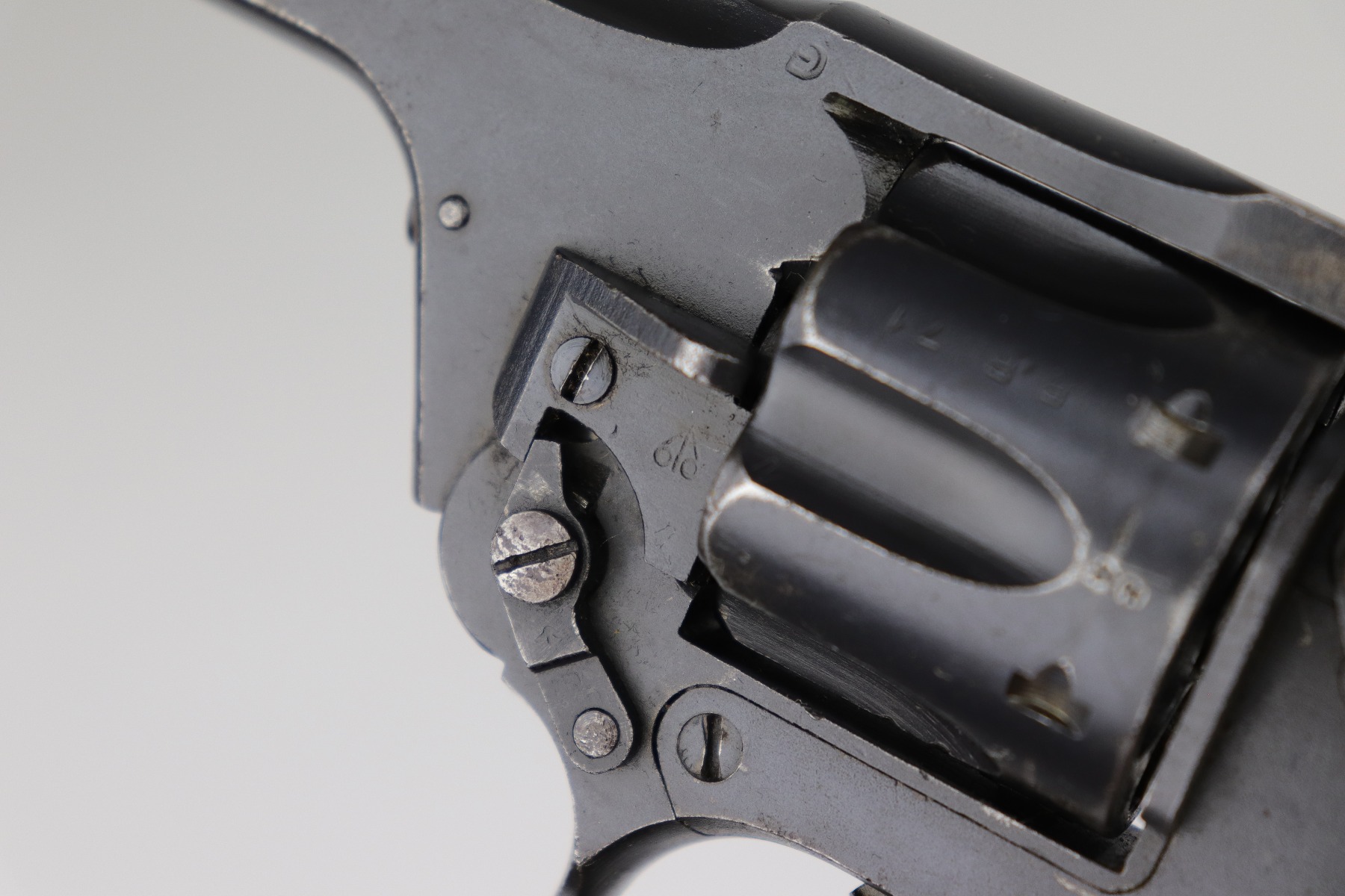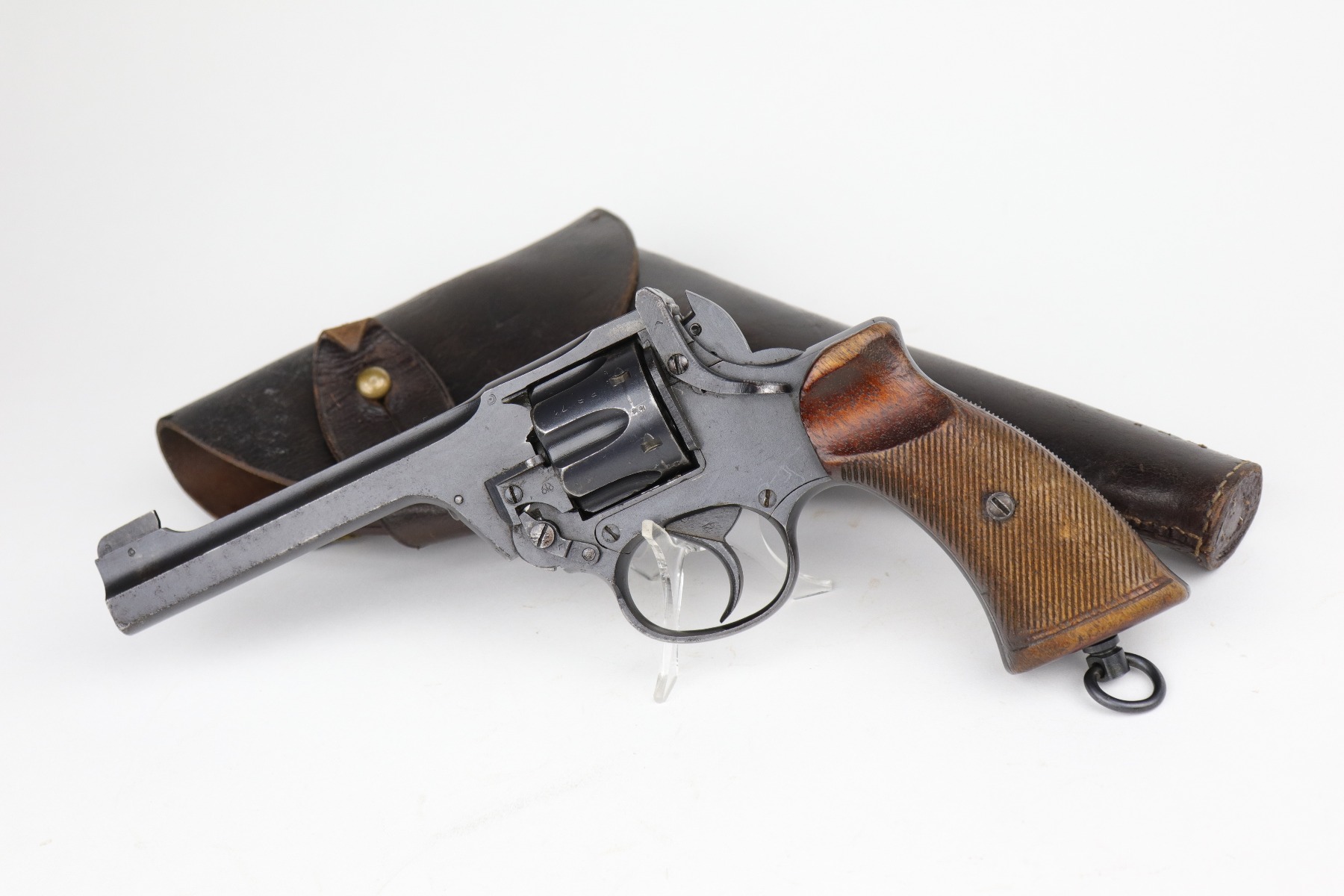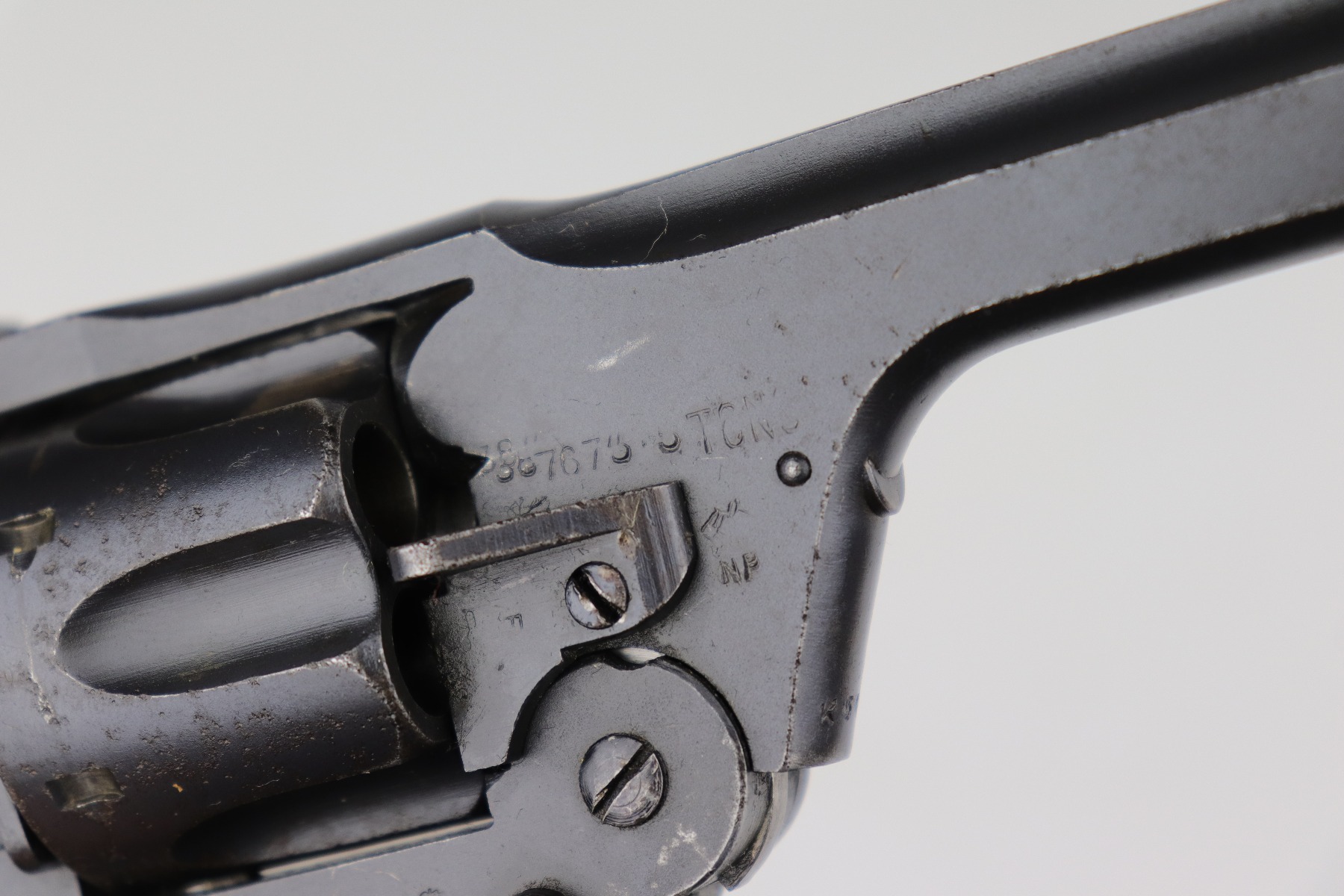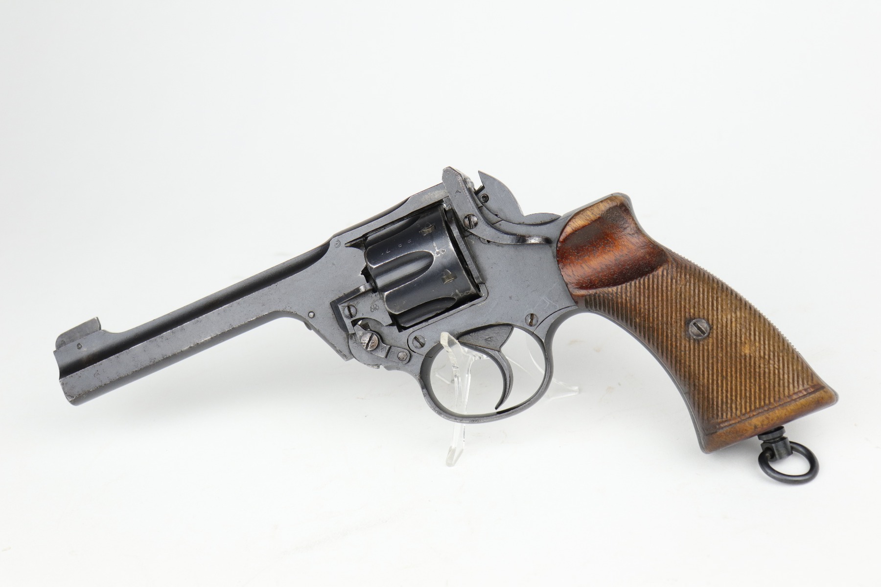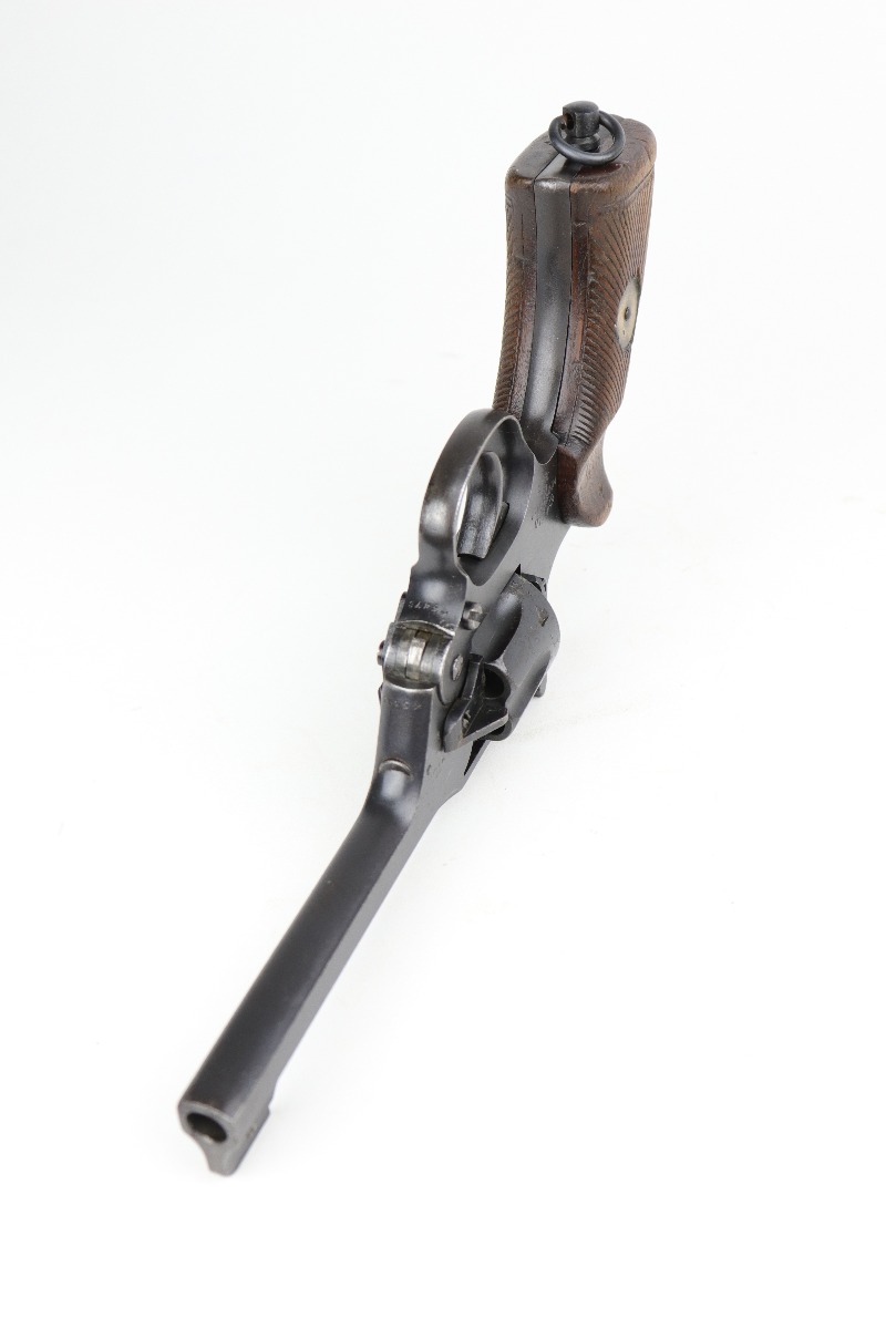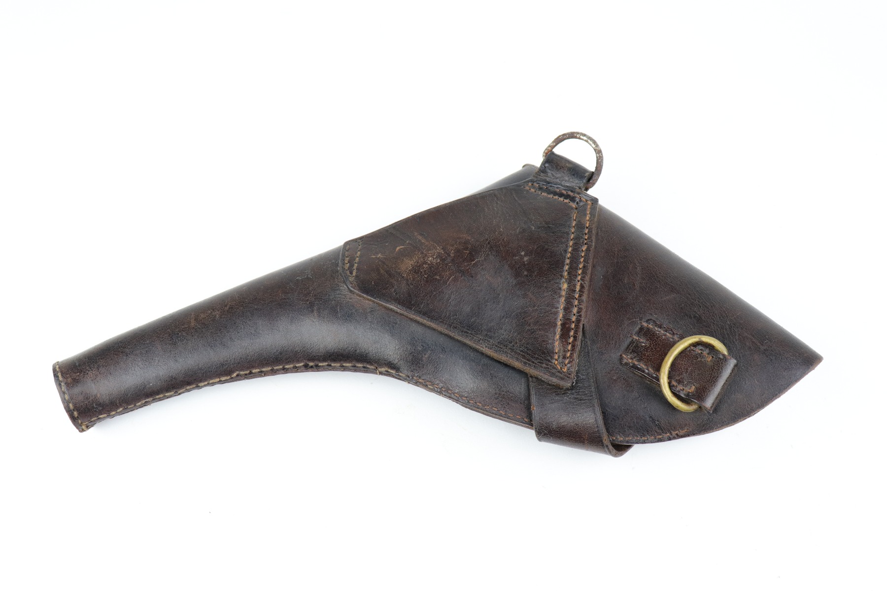8/12/20 – This an original Enfield No. 2 Mk I revolver rig, manufactured in 1940. This particular gun has all matching serial numbers and has retained about 95% of its original finish. There is light pitting on both sides of the barrel and on the cylinder. There is minor wear on the high edges of the cylinder and a light roll mark. Minor oxidation on the underside of the trigger guard. A couple of light scratches on the butt. Very nice original grips – just a few minor dings. Very nice bore – shiny with strong rifling. There a few small spots of very minor pin-pricking. Comes with a period-correct leather holster. There are no markings.