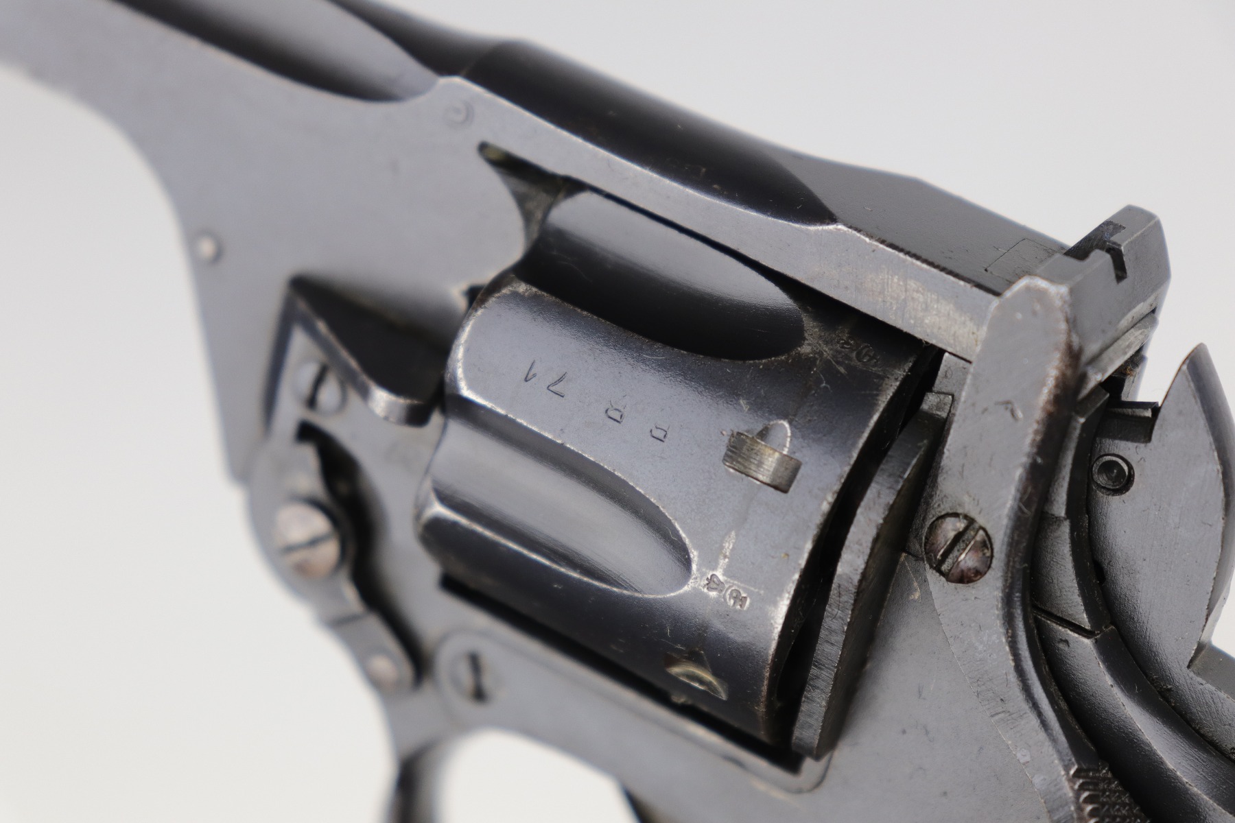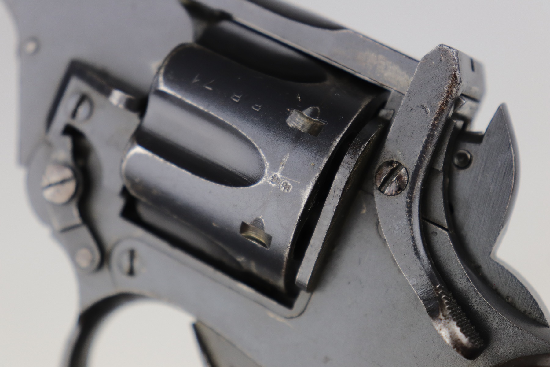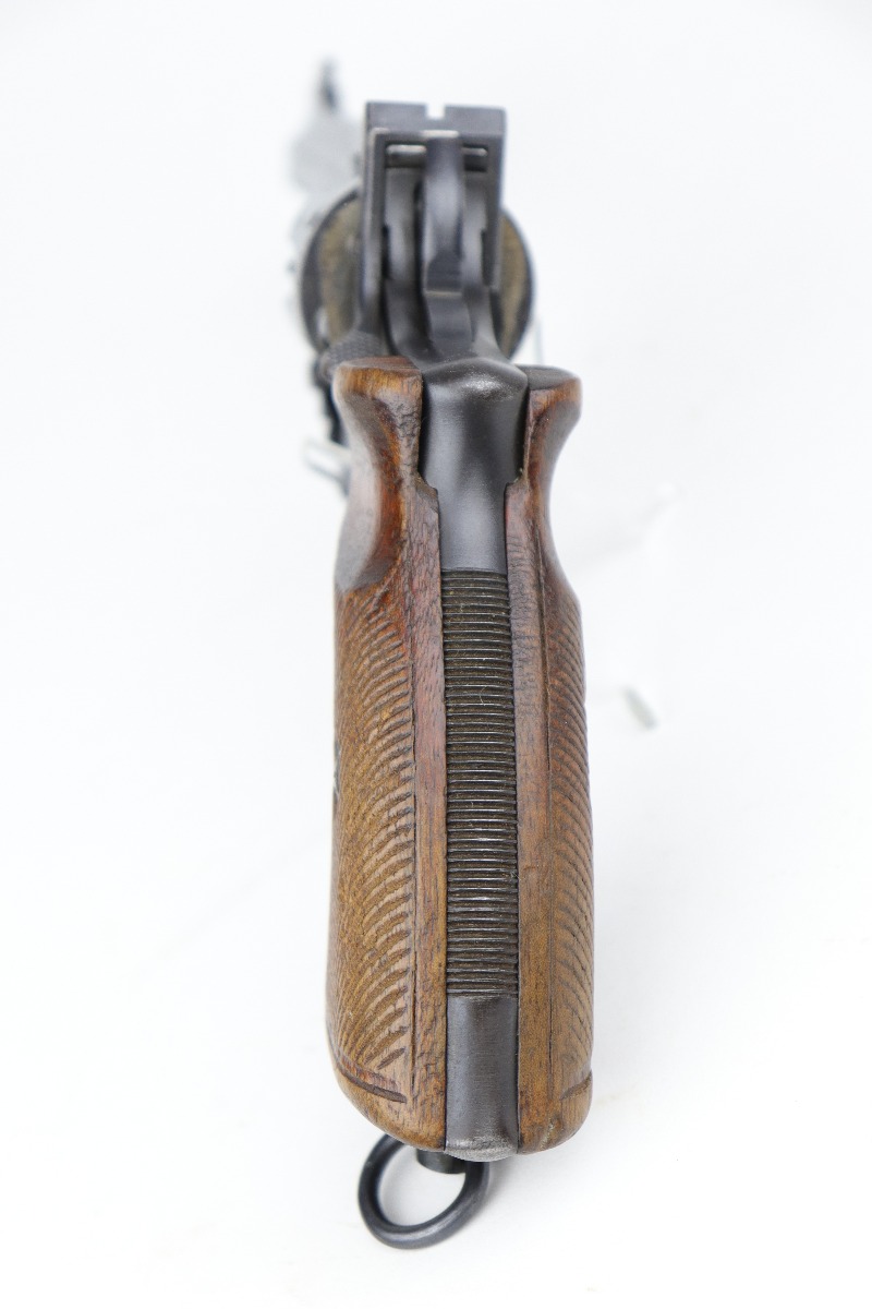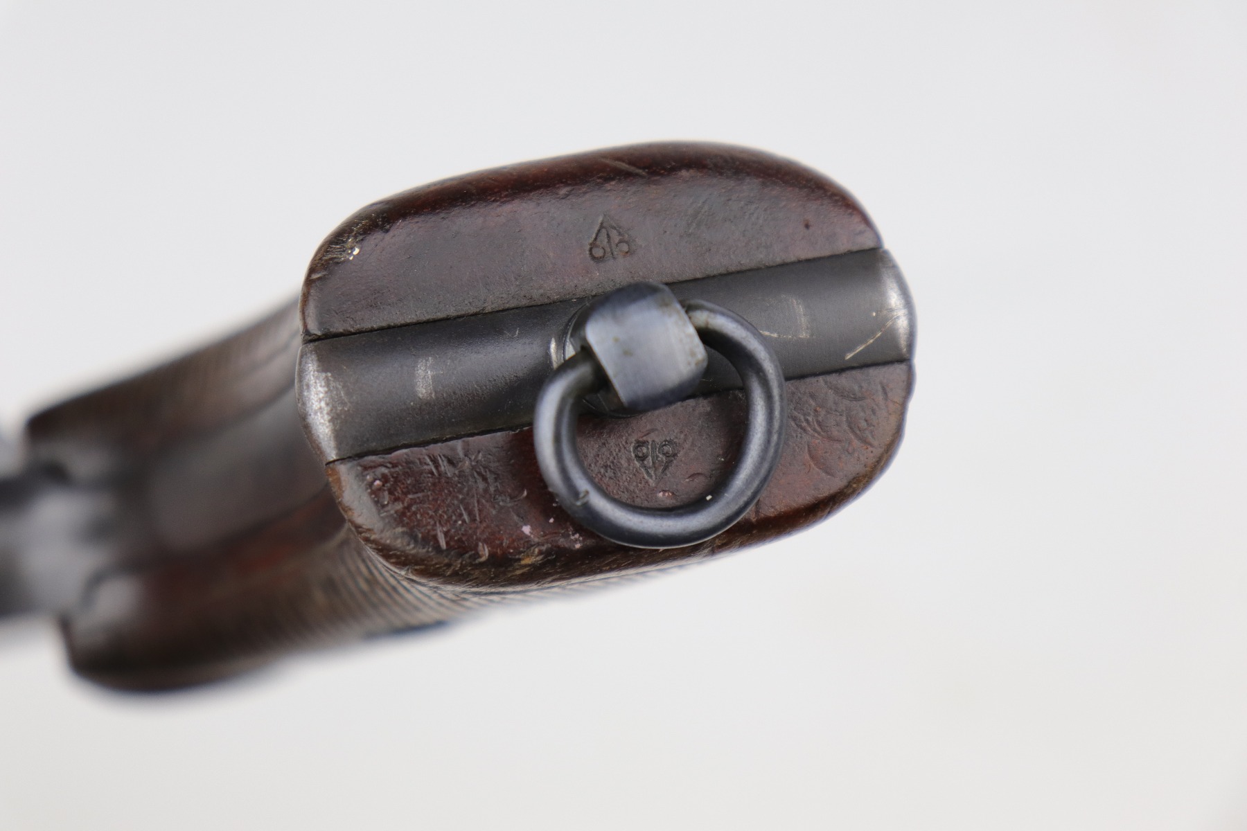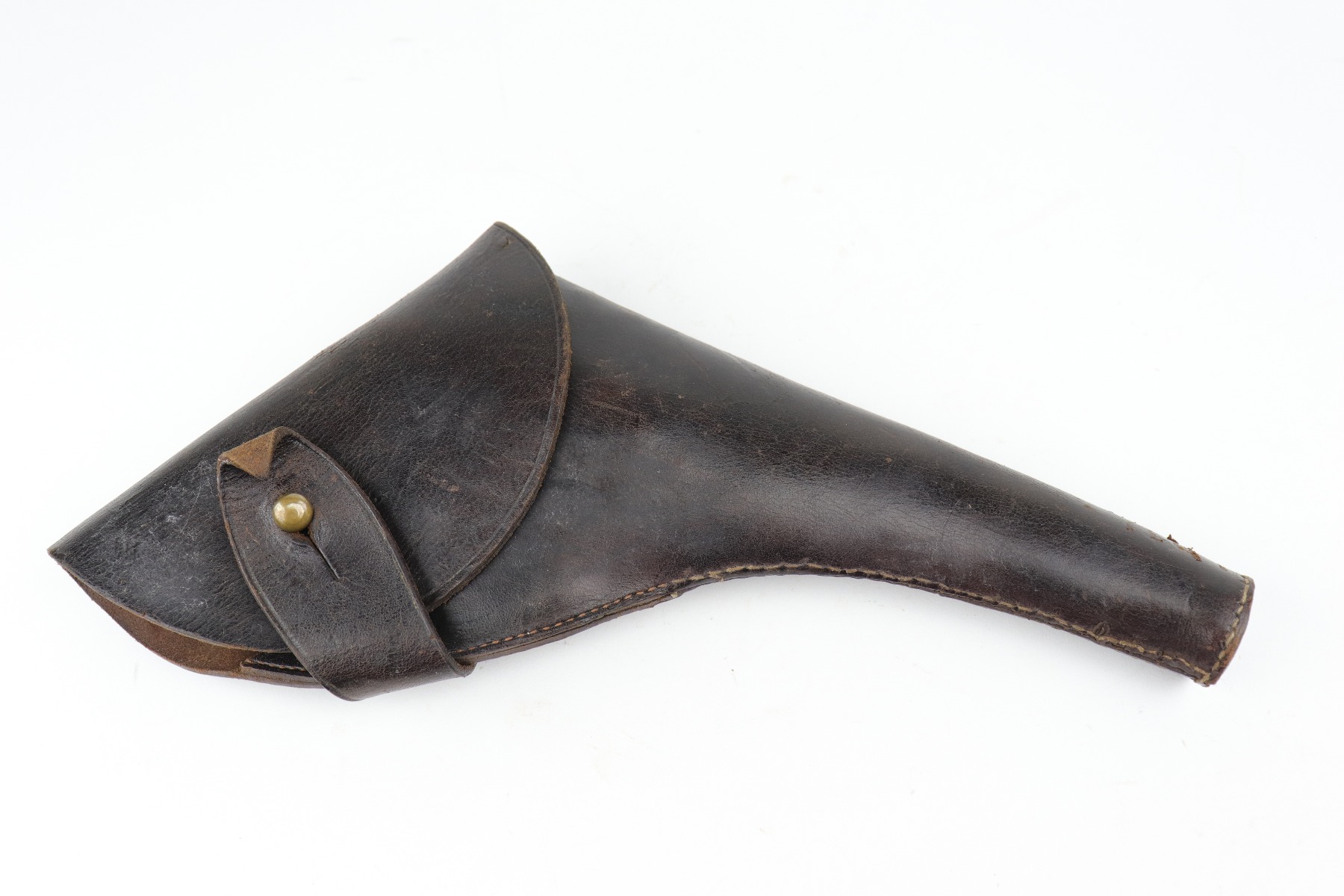 8/12/20 – This an original Enfield No. 2 Mk I revolver rig, manufactured in 1940. This particular gun has all matching serial numbers and has retained about 95% of its original finish. There is light pitting on both sides of the barrel and on the cylinder. There is minor wear on the high edges of the cylinder and a light roll mark. Minor oxidation on the underside of the trigger guard. A couple of light scratches on the butt. Very nice original grips – just a few minor dings. Very nice bore – shiny with strong rifling. There a few small spots of very minor pin-pricking. Comes with a period-correct leather holster. There are no markings.
