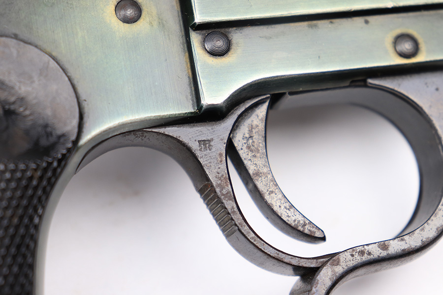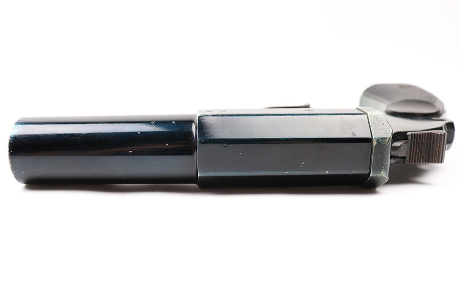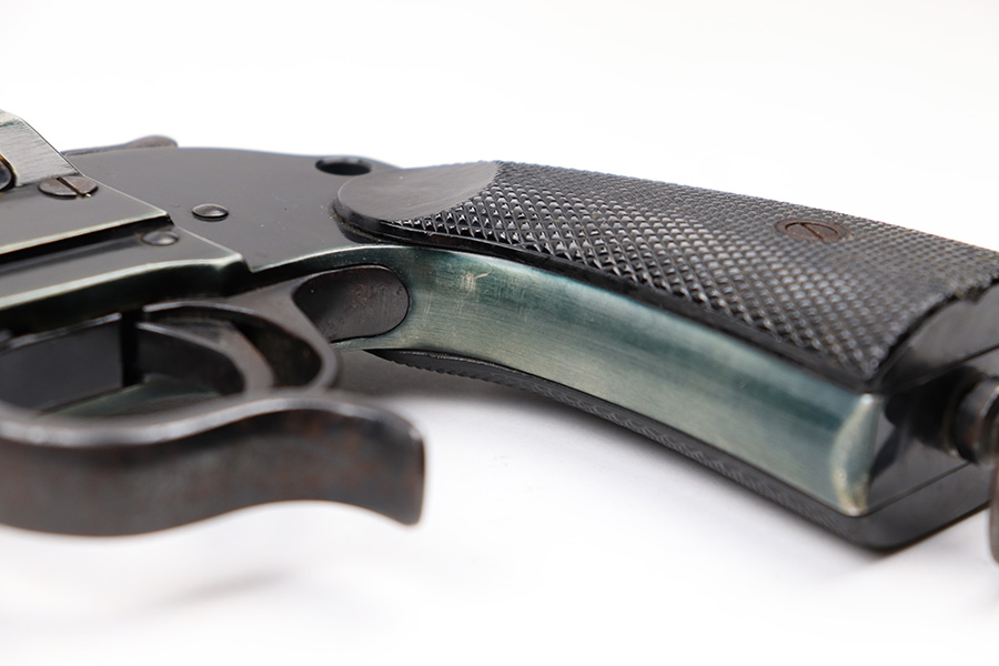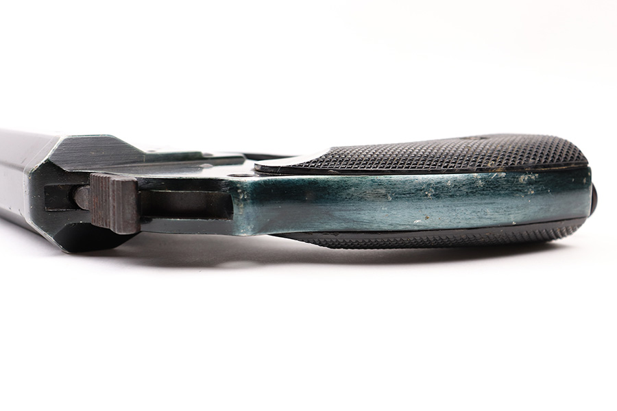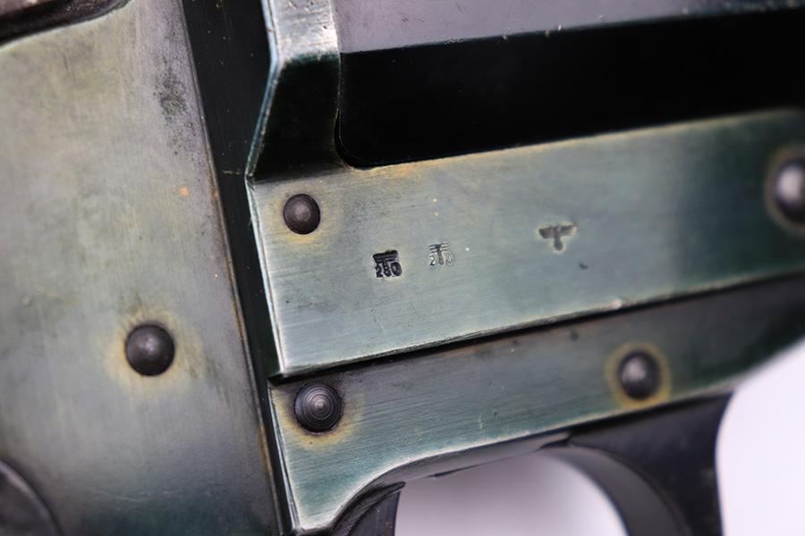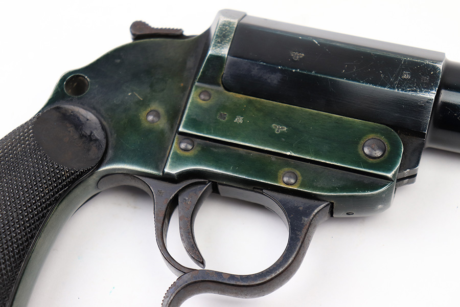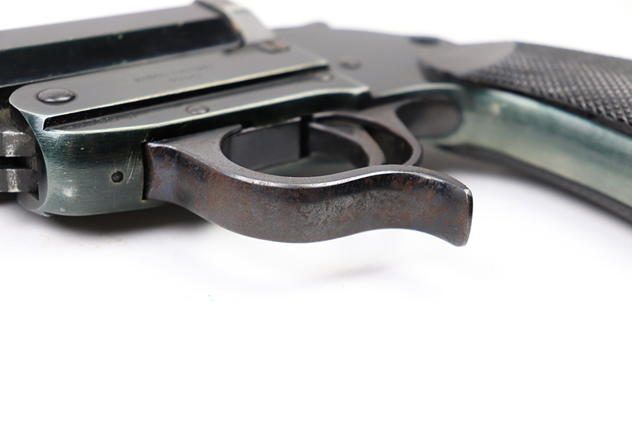 6/22/22 – This is an original Erma-Erfurt LP34 Flare Pistol made during 1940. The pistol has a duraluminum finish which results in an interesting array of blue and green coloring depending on the light. There is some normal edge wear and muzzle wear as well as thinning on the front and back straps. There’s speckling and mild surface rust on the trigger guard. The pistol is fully functional with a smooth action and has matching numbered parts. All small parts are properly proof stamped. The bore has some mild patina but no major issues.