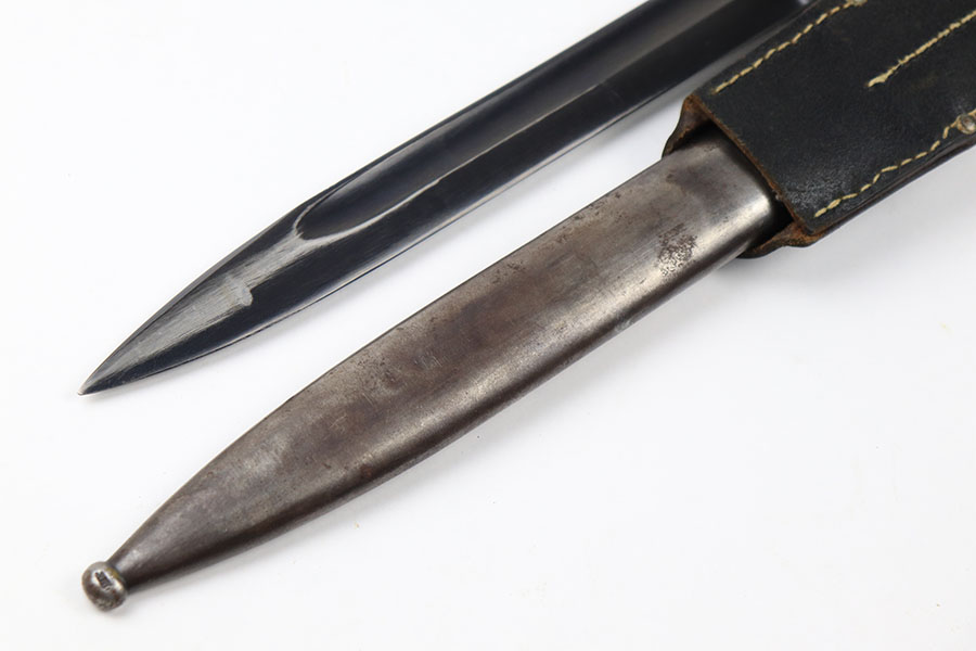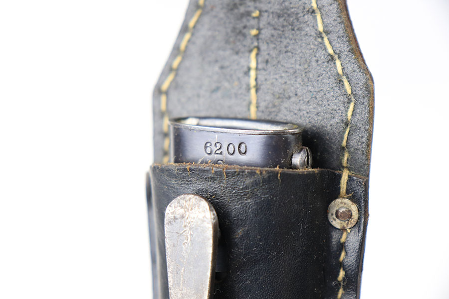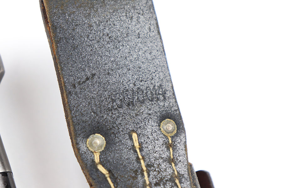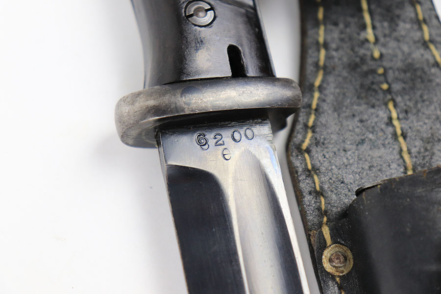 9/3/21 – This is a very nice, original K98 bayonet from 1940 with a matching numbered scabbard. Also comes with a black leather frog that’s unit number stamped on the back leather. The bayonet blade is numbered 6200e with the “6” being a double-stamp. The reverse is maker stamped. The blade has excellent bluing throughout with some missing finish near the tip. Mild patina on the metal pommel. The scabbard has almost all of the finish gone, and a few very minor dents along with spotty patina discoloration.