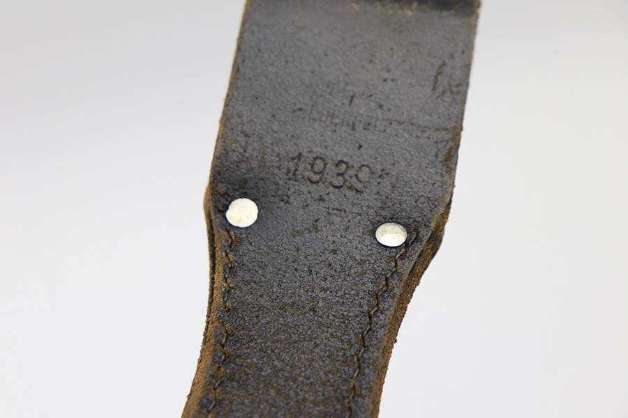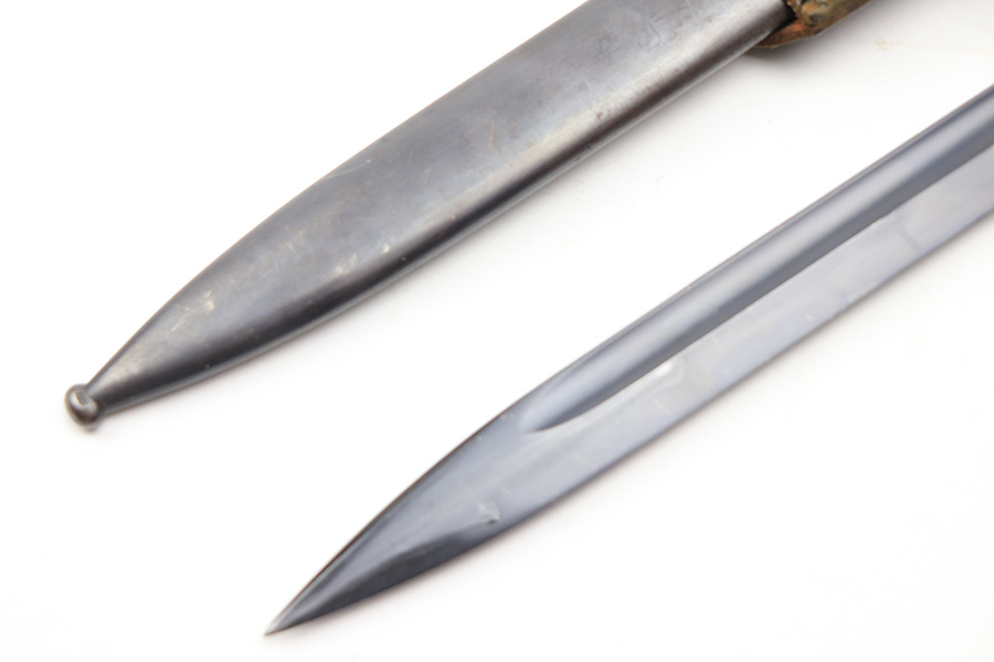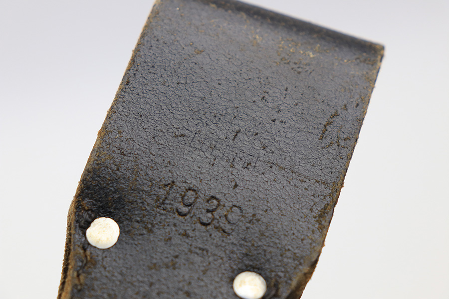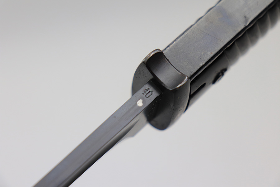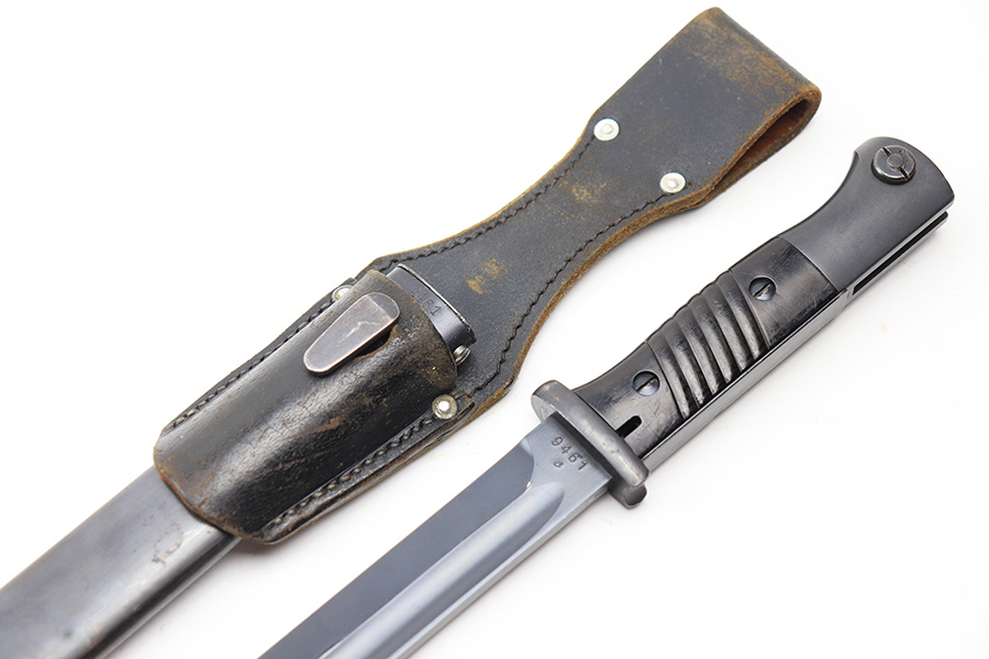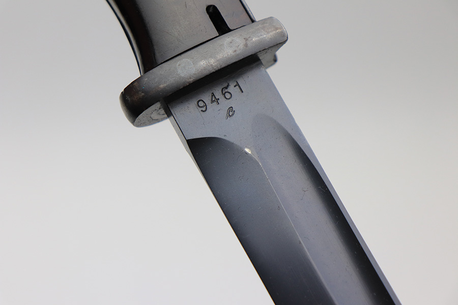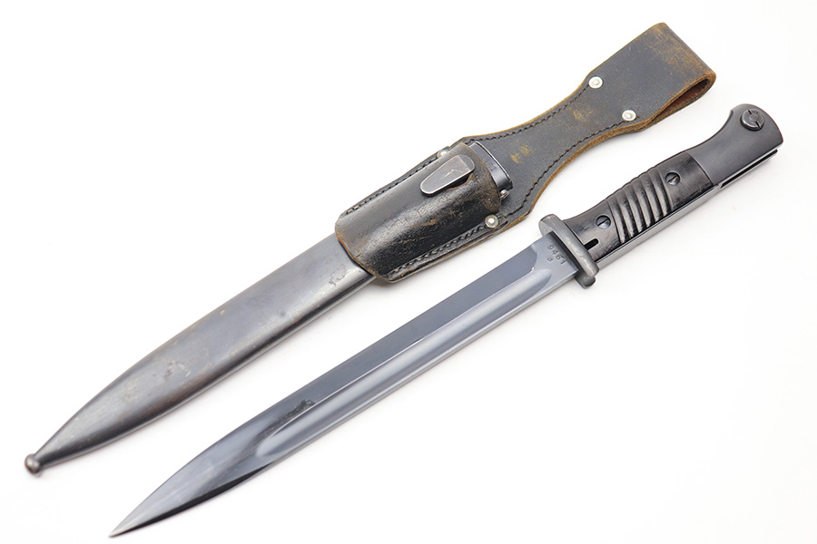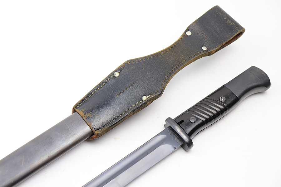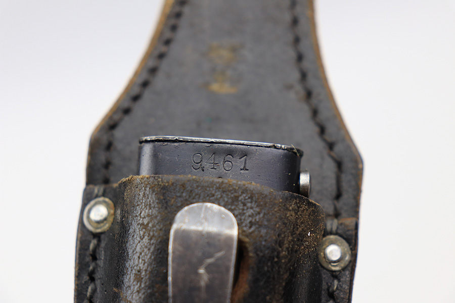 2/18/22 – This is an original 1940 dated K98 bayonet with a matching scabbard and black leather frog. The bayonet has a beautifully blued blade that’s in excellent condition. No signs of sharpening and no significant finish loss. Maker stamped, serial numbered, and date stamped on the spine. The grips are in great shape as well, and the metal portions of the handle have some mild patina. The scabbard has thinning throughout and a few very minor dents but no major issues. The frog is maker stamped and 1939 dated on the back leather.