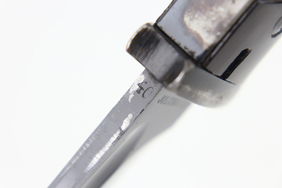 12/27/23 – This is an original 1940 dated K98 bayonet with an original matching numbered scabbard. The bayonet is in great overall condition, with an excellent condition blade. The blade retains most of the original finish with some light scabbard rub wear and no signs of sharpening along the edge. The base of the blade is maker marked by Jos. Corts, which reportedly made ~80,000 K98 bayonets in 1940. The other side of the blade is serial numbered 5983, and the spine is date marked “40”. Normal patina on the pommel and hand guard, and a nice original grip. The scabbard has light patina and finish loss throughout, but no dents and fits the blade nicely. Matching numbered on one side, and maker stamped with a 1940 date on the other side.