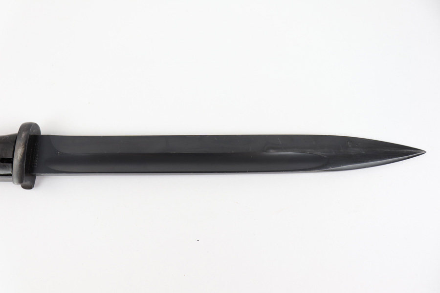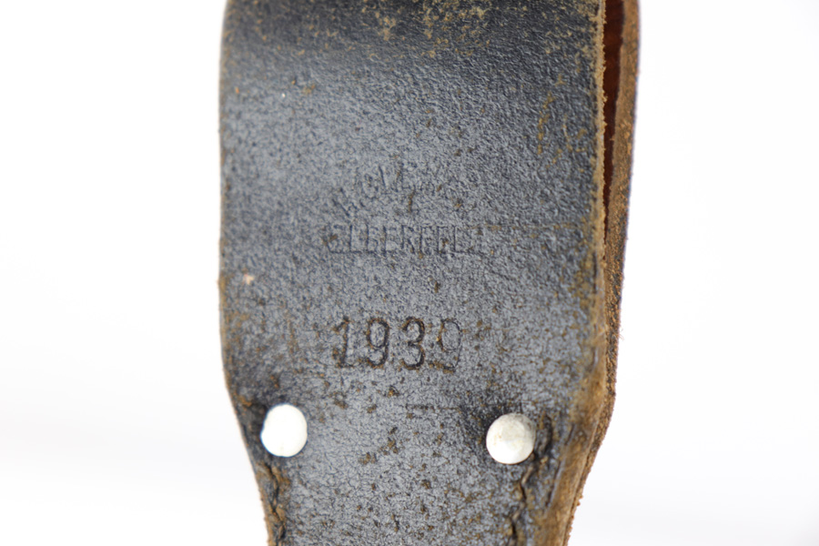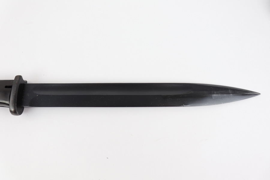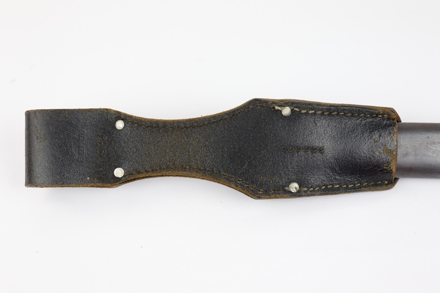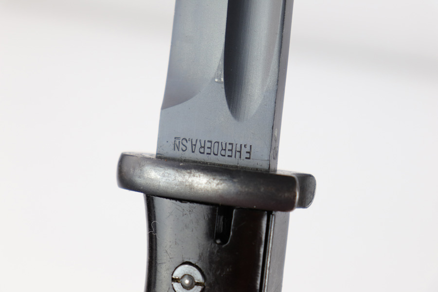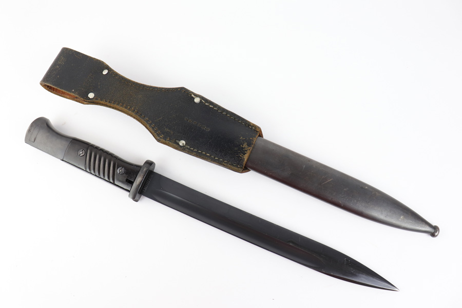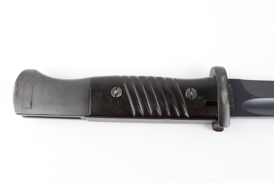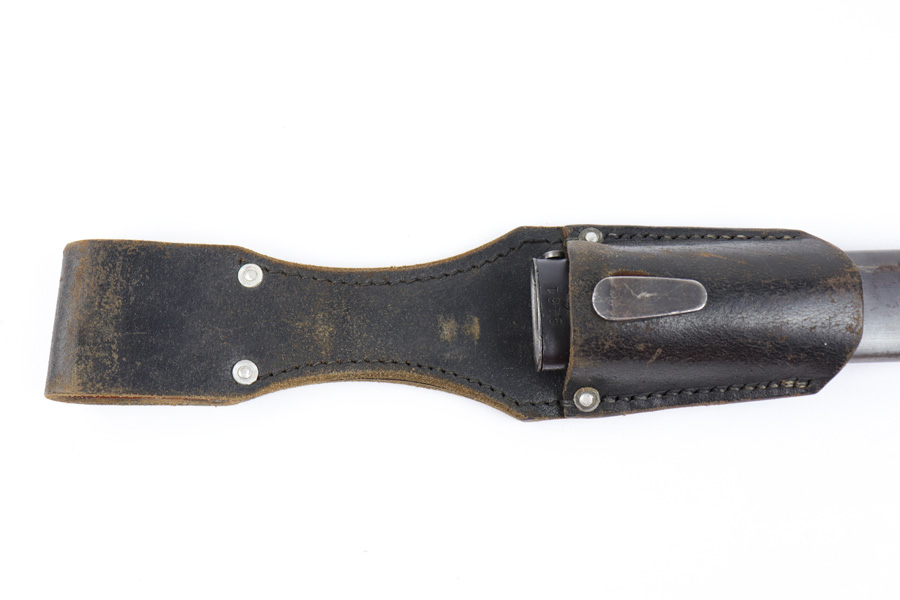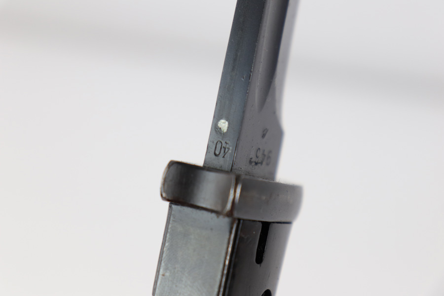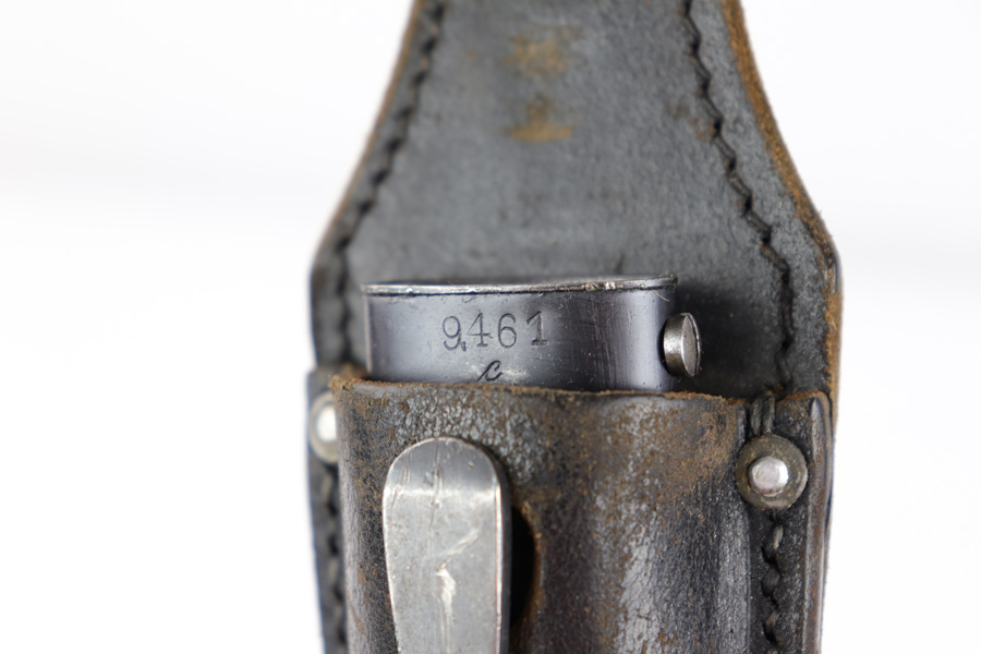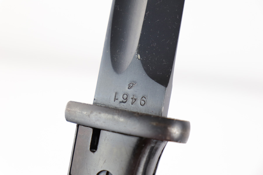5/20/19 – This is a minty, all original K98 rifle bayonet. The bayonet is complete with the original scabbard and leather frog. The frog is dated 1939 and maker stamped on the back leather (the maker stamp is faint). The scabbard has browning patina throughout and minor finish loss, but is all original with no dents. The scabbard is matching to the blade. The bayonet itself is beautiful with excellent finish on the blade and no signs of sharpening. Serial numbered “9461c” and maker stamped on the reverse side. All original and correct with a “40” date stamp on the spine.