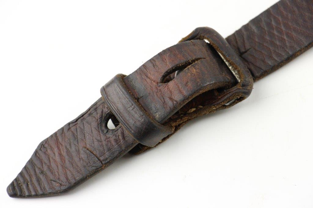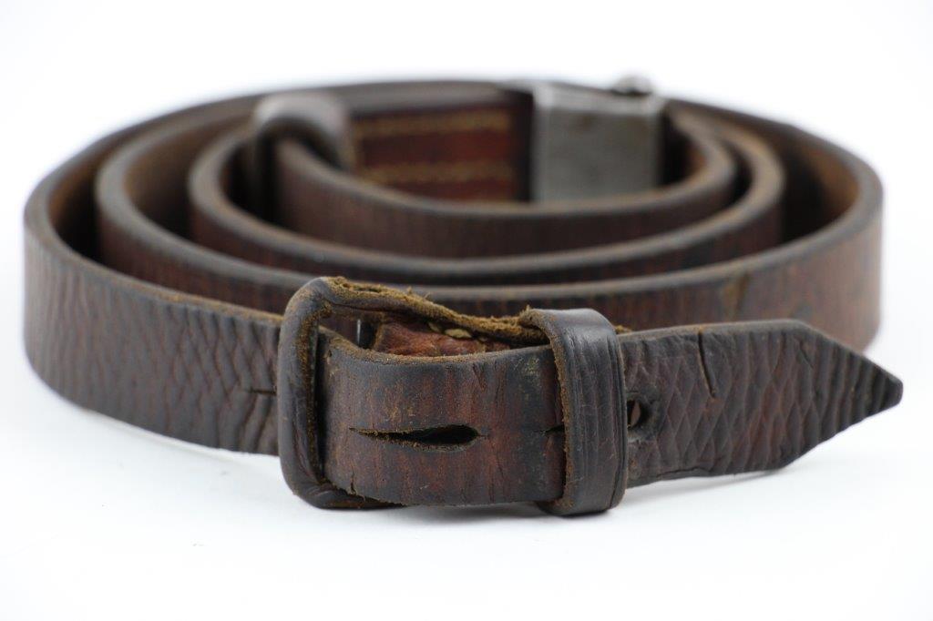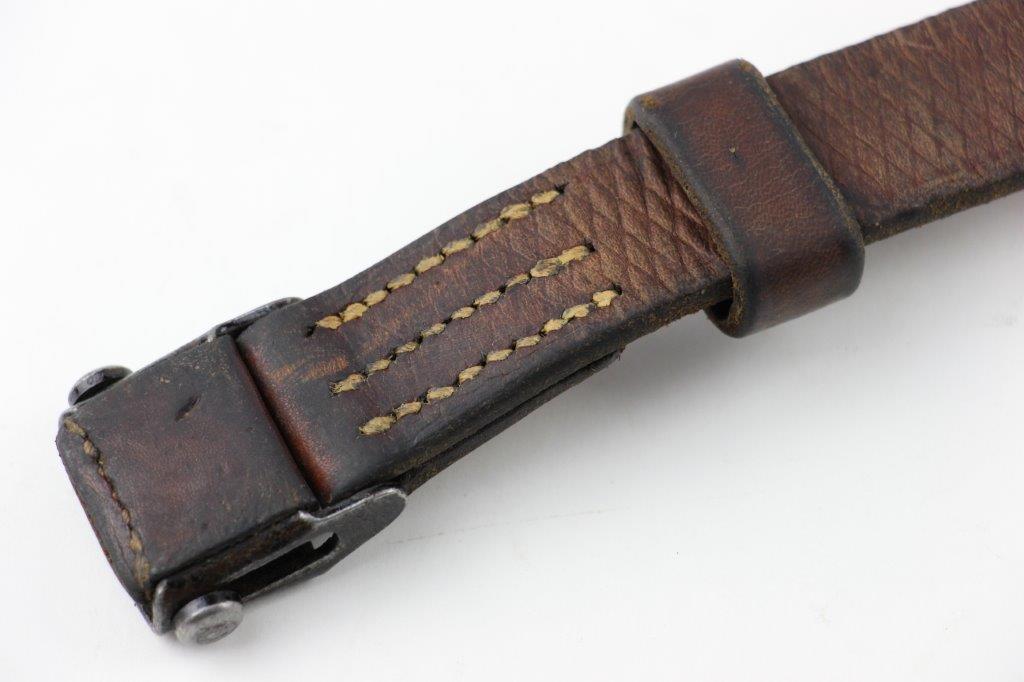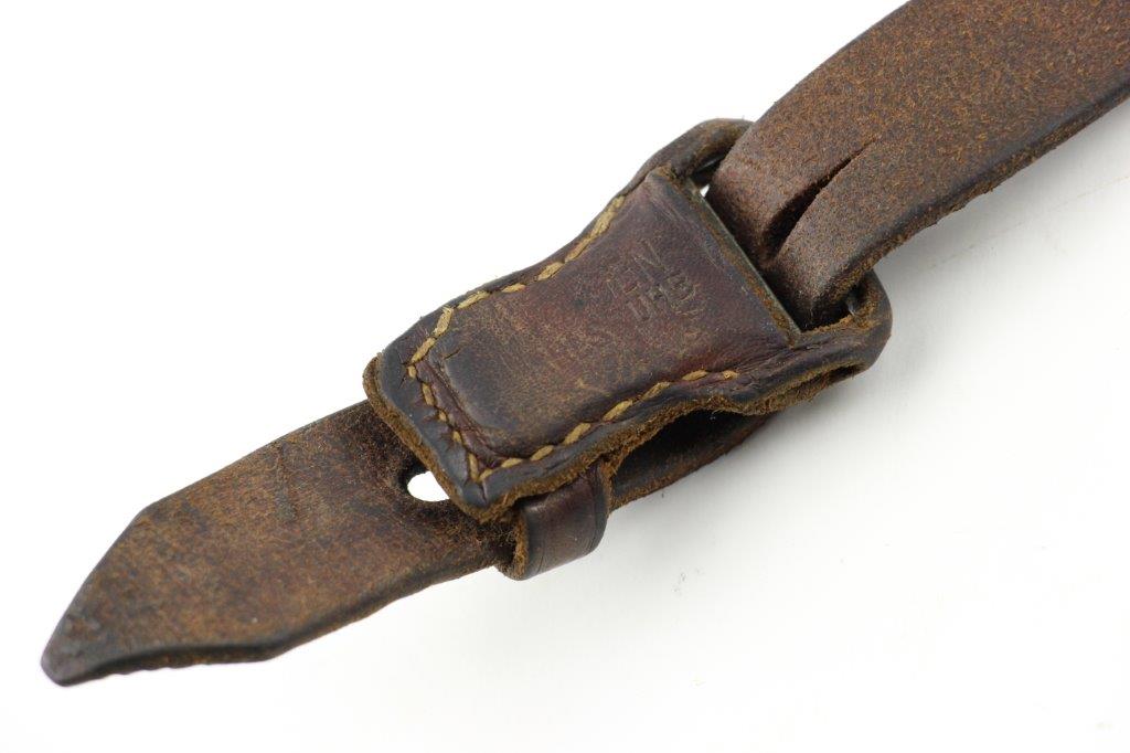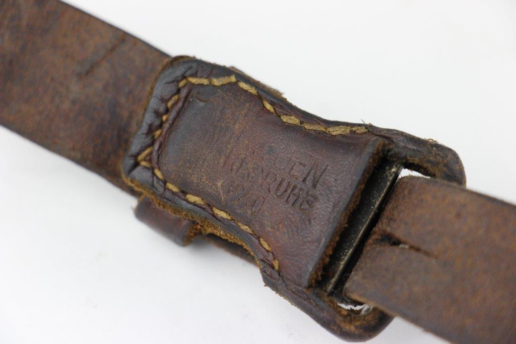 6/13/24 – This is an original WW2 Leather K98 Rifle Sling. The sling comes with an original leather keeper that’s maker stamped and dated 1940. The marking is faint and we can’t decipher the maker name. The leather has normal aging and light use wear, with a dark spot near the metal adjustment end of the sling. Original leather fastening loop and all original stitching throughout.