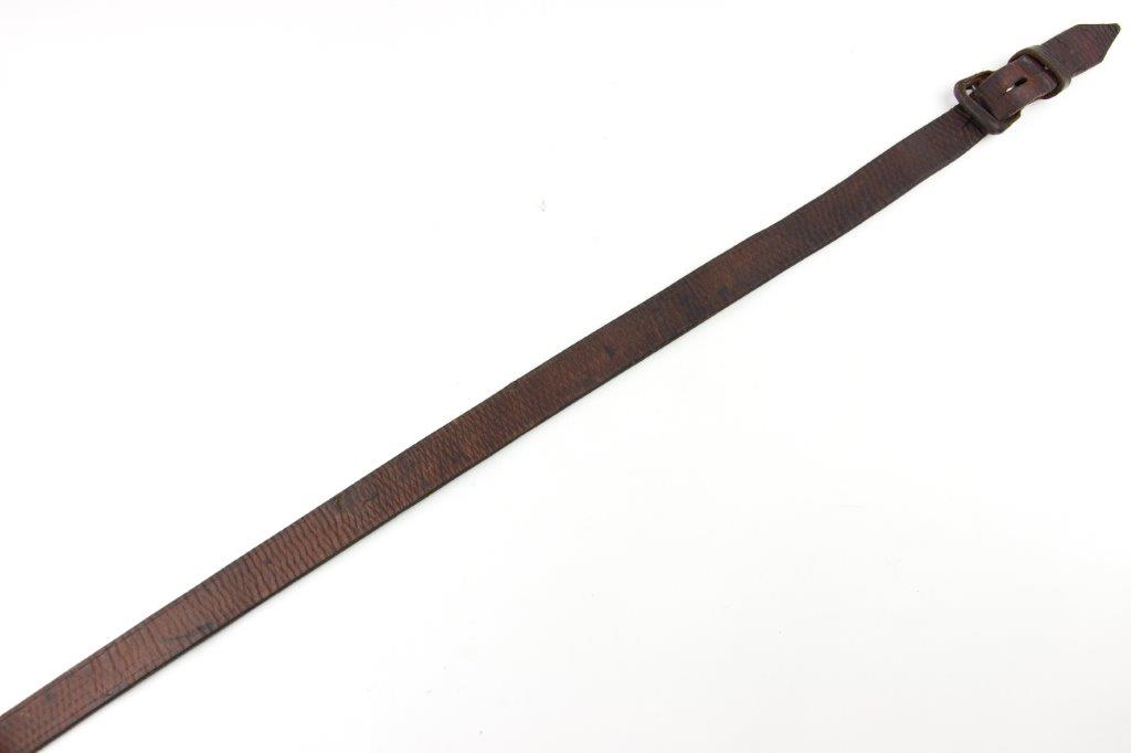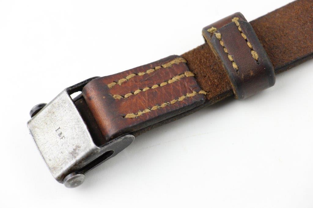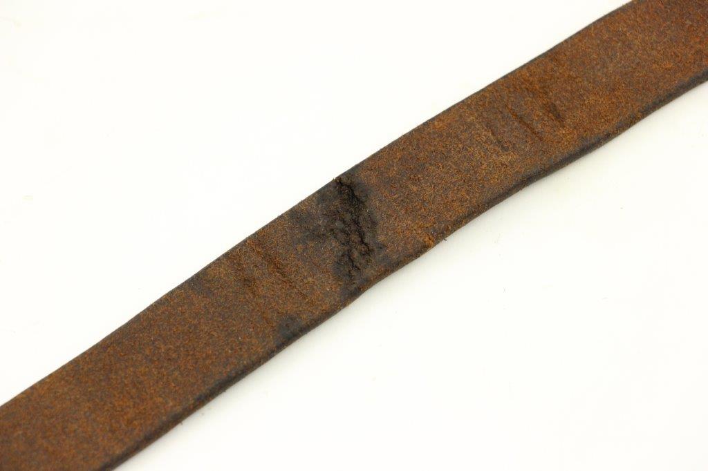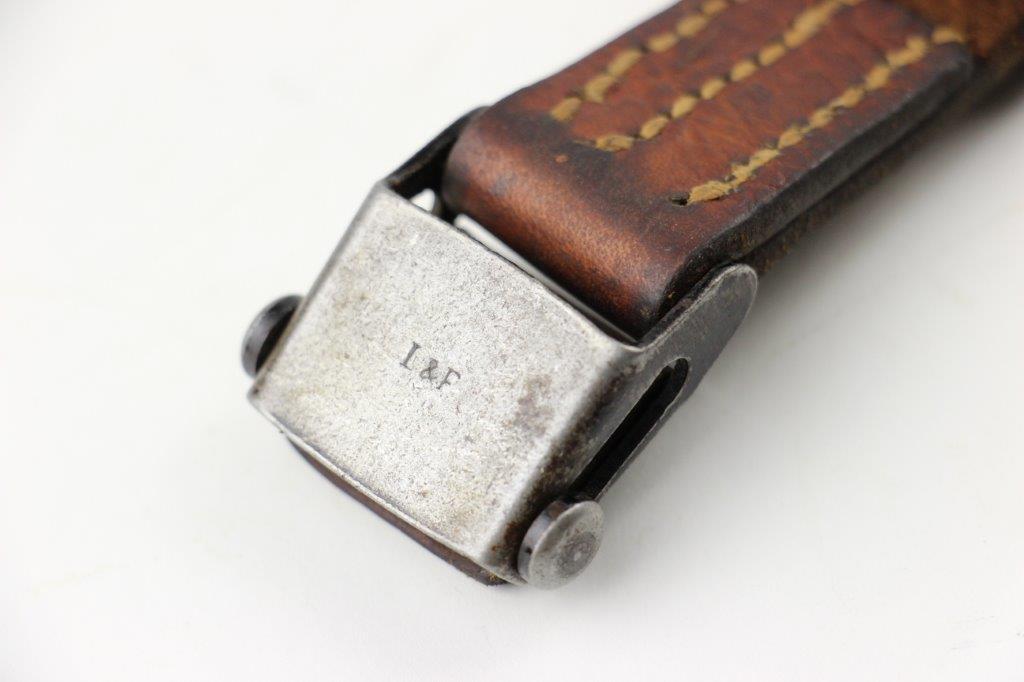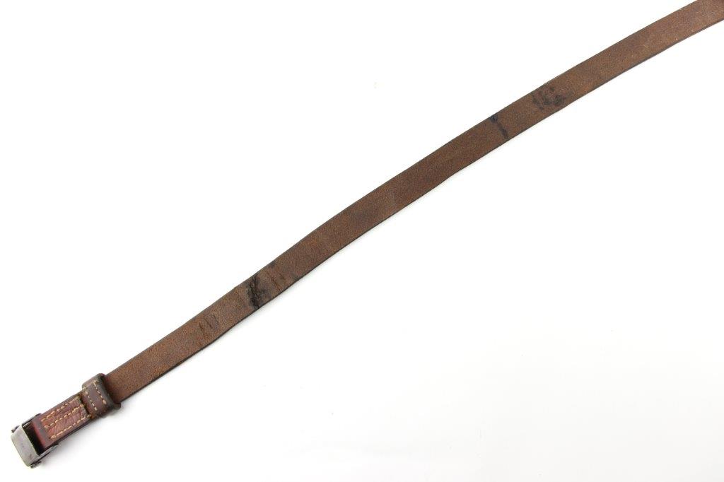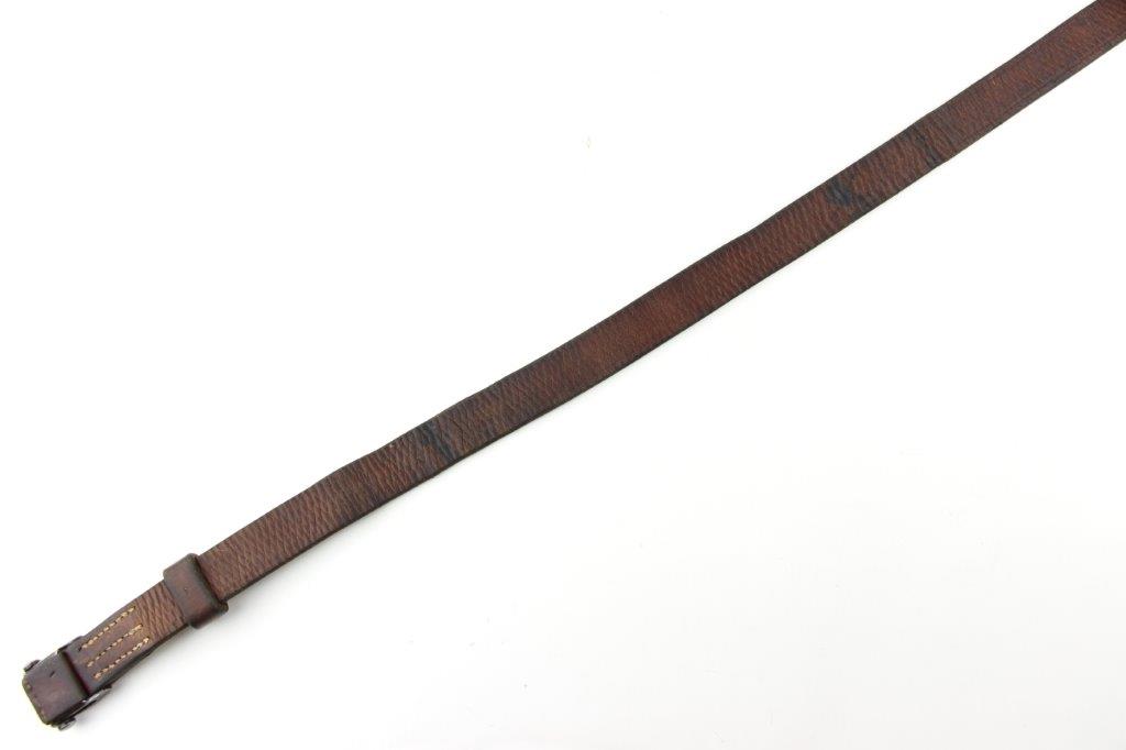 6/13/24 – This is an original WW2 Leather K98 Rifle Sling. The sling comes with an original leather keeper that’s maker stamped and dated 1940. The marking is faint and we can’t decipher the maker name. The leather has normal aging and light use wear, with a dark spot near the metal adjustment end of the sling. Original leather fastening loop and all original stitching throughout.