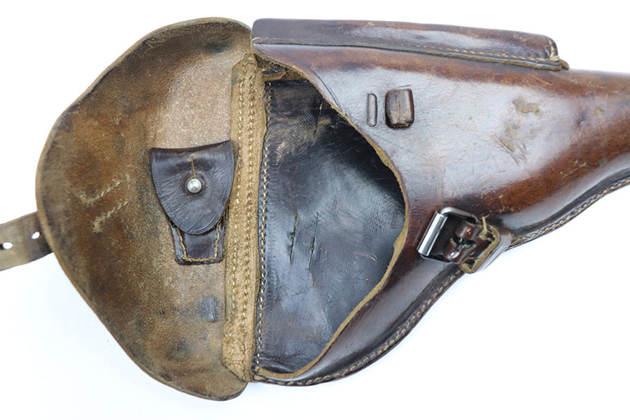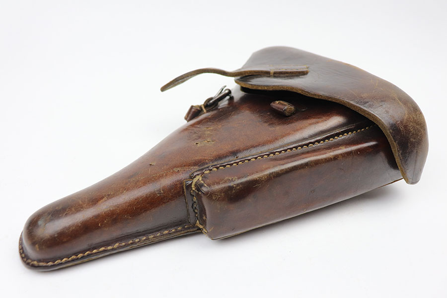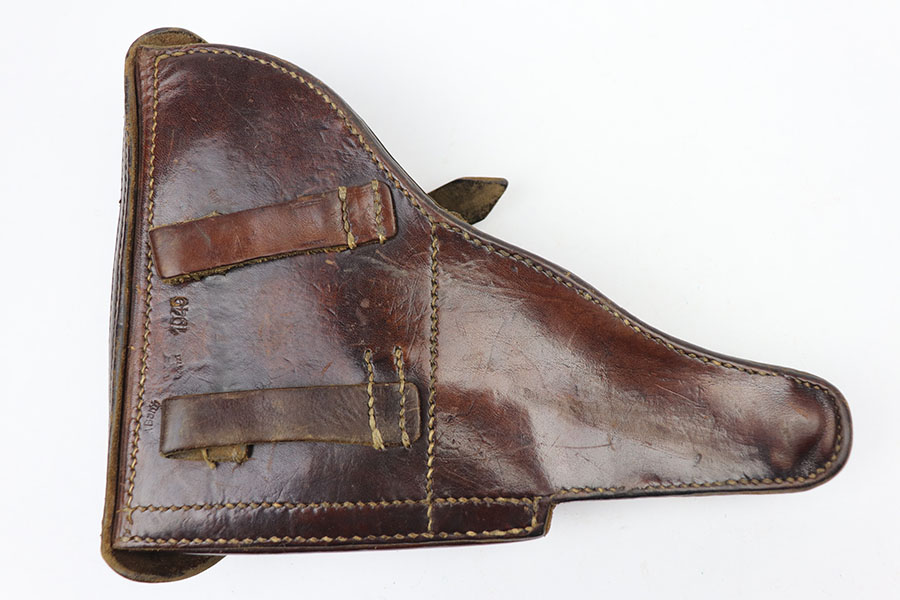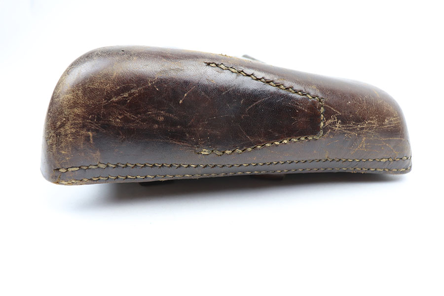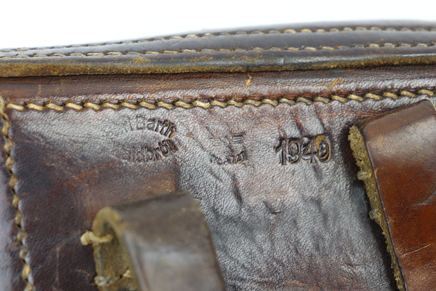 4/23/21 – This is an original 1940 luger holster from WW2. The back of the holster is maker stamped, 1940 dated, and waffen proof stamped. The brown leather has normal pliability and the maker is somewhat hard to decipher but the other stamps are crisp. The leather was likely black at one point but the dye has almost completely worn off. The front leather has been slightly cut down, which is barely noticeable and the price is reduced accordingly.