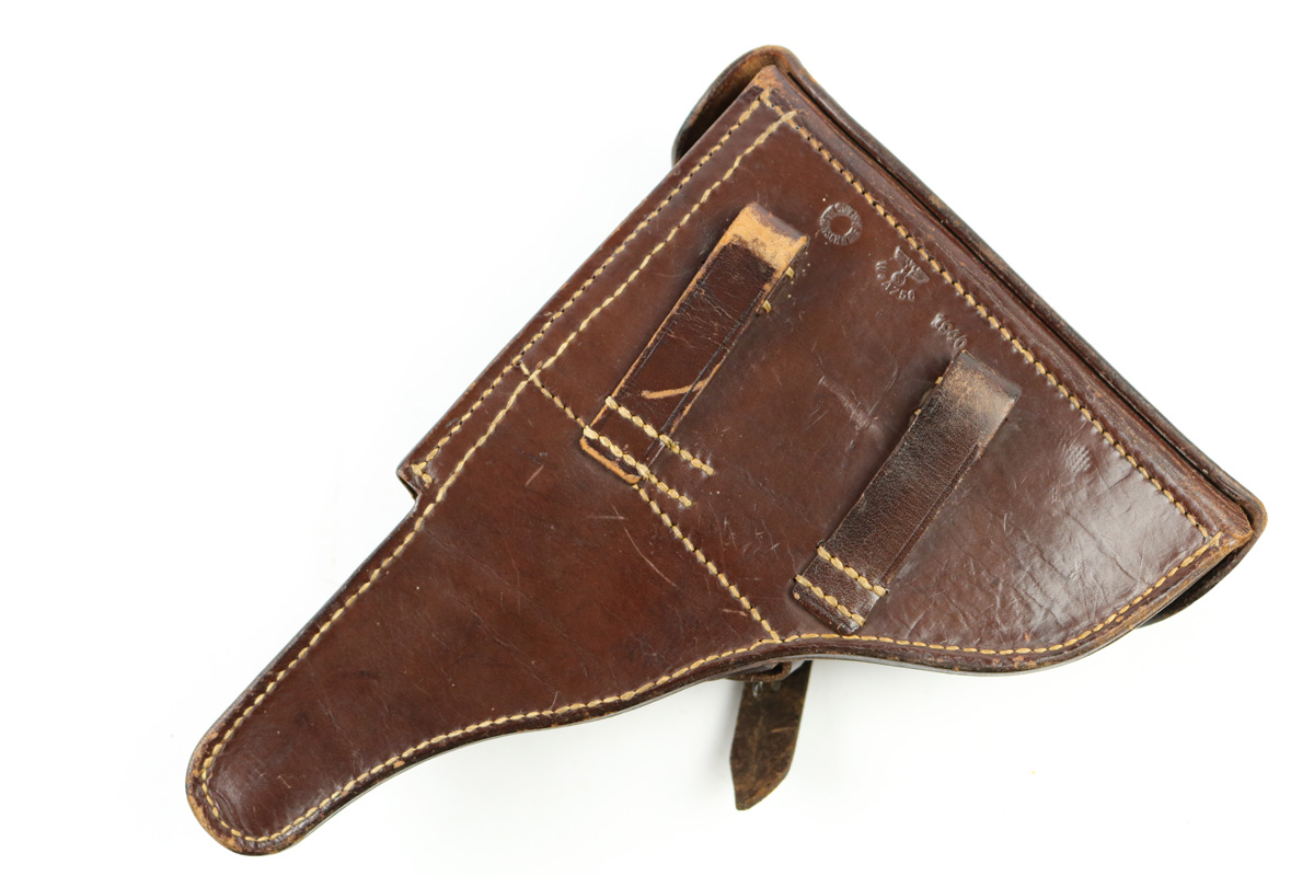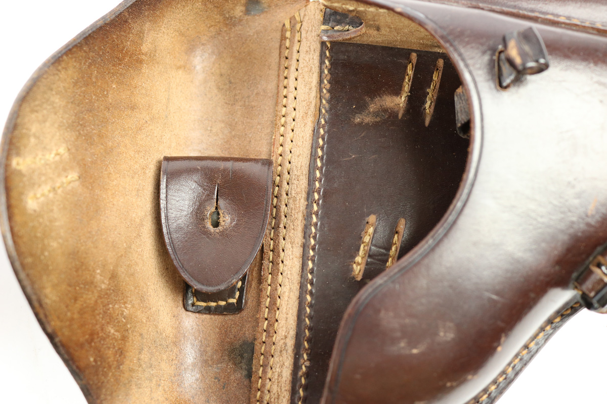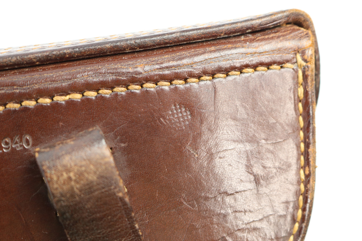 9/27/18 – This is an original 1940 dated Luger holster. The holster is in great condition with strong leather that has minimal pliability. Very great shape and form to the leather. The lid has some surface scuffing as well as wrinkling, but this is cosmetic more than functionally effective wear. The strap has some weakness as well as cracking to the leather, but is completely attached and in tact. The brown leather is more scarce than black – especially for the year of production. The back of the holster is dated and maker stamped by C. Weiss. There’s also a waffen proof stamp. Excellent stitching. Guaranteed original.