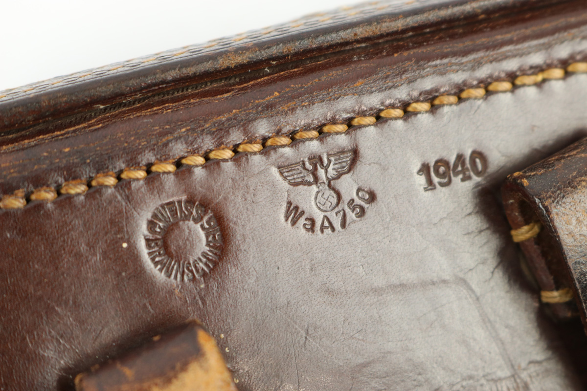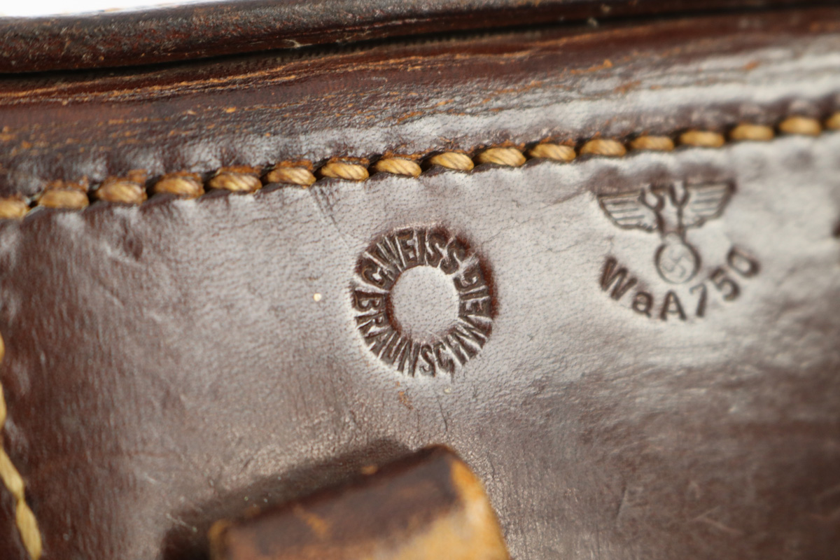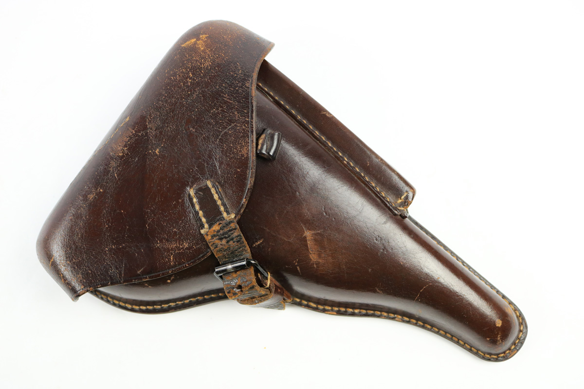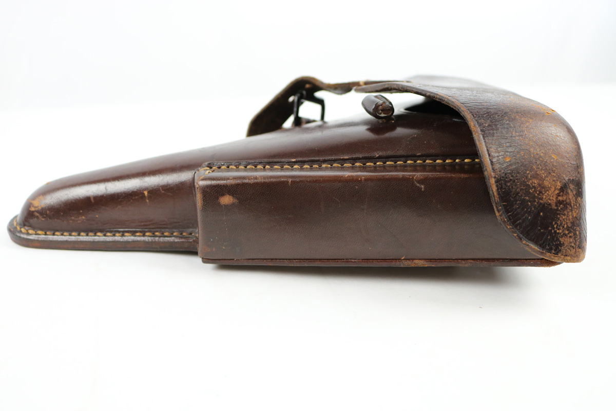 9/27/18 – This is an original 1940 dated Luger holster. The holster is in great condition with strong leather that has minimal pliability. Very great shape and form to the leather. The lid has some surface scuffing as well as wrinkling, but this is cosmetic more than functionally effective wear. The strap has some weakness as well as cracking to the leather, but is completely attached and in tact. The brown leather is more scarce than black – especially for the year of production. The back of the holster is dated and maker stamped by C. Weiss. There’s also a waffen proof stamp. Excellent stitching. Guaranteed original.