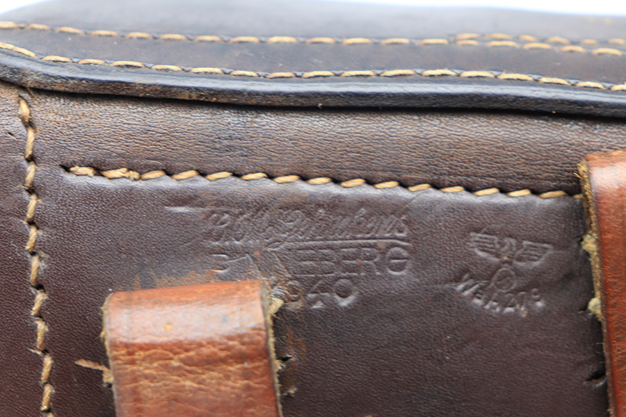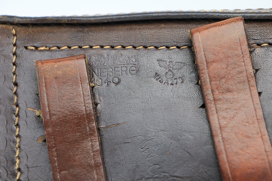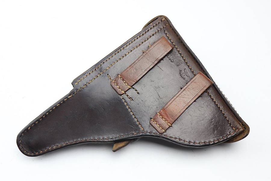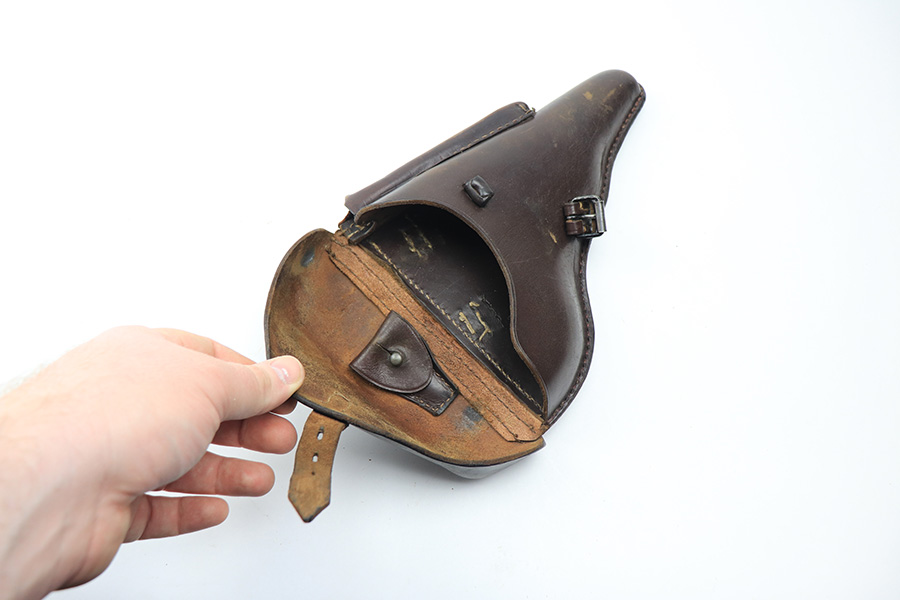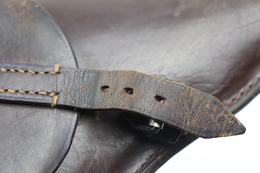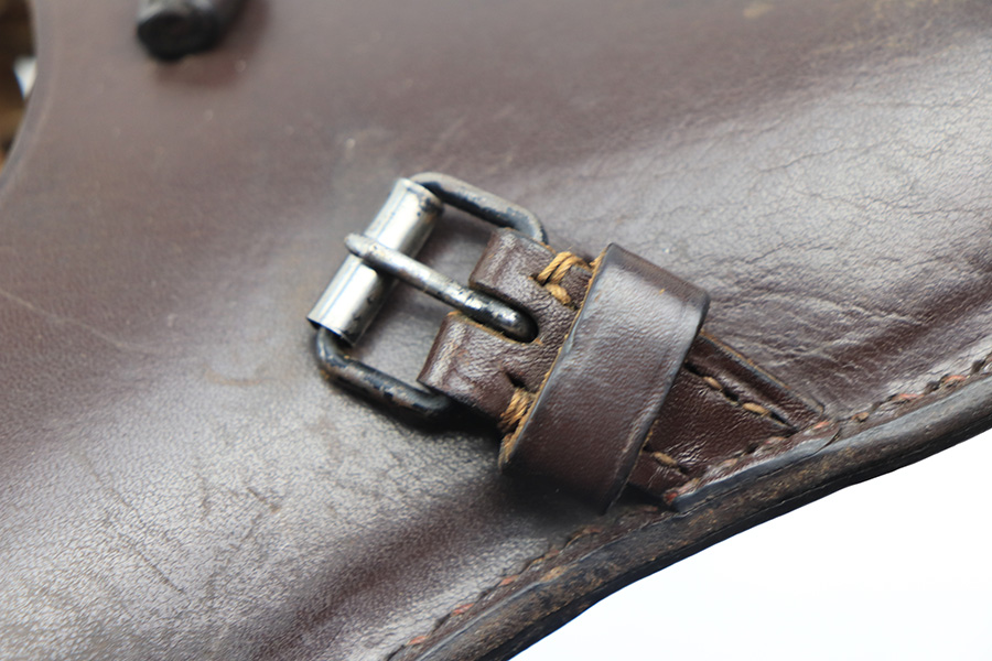 1/18/22 – This is an original 1940 dated Luger holster. The holster has great chocolate brown leather and excellent, all original stitching in tact. The leather shows some surface scuss and discoloration but these are generally mild. Overall the leather has normal pliability. The back leather is maker stamped, “C. Mo. Gehrekens”, is 1940 date stamped, and waffen proof stamped. Fairly clean interior leather.