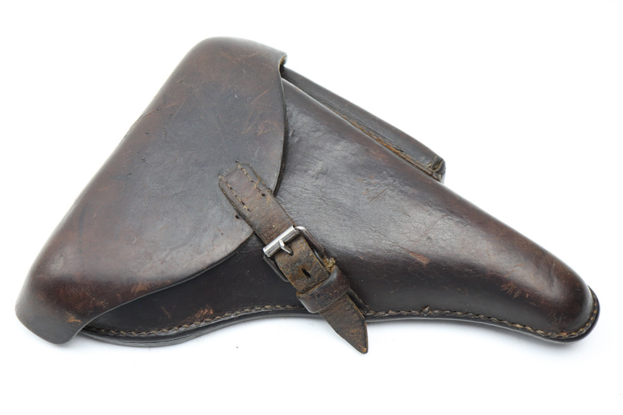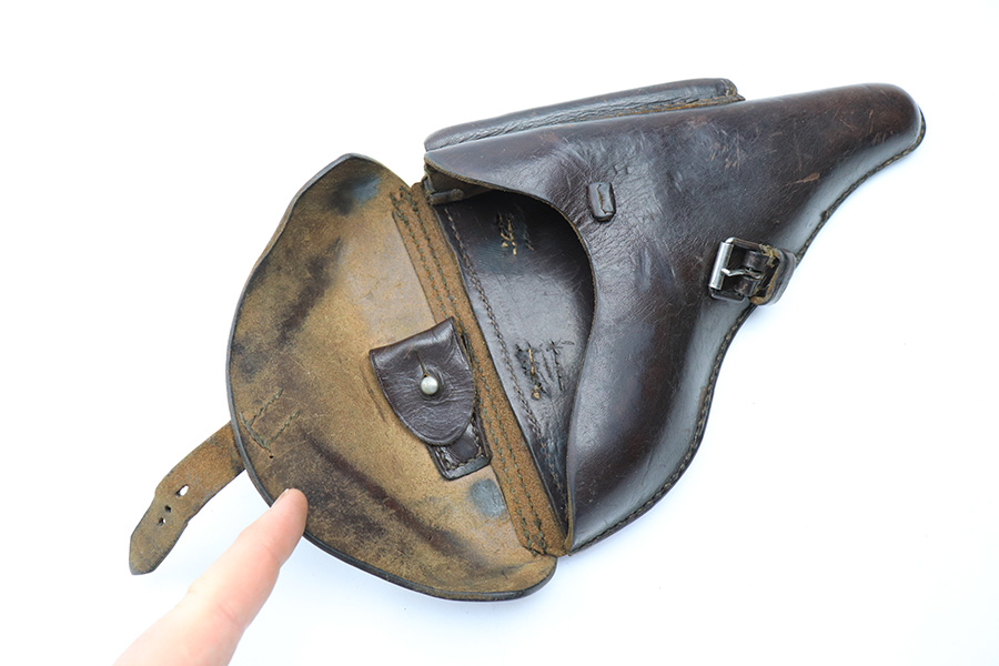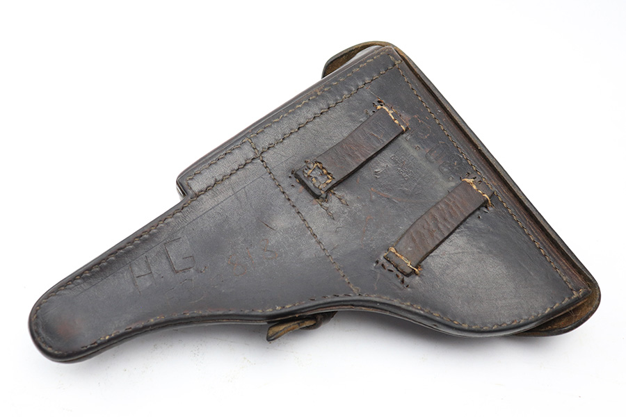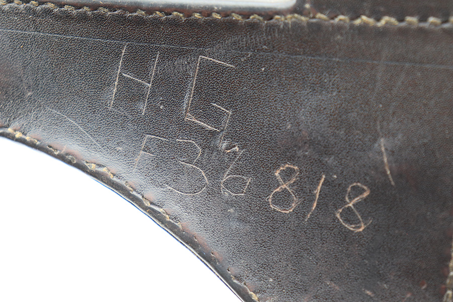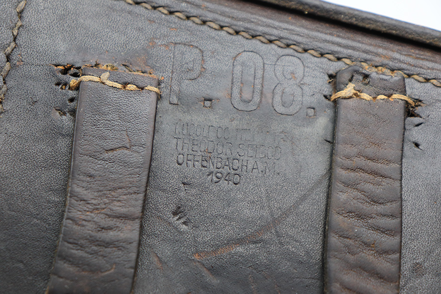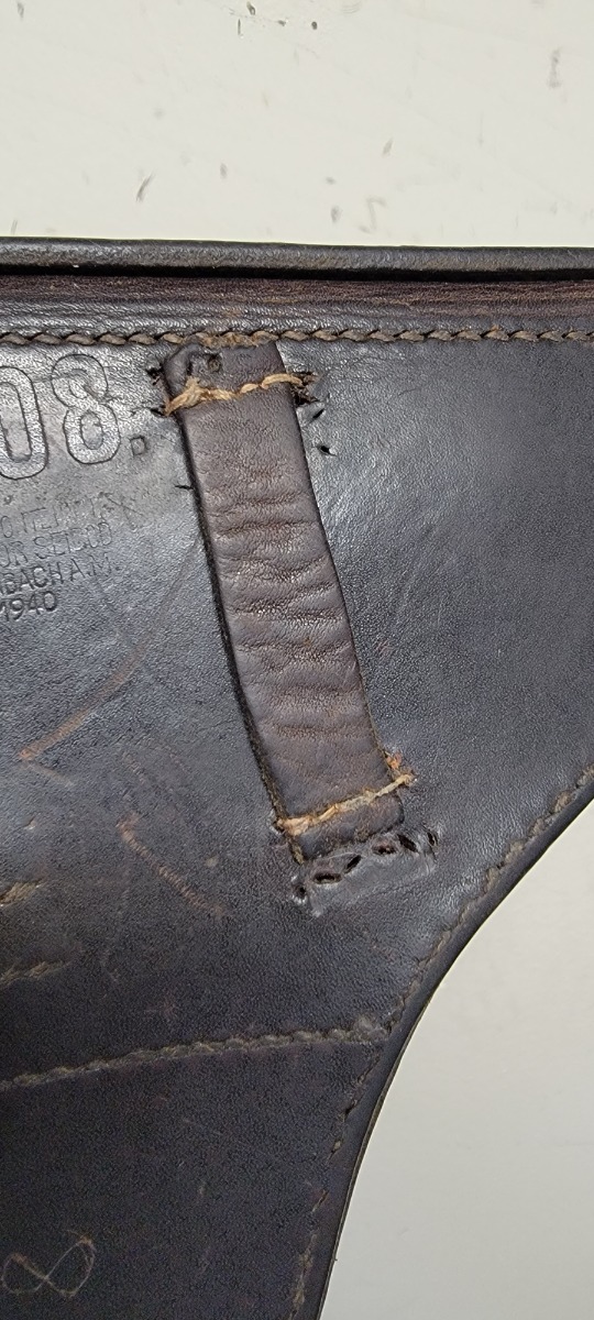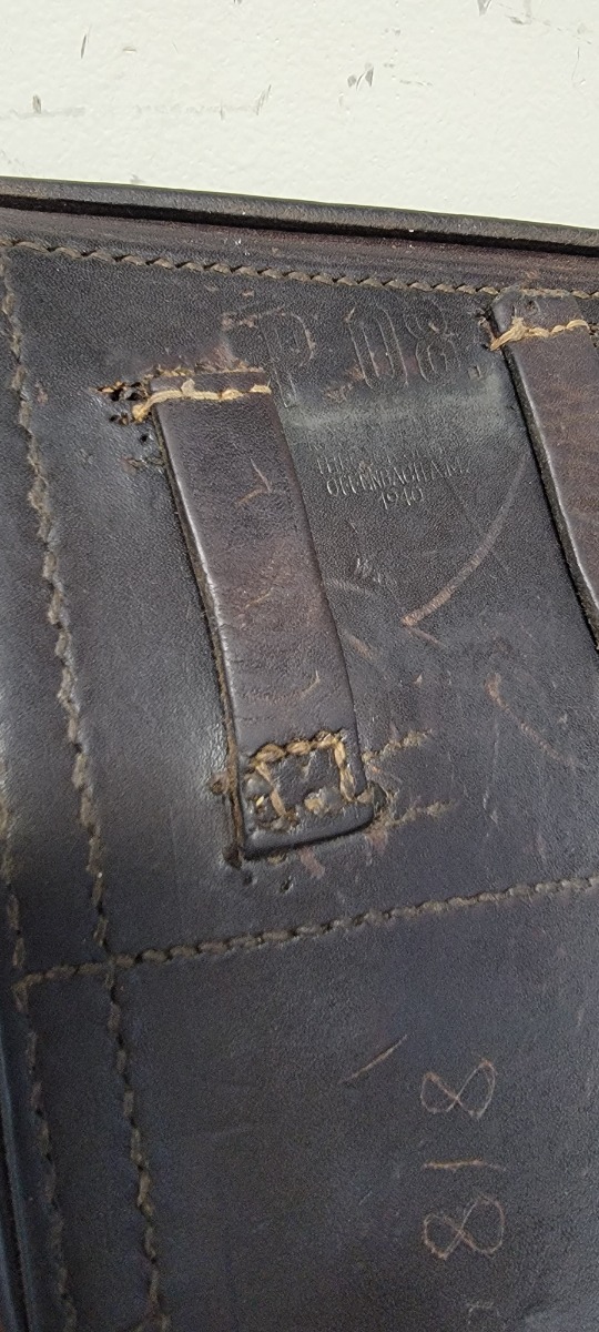 5/24/22 – This is an original 1940 dated Luger holster from WW2. The back leather is maker stamped, dated, P.08 stamped, and has a very faint remnant of a waffen military proof stamp. The back toe of leather has some surface scratching as shown. The back belt loops have been modified and re-stitched as well. The rest of the holster is without issue. The leather has normal pliability and typical signs of aging.