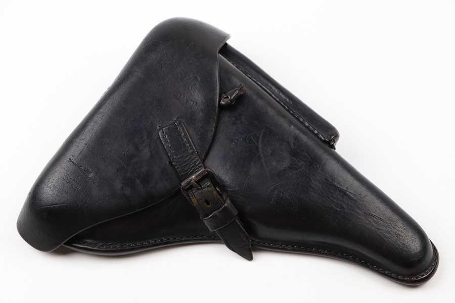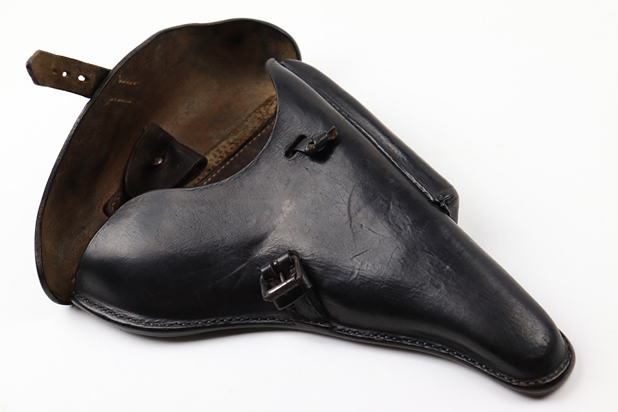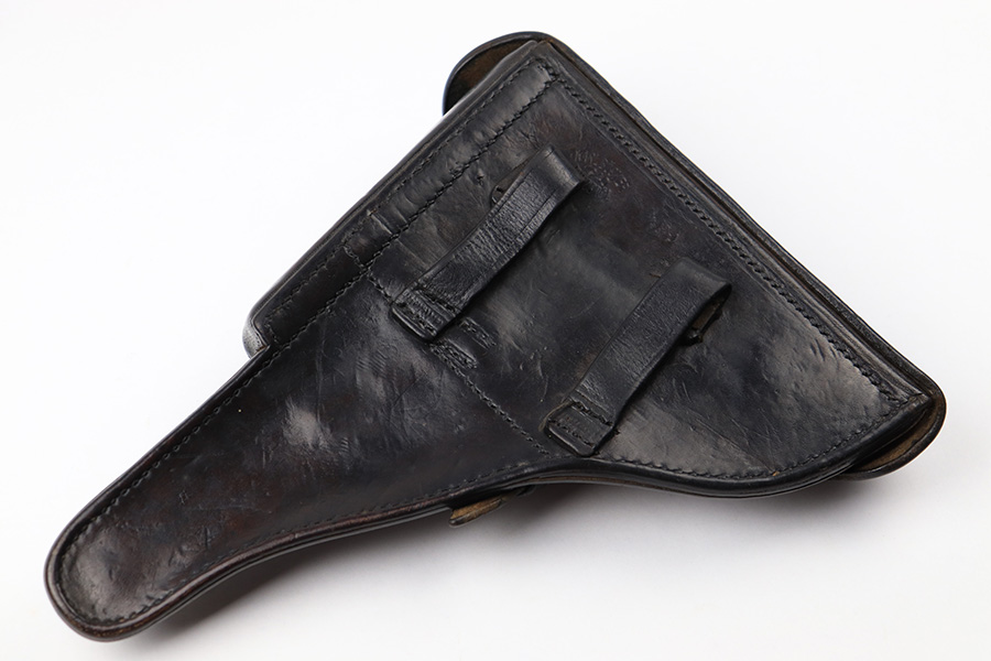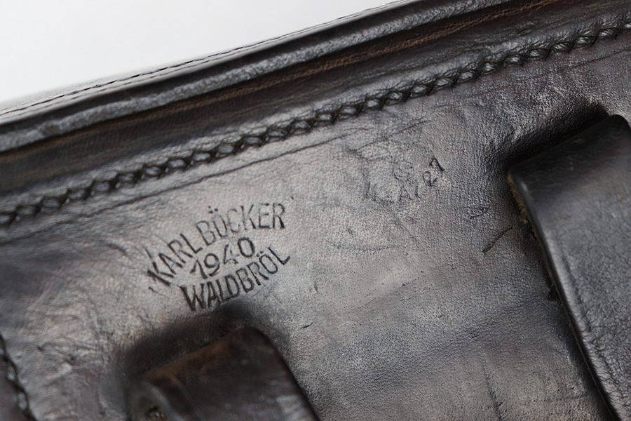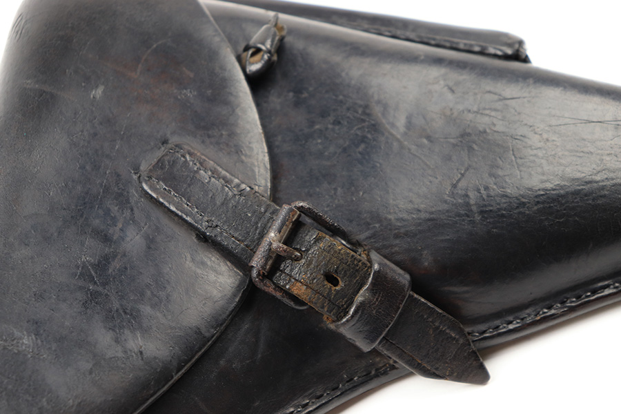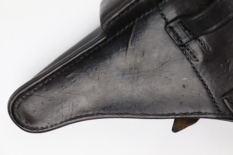 7/15/22 – This is an original 1940 dated Luger holster from WW2. The holster is in very good overall condition with all original leather and stitching. The leather has normal pliability and typical signs of aging throughout. The leather has some surface scratches and scuffs on the exterior, but none of these go deep into the leather. The interior leather shows signs of previous use. The back leather is maker stamped, dated, and waffen military proof stamped. The stitching is in good condition with no notable issues.
