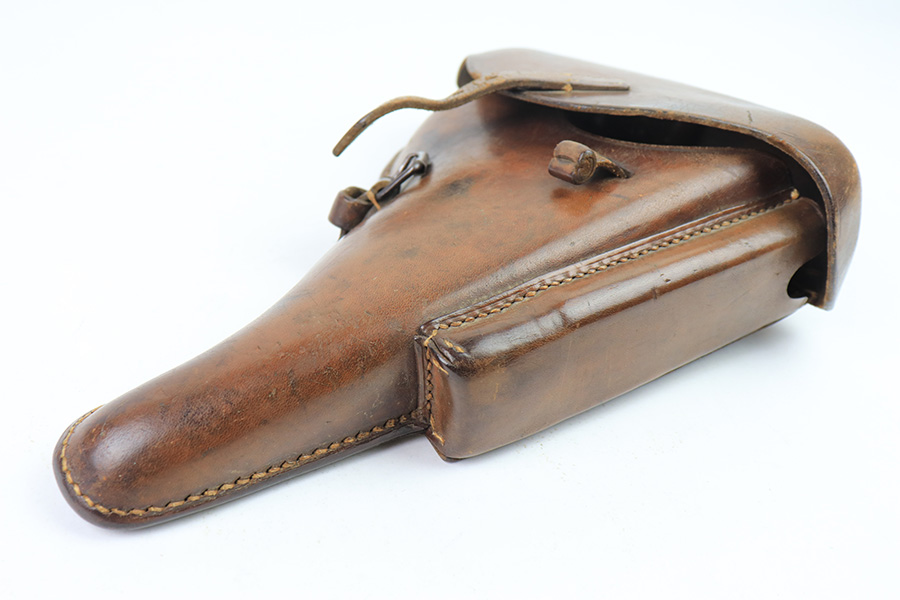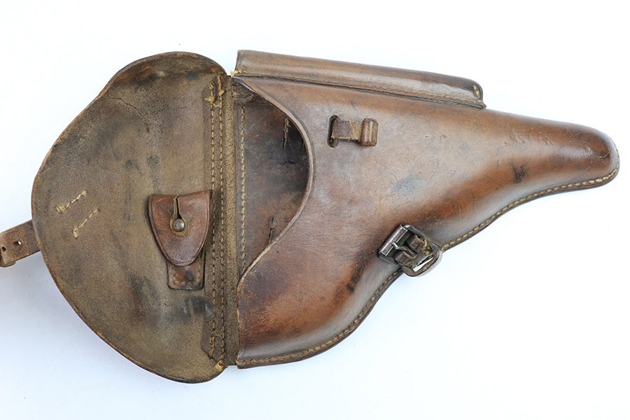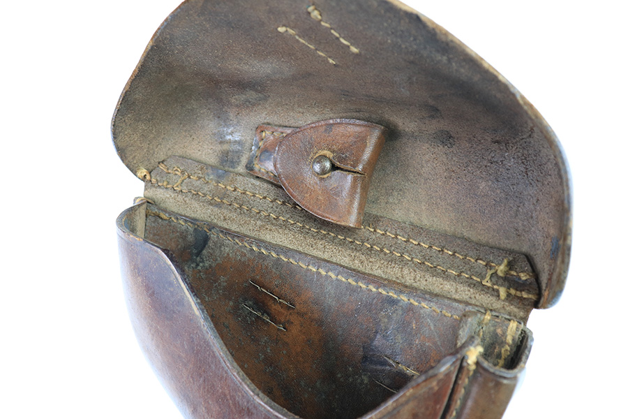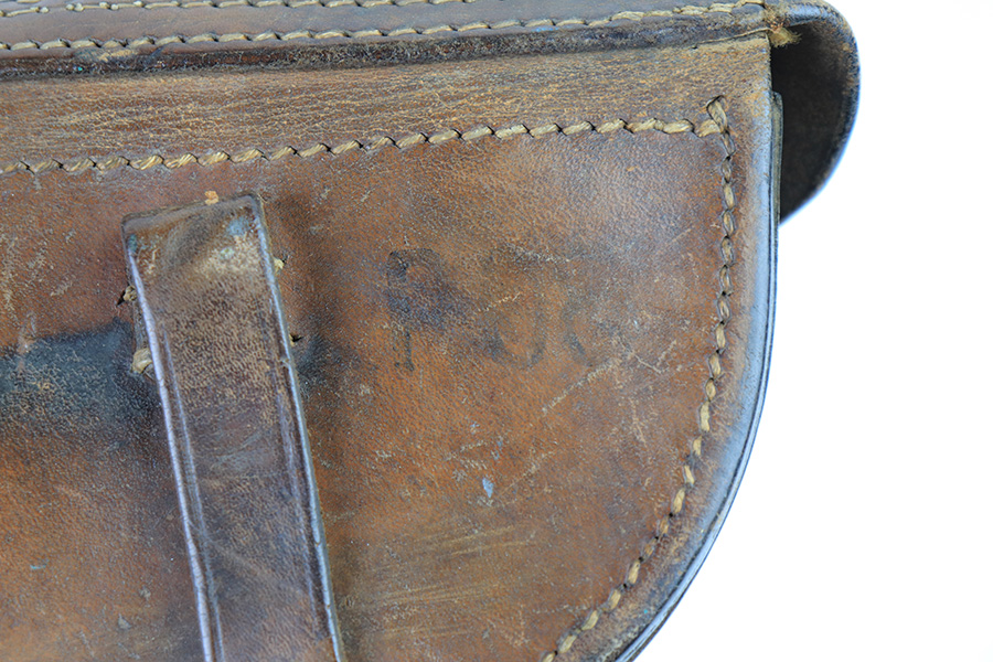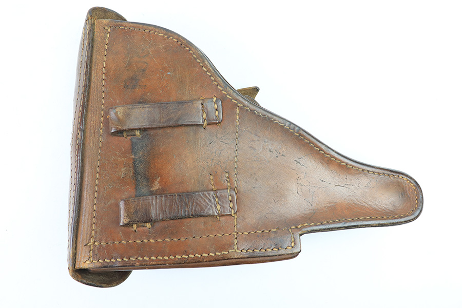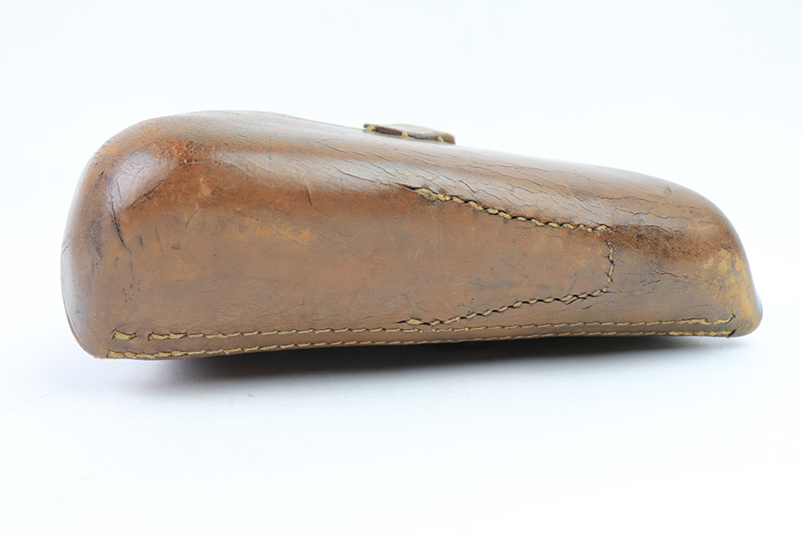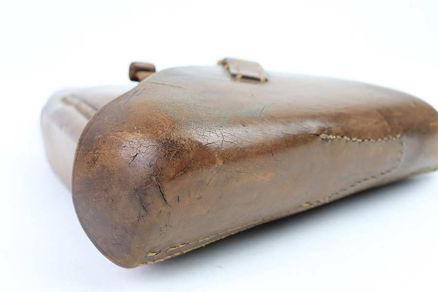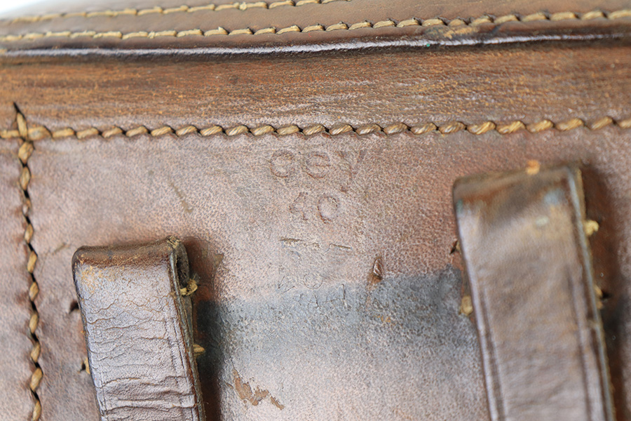 12/27/22 – This is an original 1940 dated Luger holster from WW2. The holster is in great overall condition with very nice leather and stitching that’s all original. The back leather is maker stamped and dated “cey 40” with a waffen stamp underneath. There’s also a P.08 stamp to the right of the belt loops. The stamps are faint and partially faded with age, but still visible. The leather has mild pliability and some surface scuffing. The top leather and closure strap has surface wrinkling and aging from use. The interior leather shows mild use wear as well. No notable stitching issues.