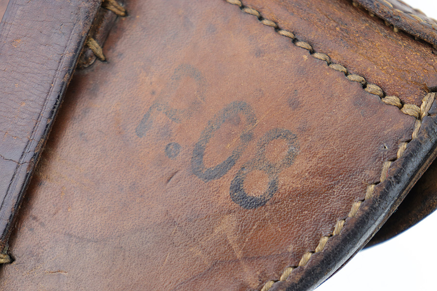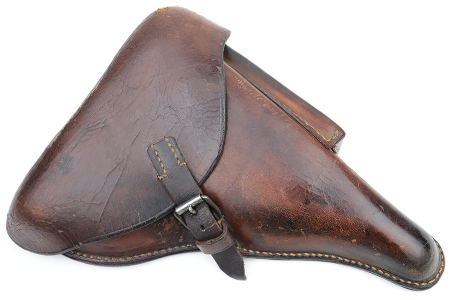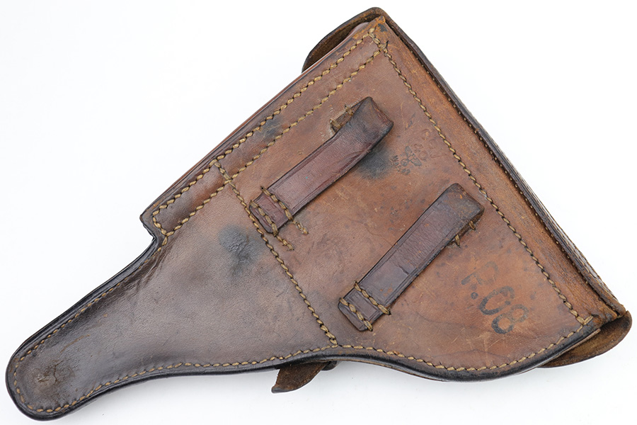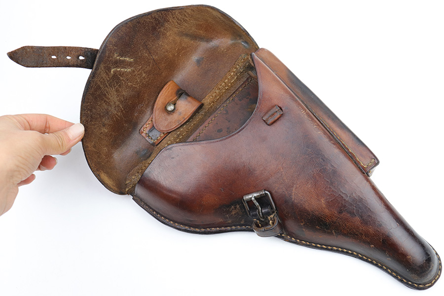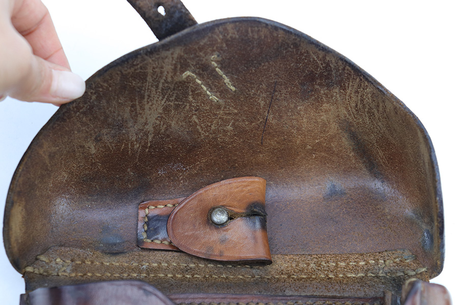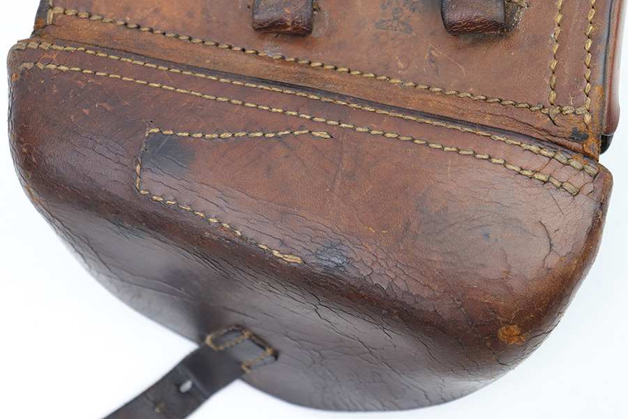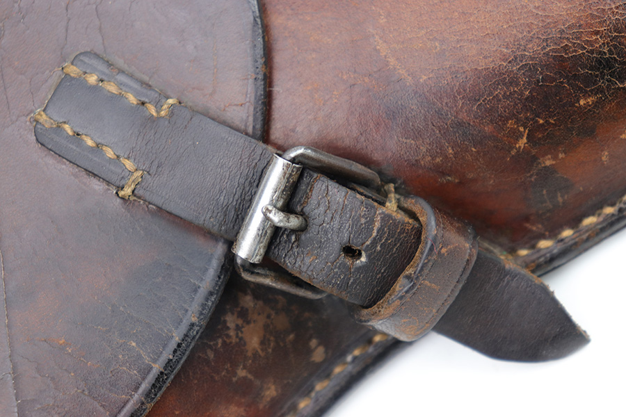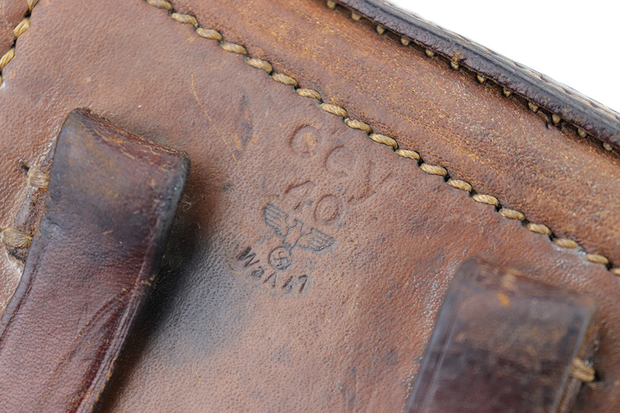 3/8/23 – This is an original 1940 dated Luger holster from WW2. The holster was likely dyed black originally, but most of the black finish has worn off with age. The back leather shows a “cey” maker code, 40 date stamp, waffen eagle proof stamp, and P.08 stamp. The leather has some mild surface scuffing and some wrinkling on the front leather, as well as surface cracking on the front-lid leather and closure strap. The leather is still completely intact however with normal pliability. No notable stitching flaws and all original stitching.