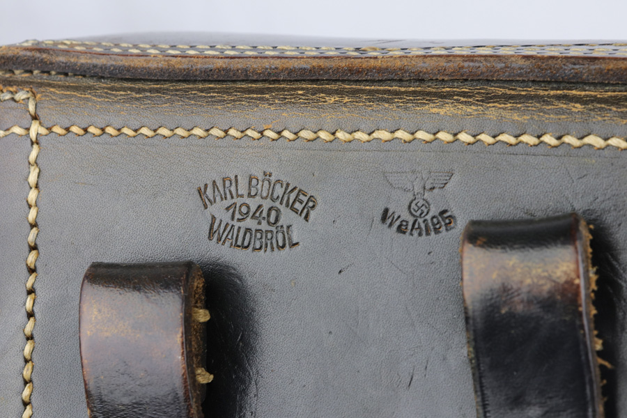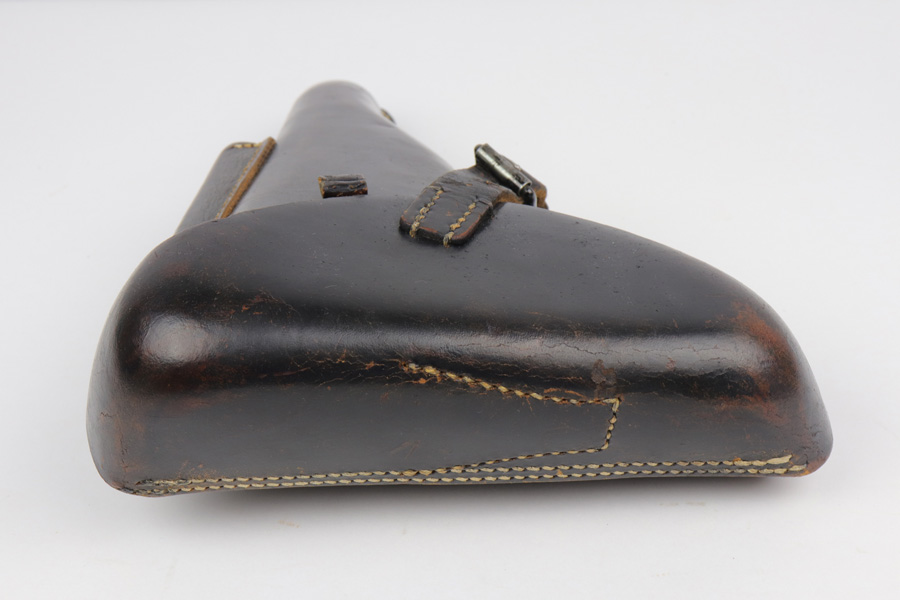 5/22/19 – This is an original 1940 dated Luger holster from WWII. The holster is in excellent overall condition with all original leather and stitching. The back leather is stamped with a crisp maker stamp and date, along with a waffen military proof stamp. The leather is strong and firm with clean interior leather. No missing stitches. The only notable flaw is some surface cracking on the closure strap. This is not excessive cracking though and the strap is not in jeopardy of breaking (cracking isn’t deep).