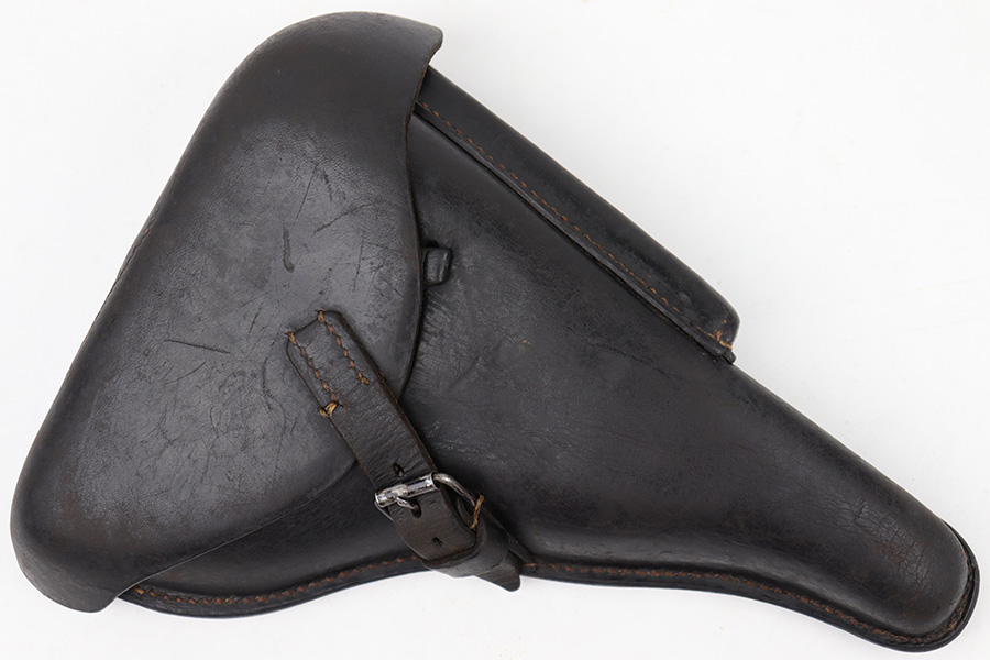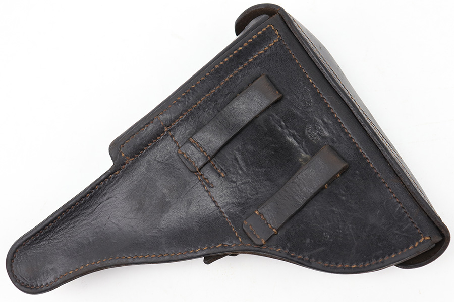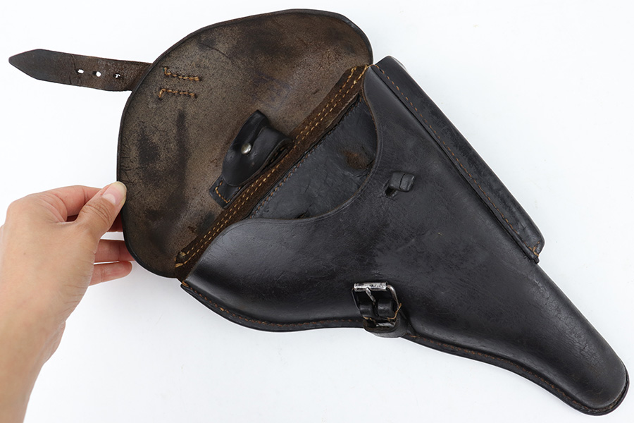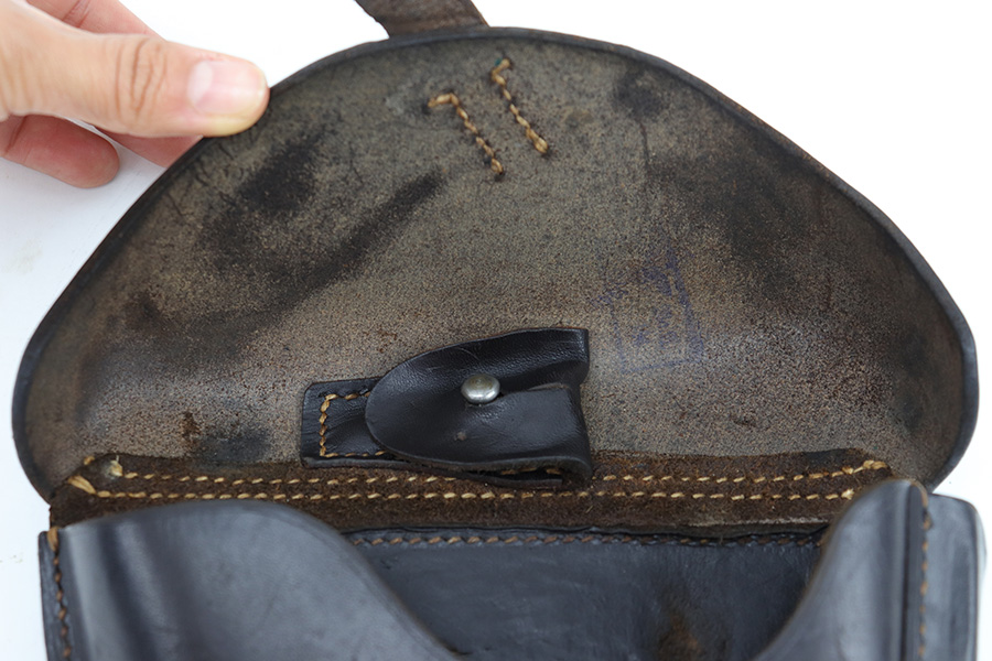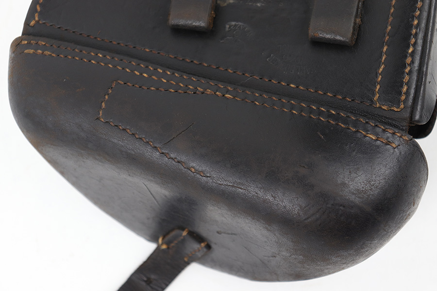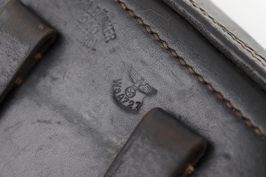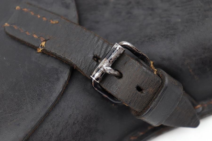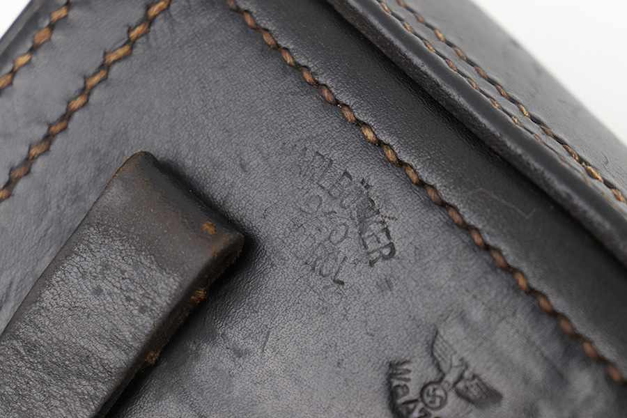 5/2/23 – This is an original 1940 dated Luger holster from WW2. The holster has soft, pliable leather that shows mild surface wrinkling and general use wear and aging throughout the leather. There’s some mild surface cracking near the front toe of leather, but this doesn’t go deep into the leather. No notable issues on the internal leather and an intact lift strap. All stitching is original, tight and intact. The back leather is maker stamped, date stamped, and waffen military proof stamped.