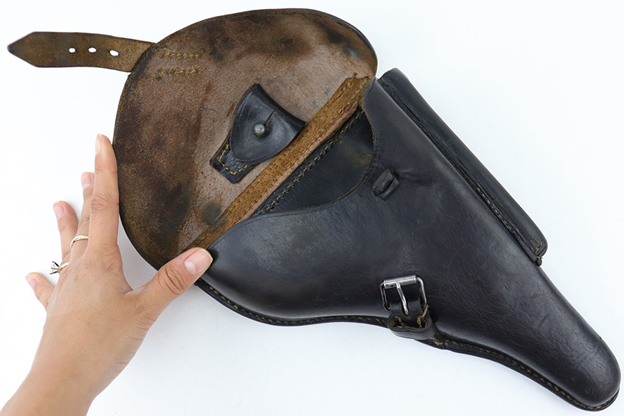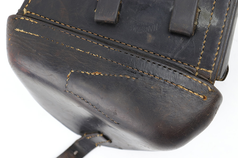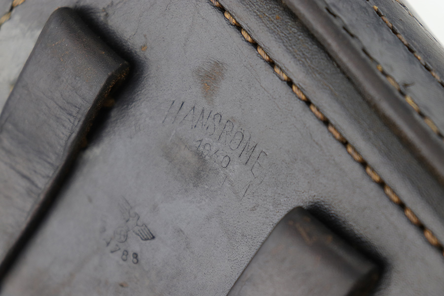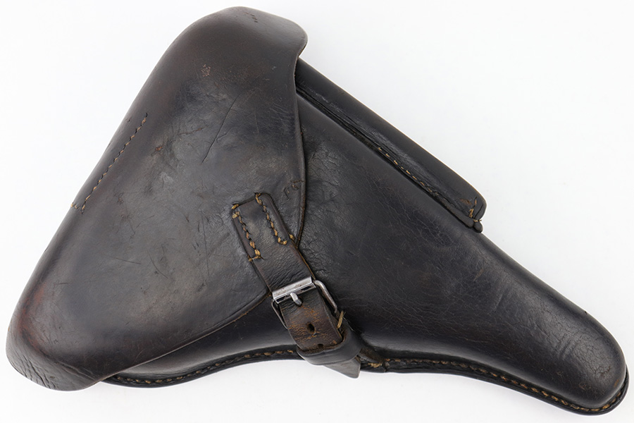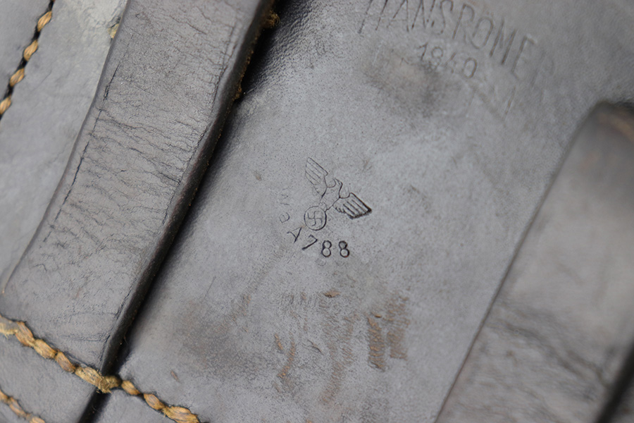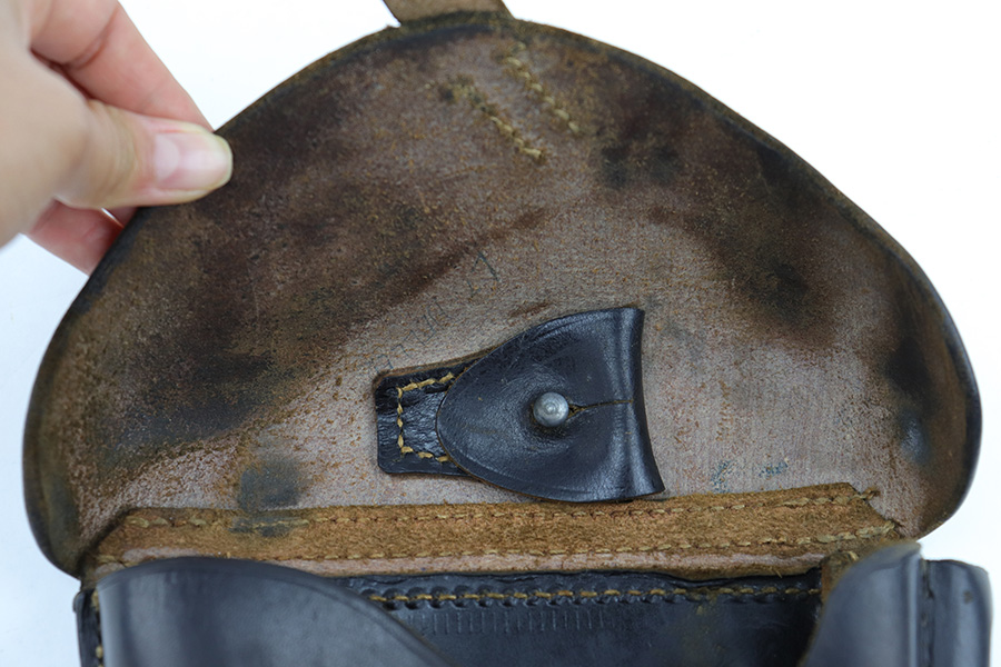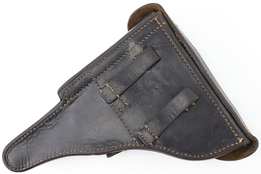 7/6/23 – This is an original 1940 dated Luger holster from WW2. The holster is maker stamped with a 1940 date, and waffen military proof stamped. The holster has soft, pliable leather that shows aging and mild use wear throughout. The interior leather has a few mild stains but no major issues. The stitching is all original and present, but there are a few loose stitches at the top leather. This doesn’t affect functionality and the holster is still completely intact.