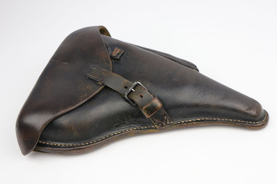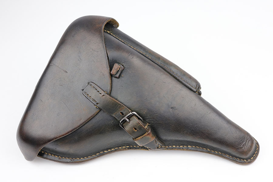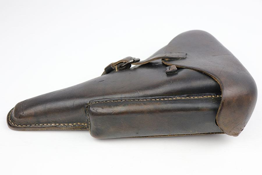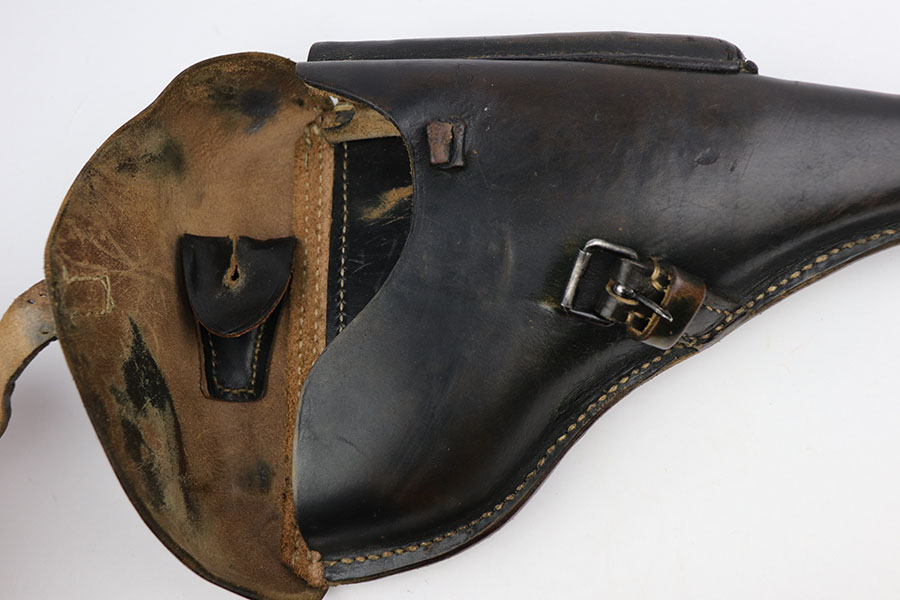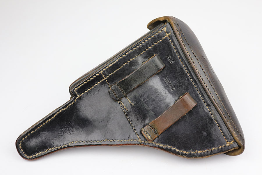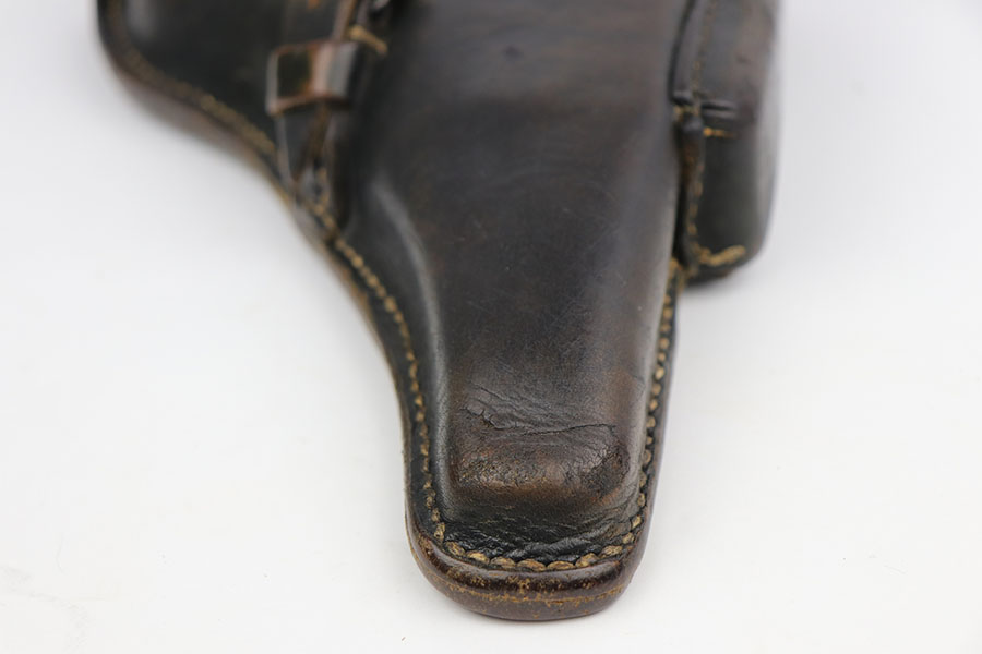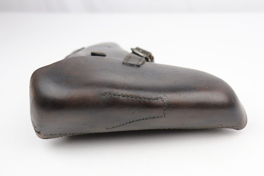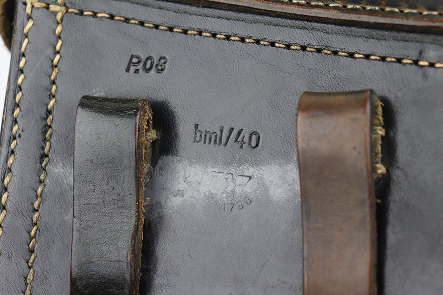 10/28/19 – This is an original 1940 date Luger holster made during WW2. The holster is maker stamped, dated, and waffen proofed on the back leather. The leather is fairly clean with typical pliability. The back leather has some wear from previously being attached to a belt. All leather and stitching in tact and original. A nice, straight forward Luger holster.