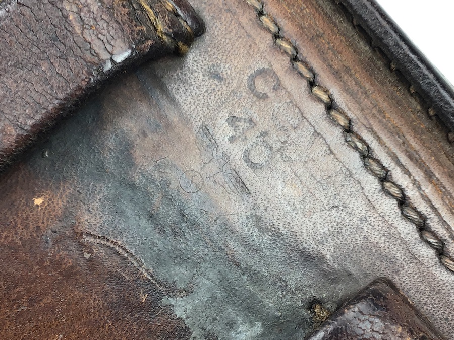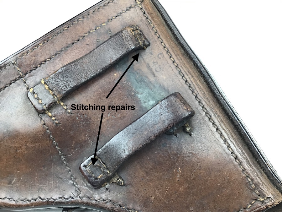 4/17/20 – This is an original and very good condition 1940 Luger holster from early WW2. The holster has very nice brown leather that is pliable and shows minimal wear. Overall the leather is clean. All original stitching is tight and in tact, except for 2 repairs on the belt loops, as seen in the photos. The rear is waffen eagle proof stamped WaA47?. It is faint, but visible. Maker marked “cey”, and dated 1940. Clean interior and secure lift strap. All original and authentic.