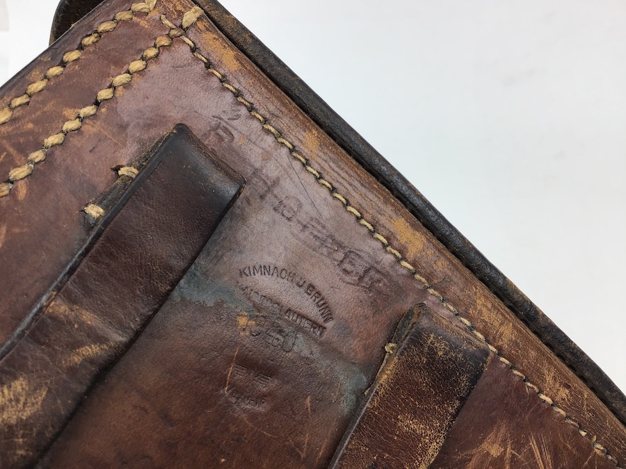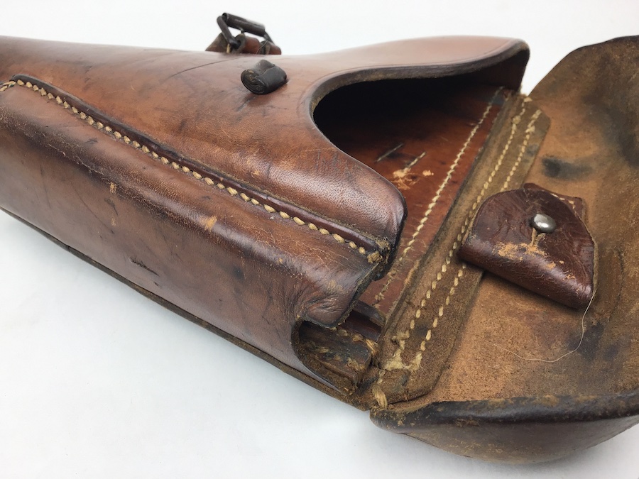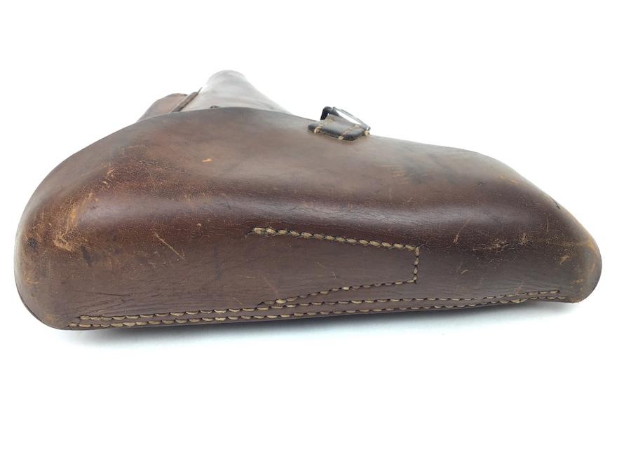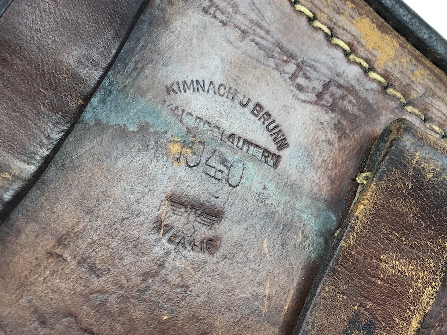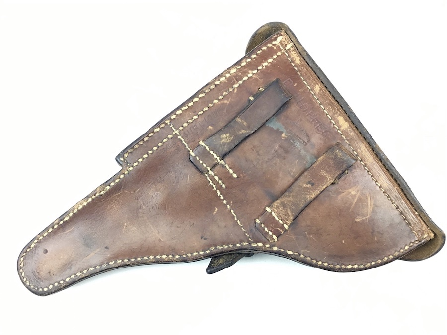 4/28/20 – This is a very good, original WW2 production Luger holster. The holster has clean brown leather. There is minor use wear, but it is fully intact with original stitching. The back of the holster is 1940 dated with a “Kimnach U Brunn” maker stamp. There’s also a “WaA416” waffen proof.  It was personalized above the belt loops, as well as the back. Guaranteed original and authentic.